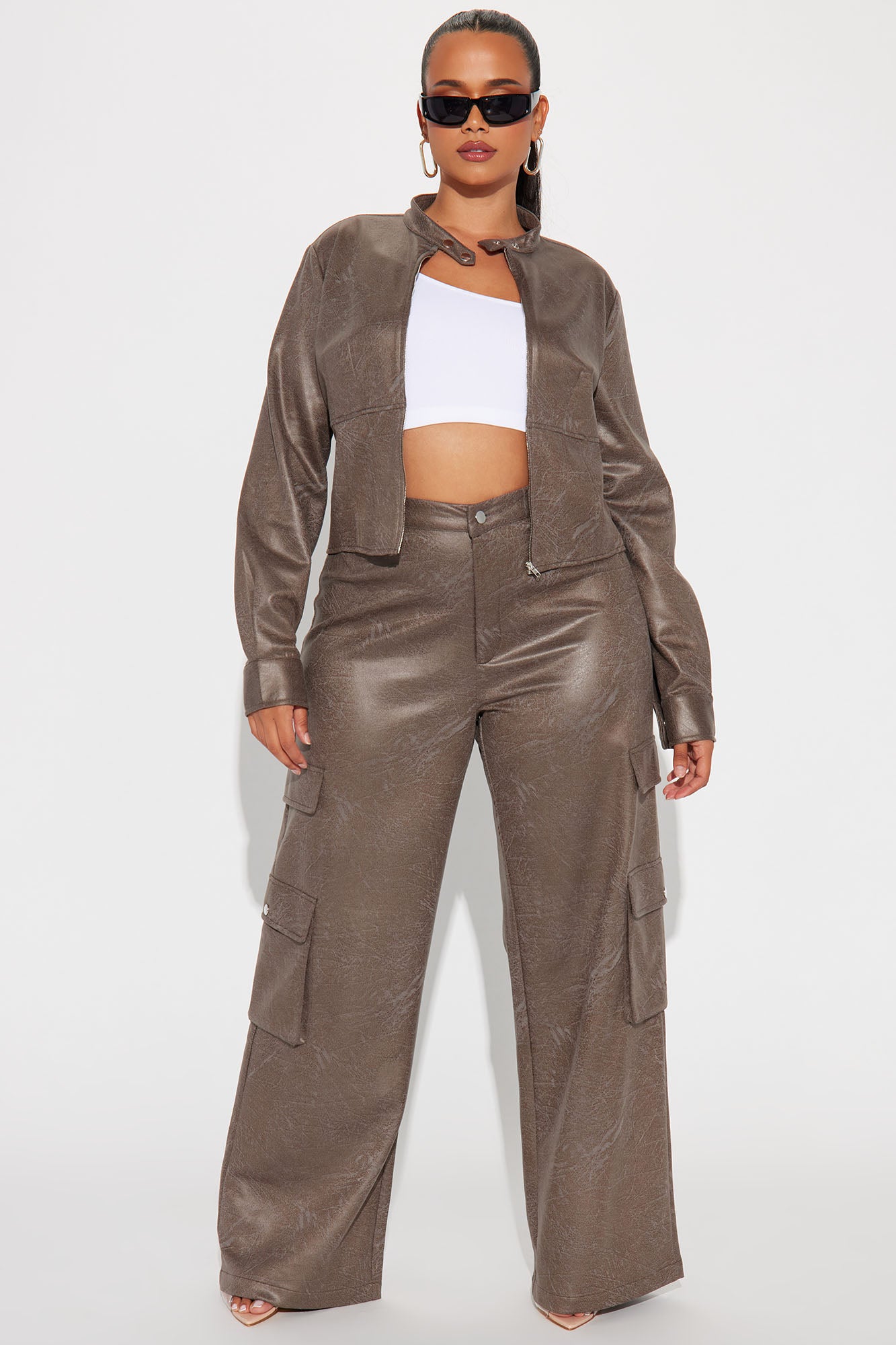 Available In Olive. Faux Suede Pant Set High Neck Long Sleeve Front Zipper Wide Leg Pant Cargo Pockets Back Pockets Non-Stretch Inseam: 32" Disclaimer: Due To The Wash Process Each Garment Is Unique. Shell: 94% Polyester 6% Spandex Imported |