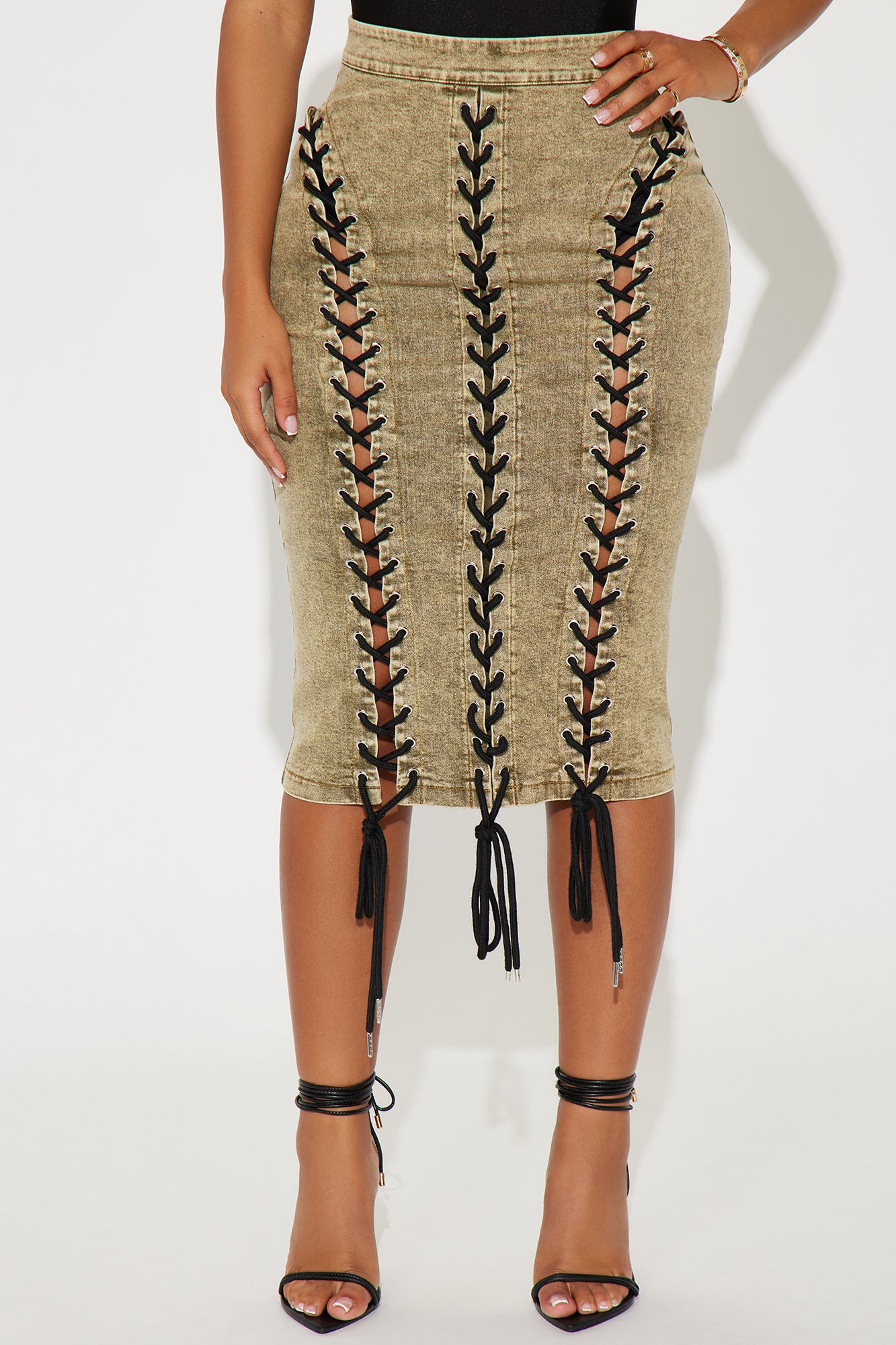 Available In Olive. Midi Skirt High Rise Lace Up Detail Back Zip Closure Mineral Wash Stretch Due To The Specialized Wash, Each Garment Is Unique. 97% Cotton 3% Spandex Imported |