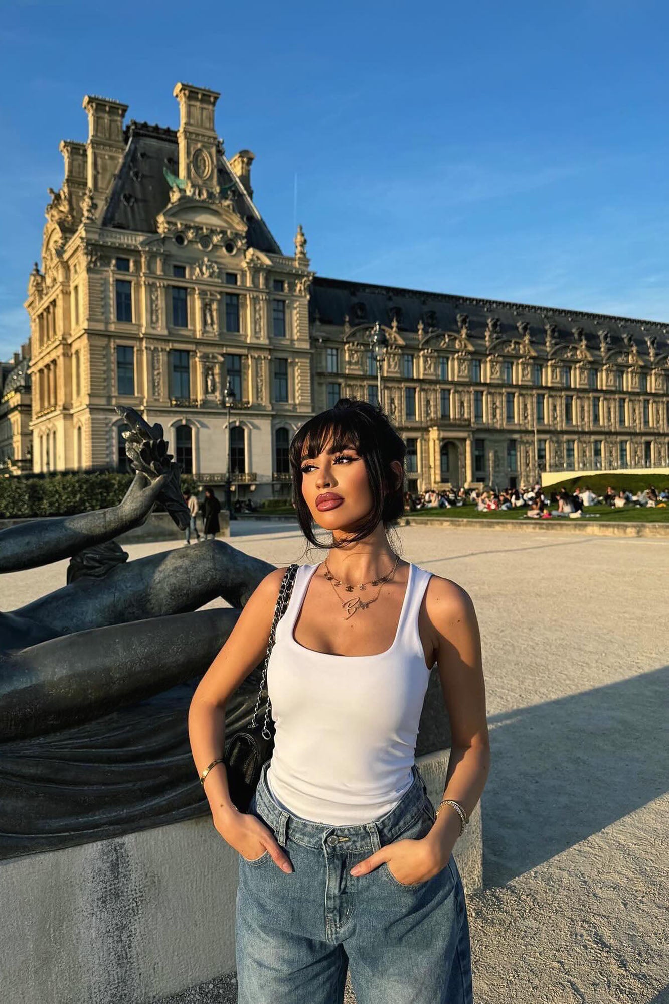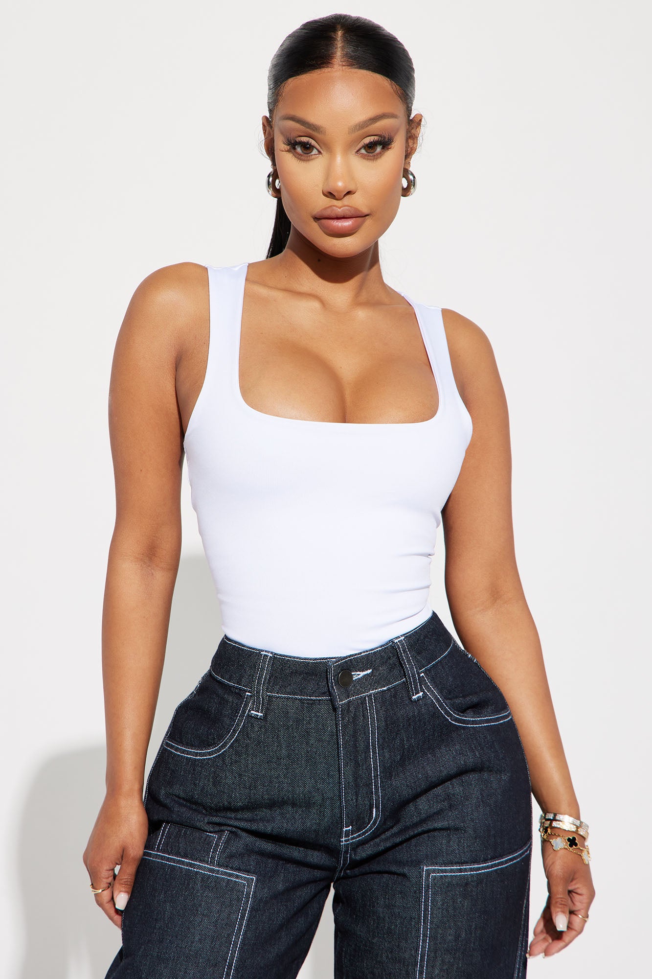 | Available In White, Black, And Taupe. Bodysuit Square Neck Sleeveless Cheeky Bottom Snap Button Closure Final Sale Double Lined Stretch 88% Polyester 12% Spandex Imported |