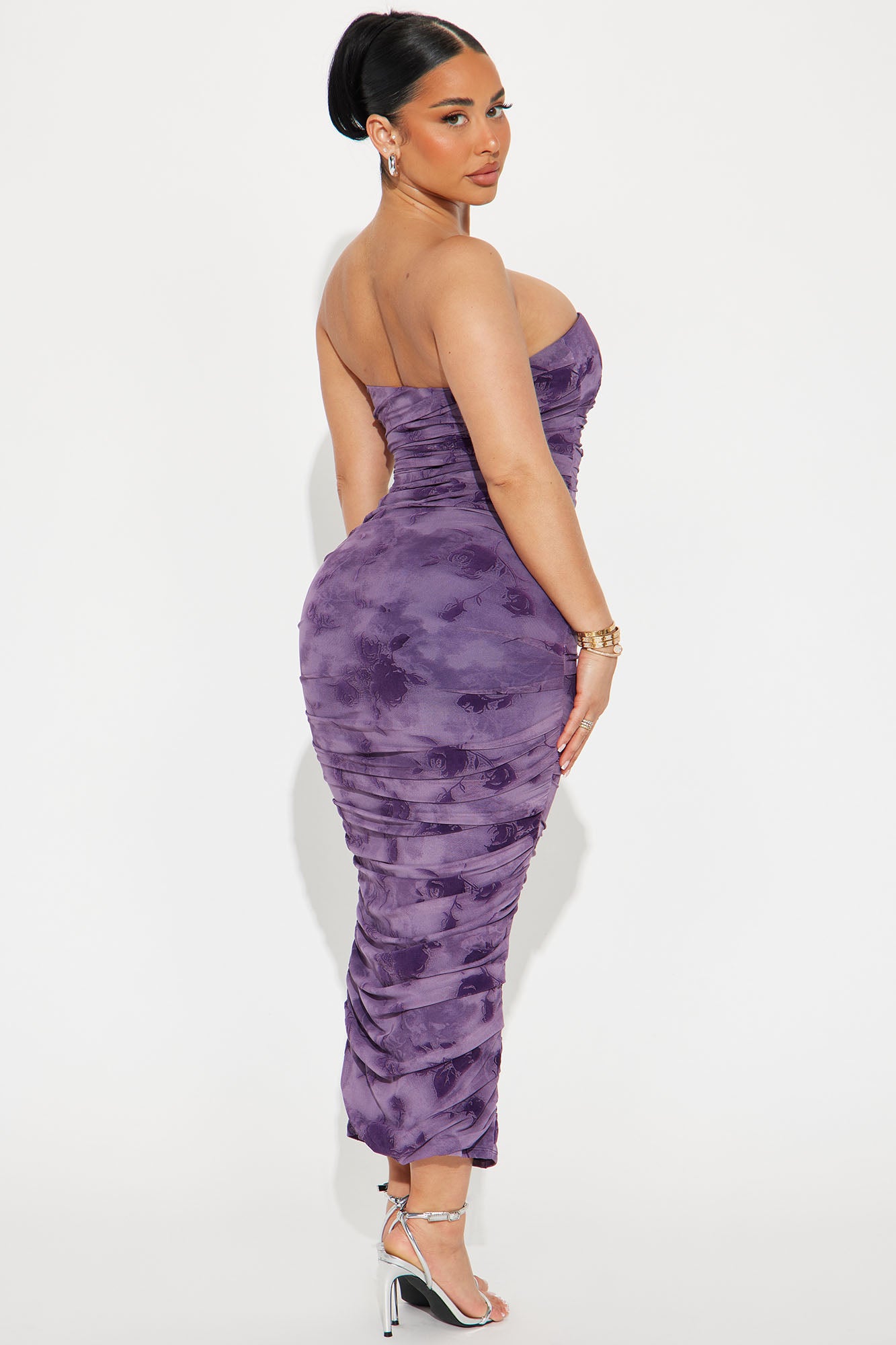 Available In Purple. Mesh Maxi Tube Dress Strapless Straight Neckline Ruched Boning Hidden Side Zipper Lined Stretch Disclaimer: Placement Of Burnout Will Vary. Self: 95% Polyester 5% Spandex Lining: 100% Polyester Imported |