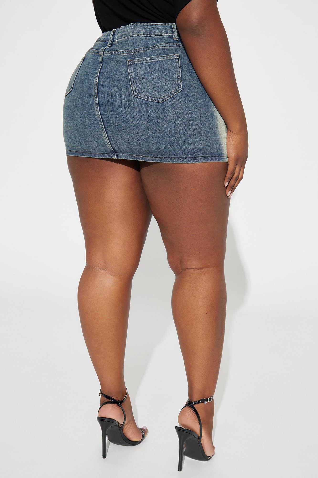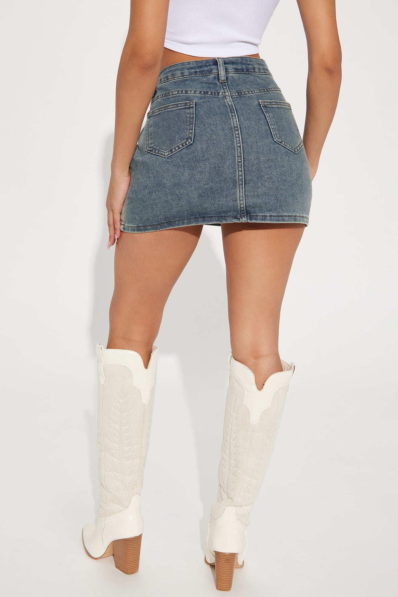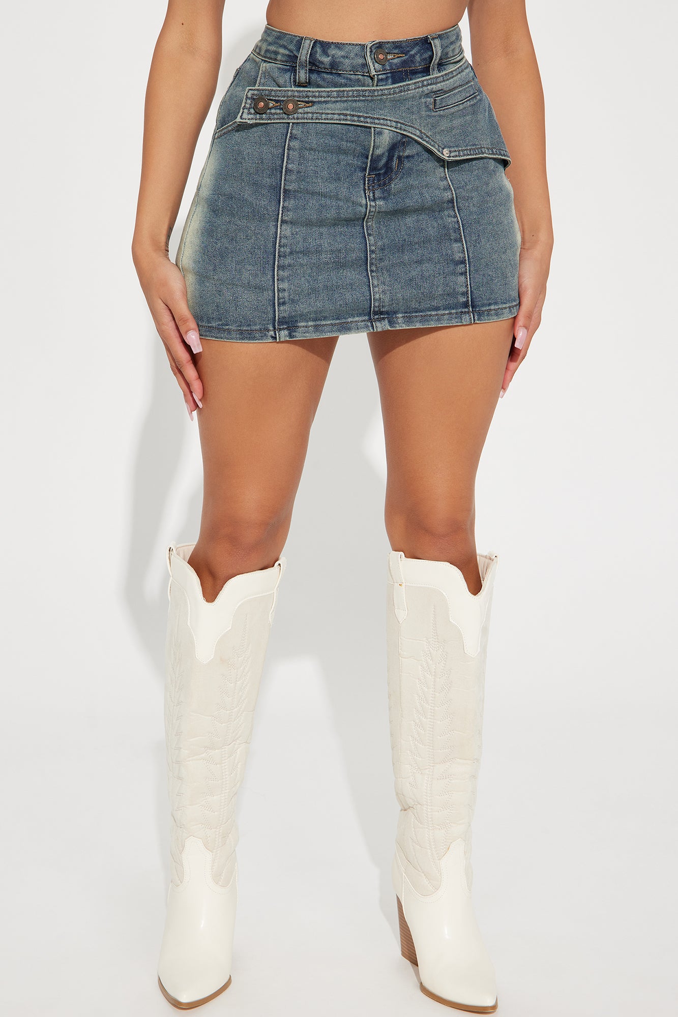 Available In Medium Wash. Skort High Rise Button & Zip Closure Wrap Detail Tinted Denim Stretch Disclaimer: Due To The Wash Process, Each Garment Is Unique. 69% Cotton 29% Polyester 2% Spandex Imported |