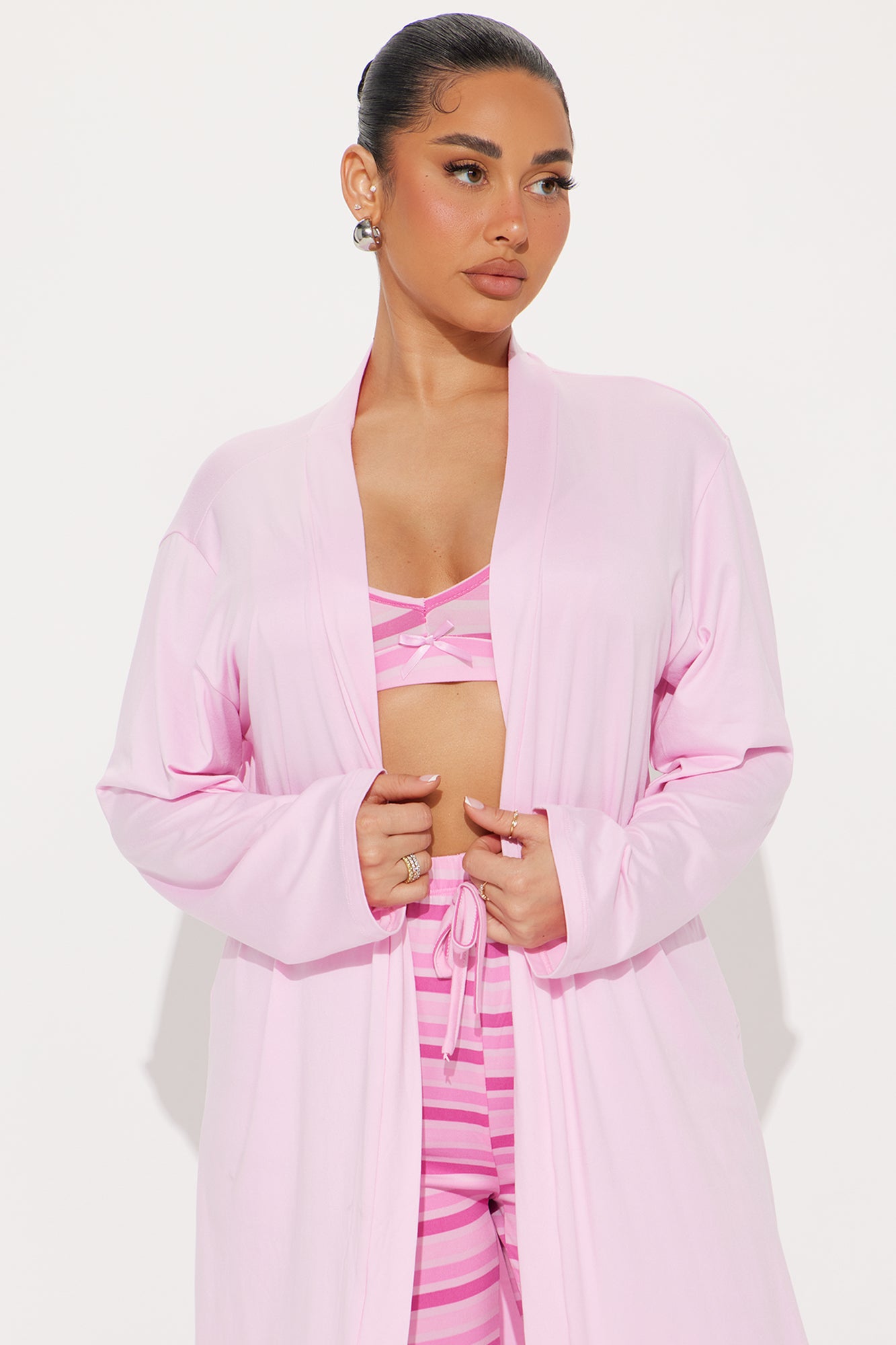 Available In Pink/combo. 3 Piece PJ Set Triangle Bralette Adjustable Straps Bow Detail Matching Pants Drawstring Waistband Matching Robe Long Sleeve Stretch Final Sale 92% Polyester 8% Spandex Imported |