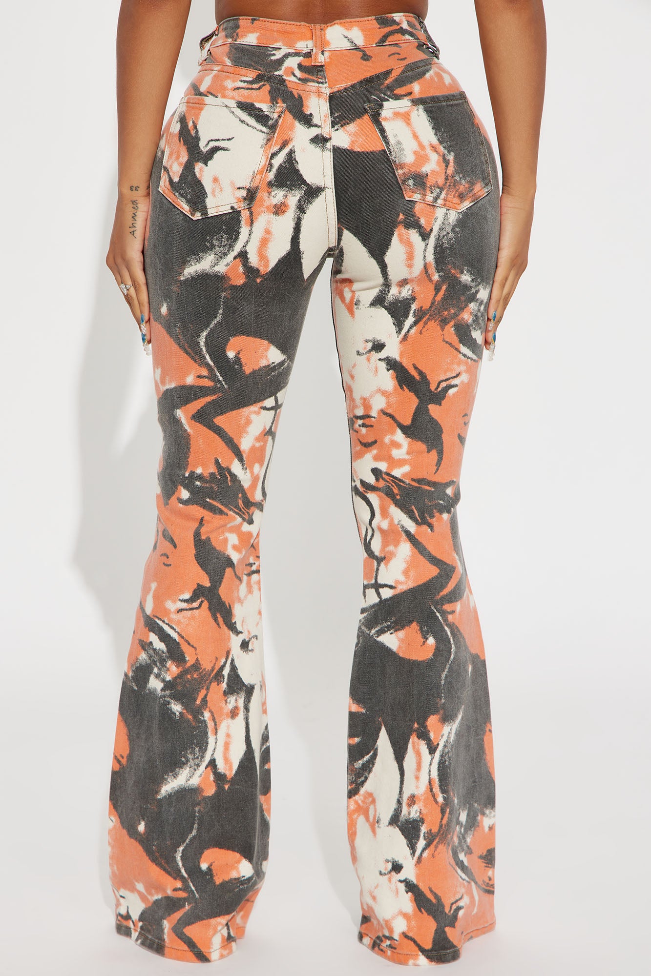 Available In Orange. Flare Jean 5 Pocket Abstract Print 11" High Rise Available in Regular 34" Inseam and Tall 37" Inseam 70% Cotton 27% Polyester 3% Spandex High Stretch Imported |