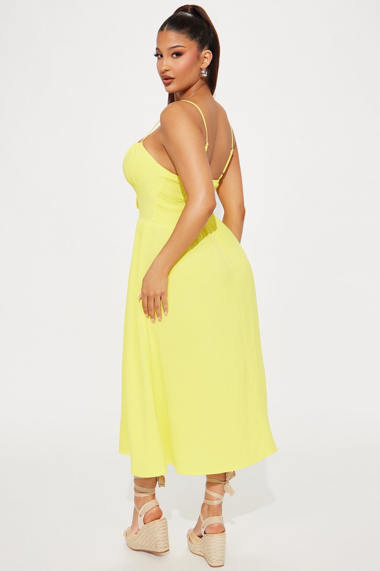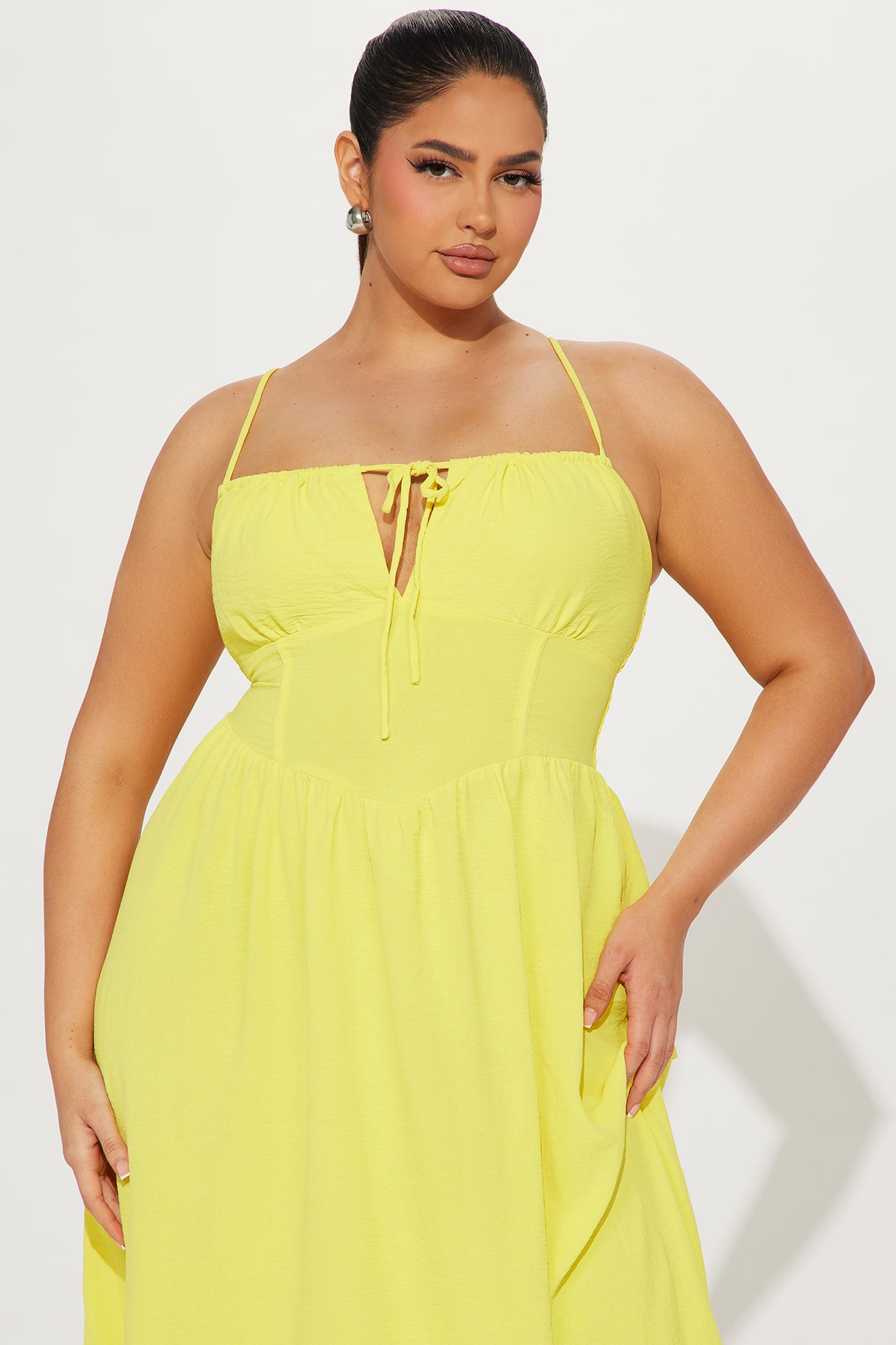 Available In Chocolate And Yellow. Midi Dress Adjustable Spaghetti Straps Notch Neckline w/ Self Tie Faux Corset Stretch Length = 45" Shell : 100% Polyester Lining: 100% Polyester Imported |