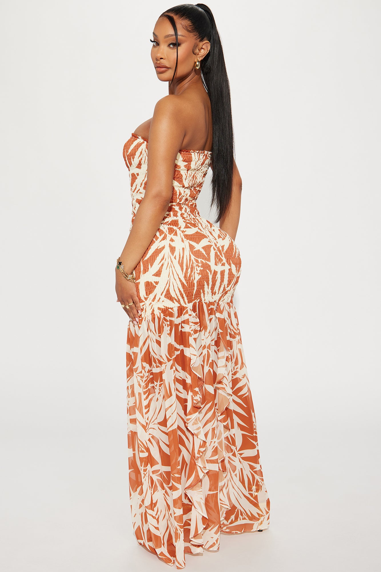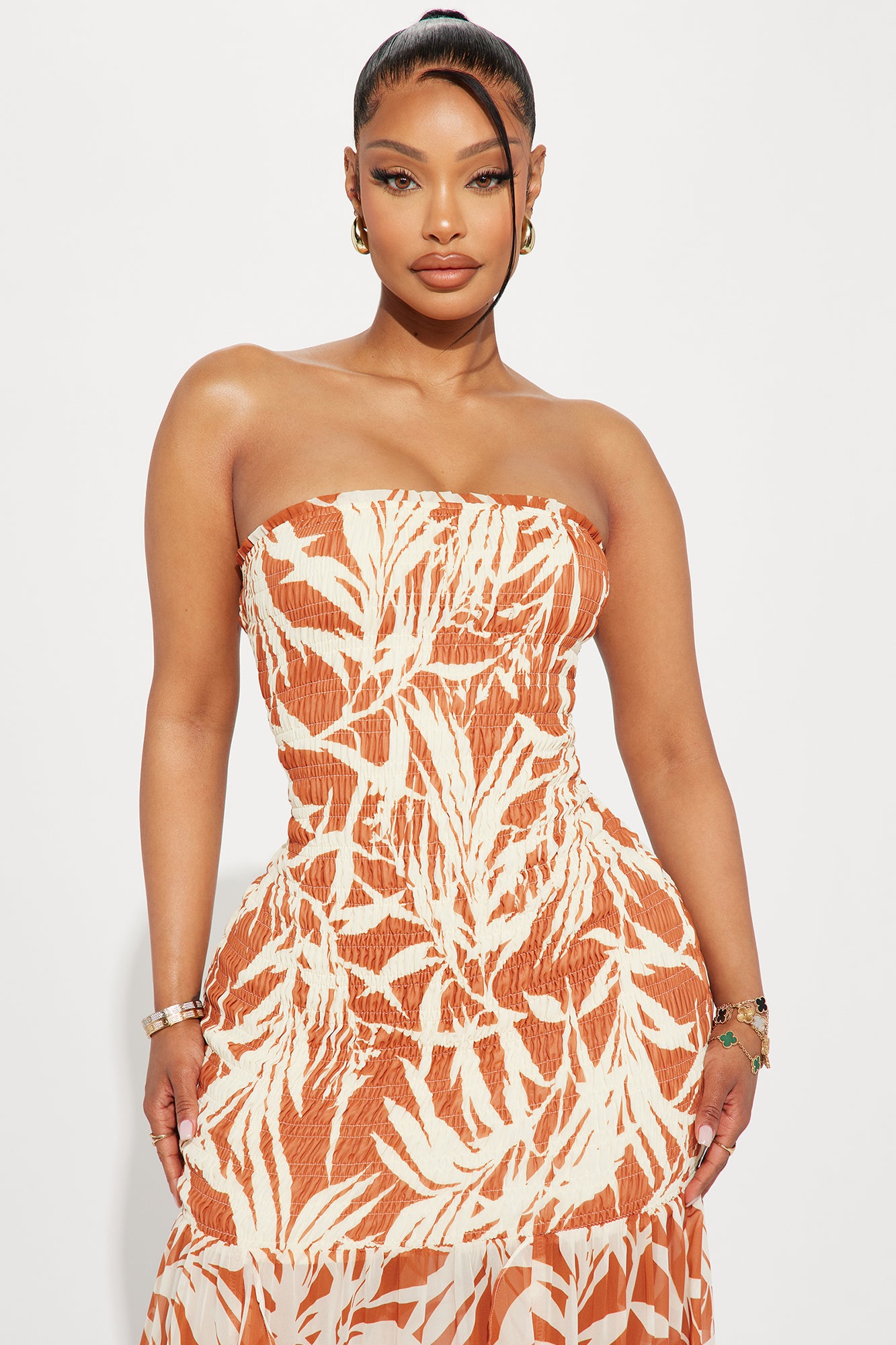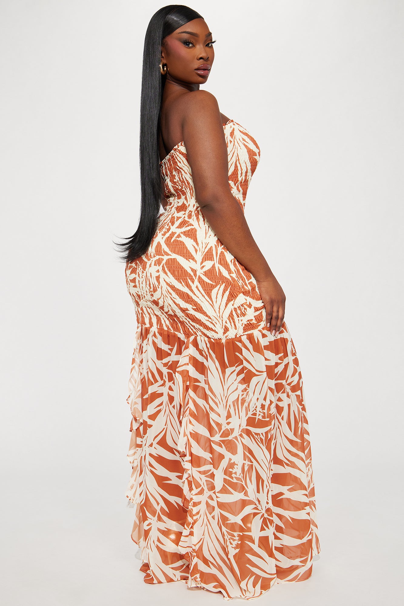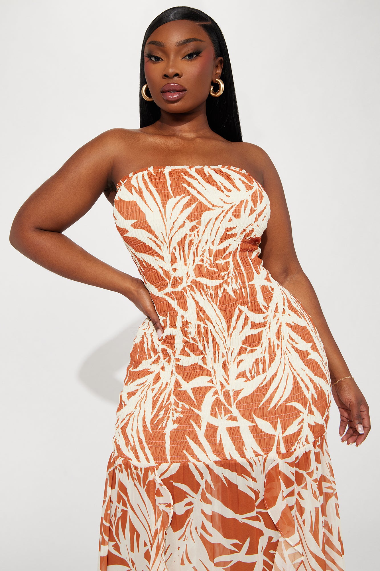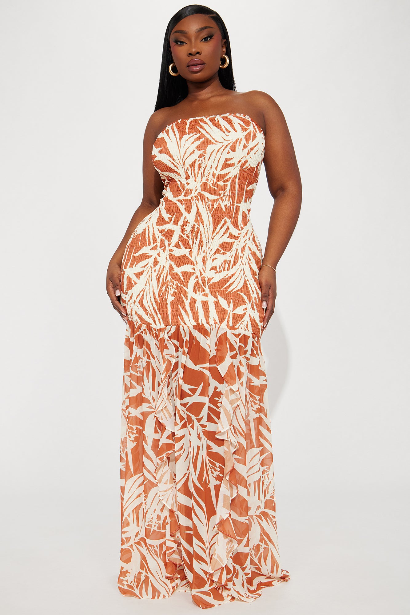 Available In Cognac. Chiffon Maxi Dress Strapless Straight Neckline Smocked Ruffle Detail Stretch Disclaimer Print Placement May Vary Self: 100% Polyester Lining: 100% Polyester Imported |