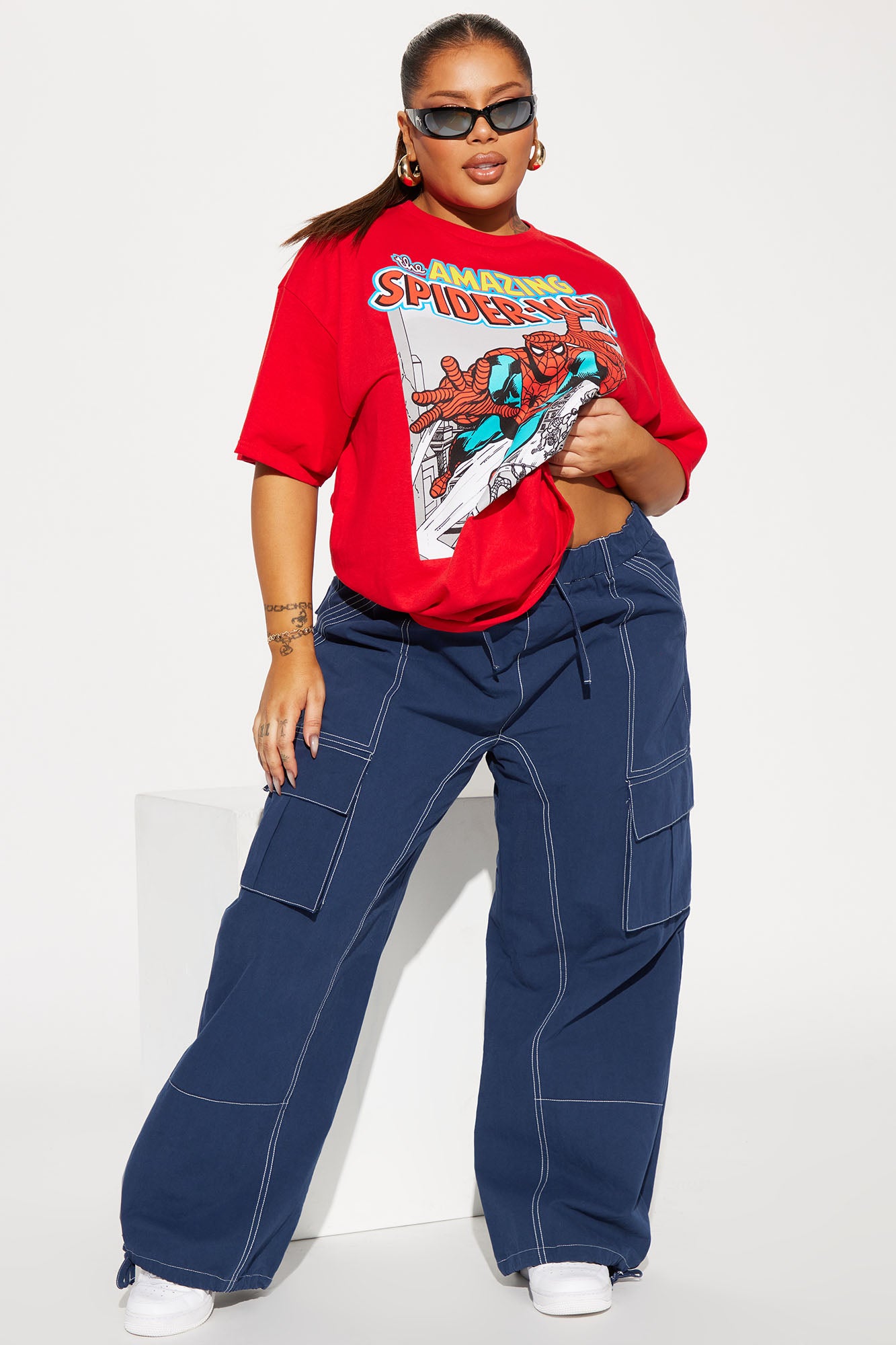 Available In Red. T-Shirt Crew Neck Short Sleeve Spiderman Graphic Front Screen Disclaimer: Due To The Printing Process A Difference In Saturation May Occur. Each Garment Is Unique. 100% Cotton Imported |