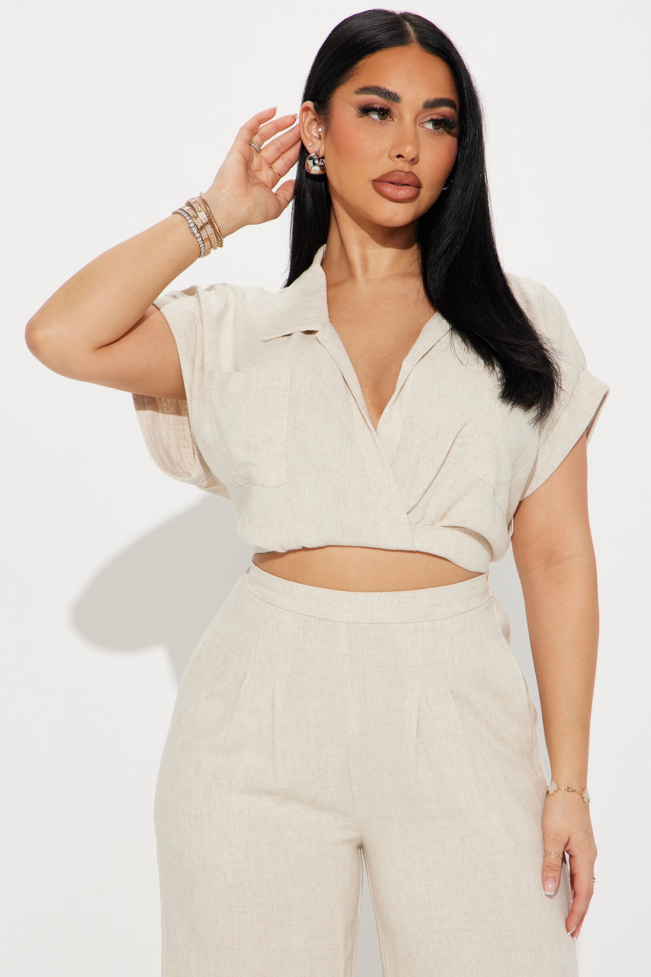 Available In Black, Chartreuse, Oatmeal, And Orange. Linen Pant Set Crop Top Collar Surplice Short Sleeve Wide Leg Pant Pockets Partial Elastic Waistband 33" Inseam 70% Rayon 30% Linen Imported |