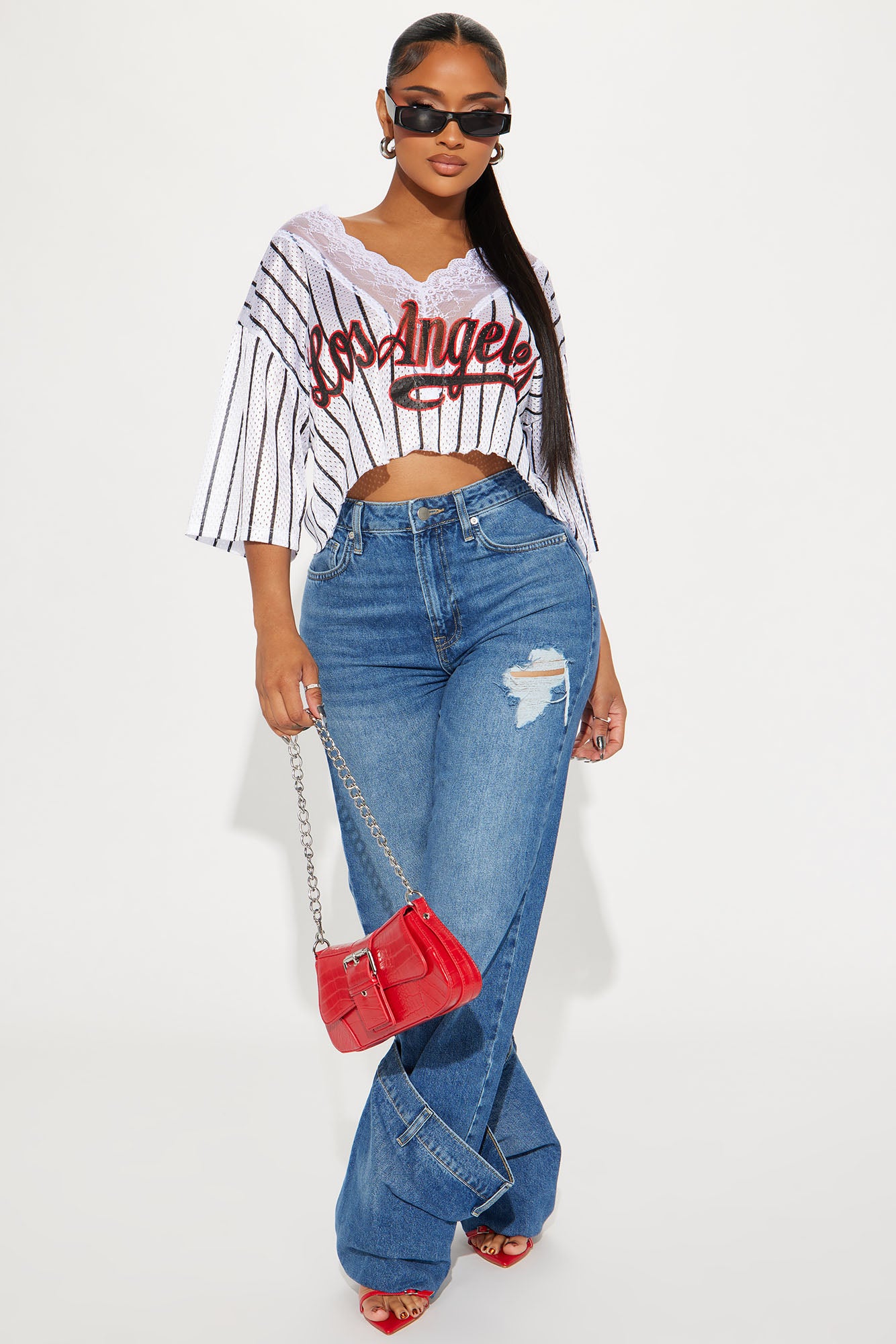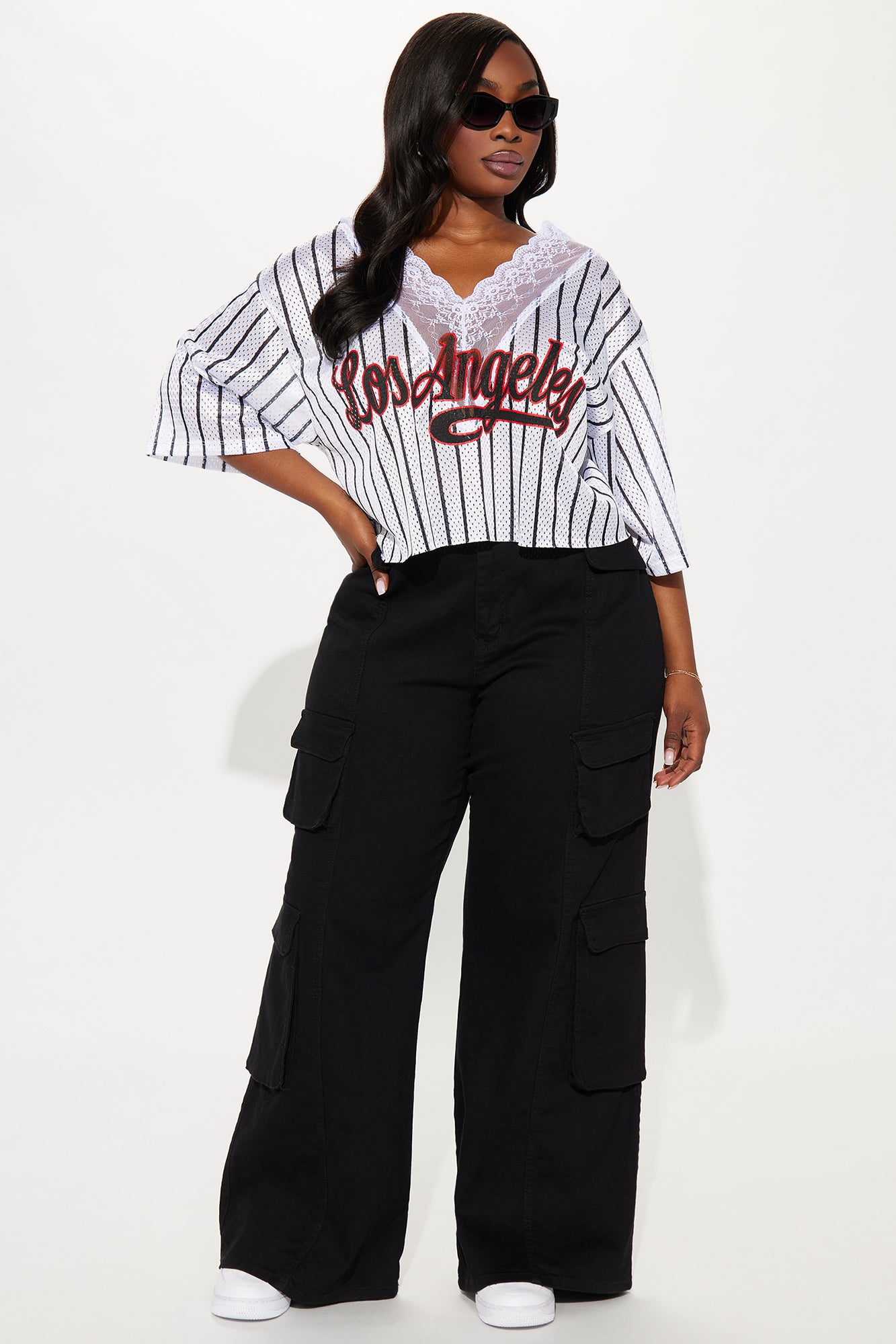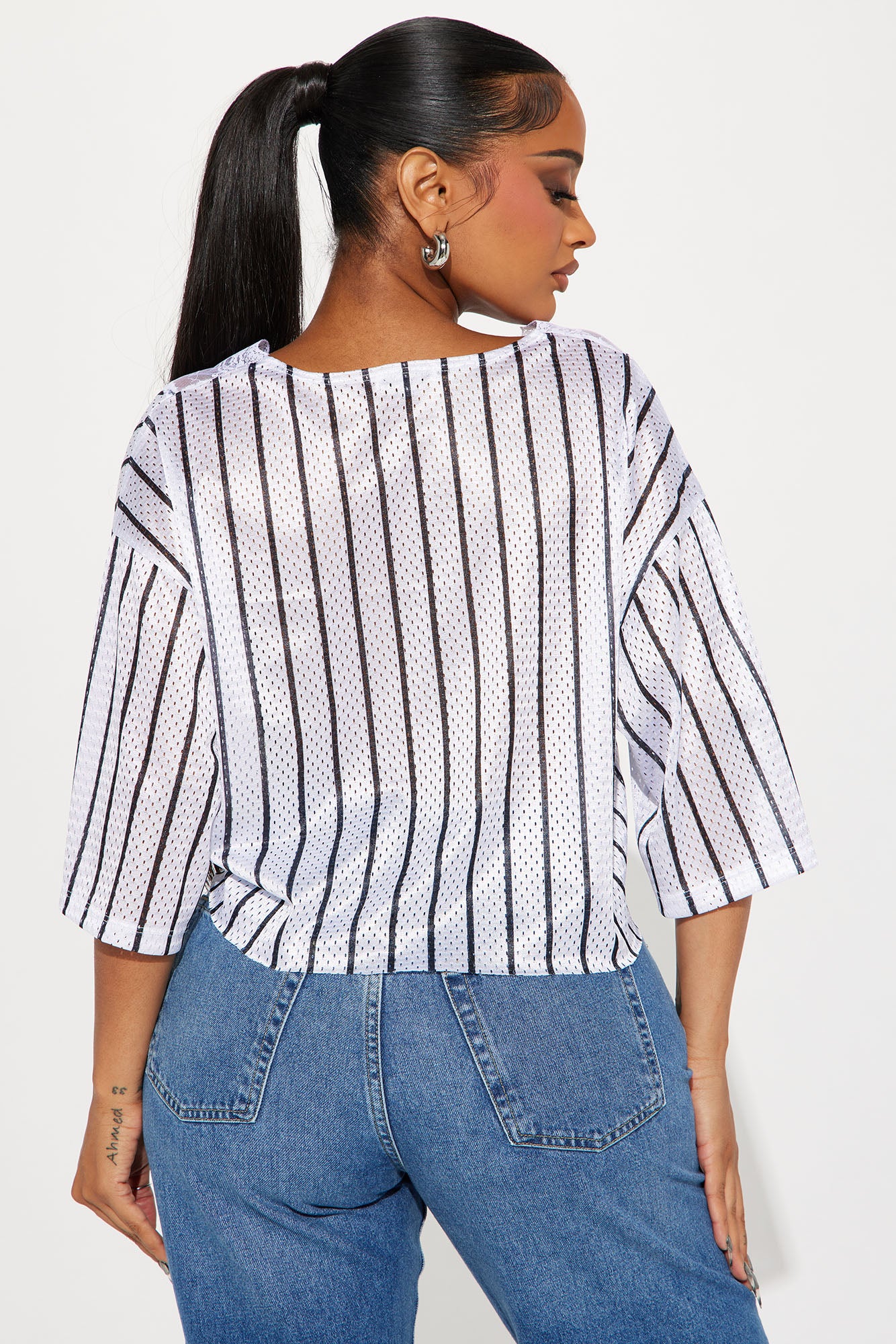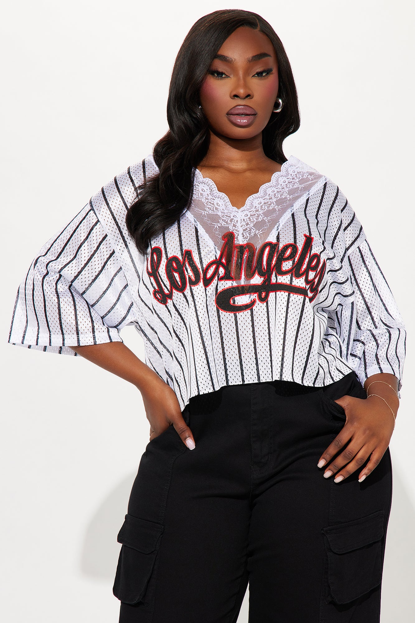 Available In White/Black. Jersey Mesh V-Neck Short Sleeve Cropped Lace Trim Disclaimer: Due To The Screen Printing Process A Difference In Saturation May Occur. Each Garment Is Unique. 100% Polyester Imported |
