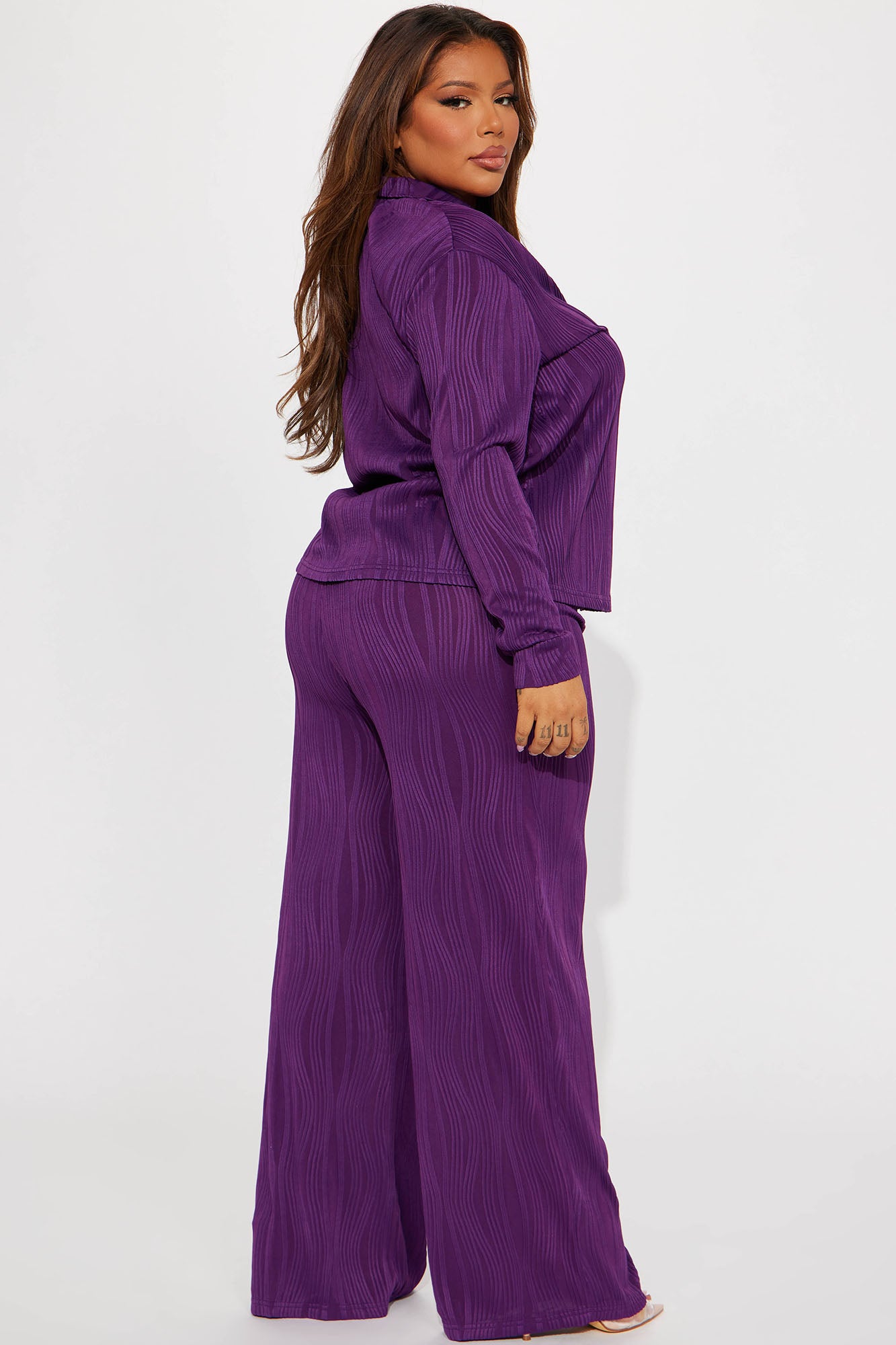 Available In Blue, Taupe, And Plum. Textured Pant Set Long Sleeve Shirt Collar Button Front Wide Leg Pant Elastic Waistband Stretch Self: 95% Polyester 5% Spandex Imported |