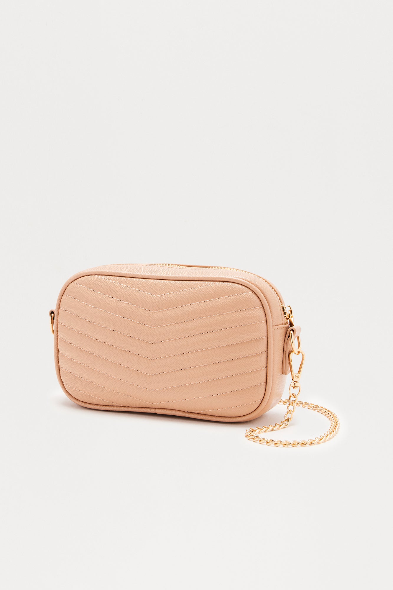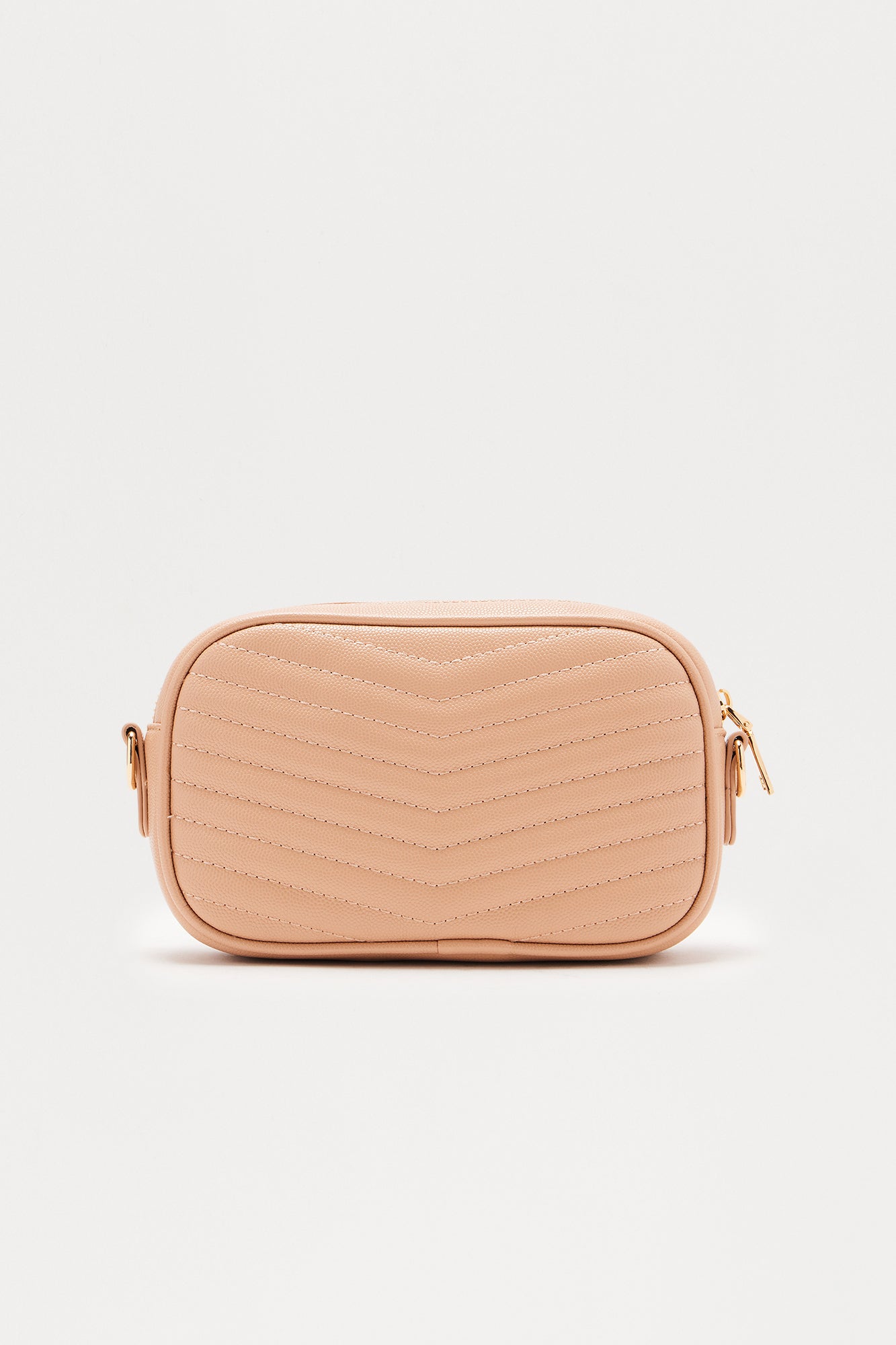 Available In Black And Nude. Crossbody Handbag Top Zip Closure Quilted Design External Pocket Removeable Strap Dimensions: 9x2x5 in Imported |