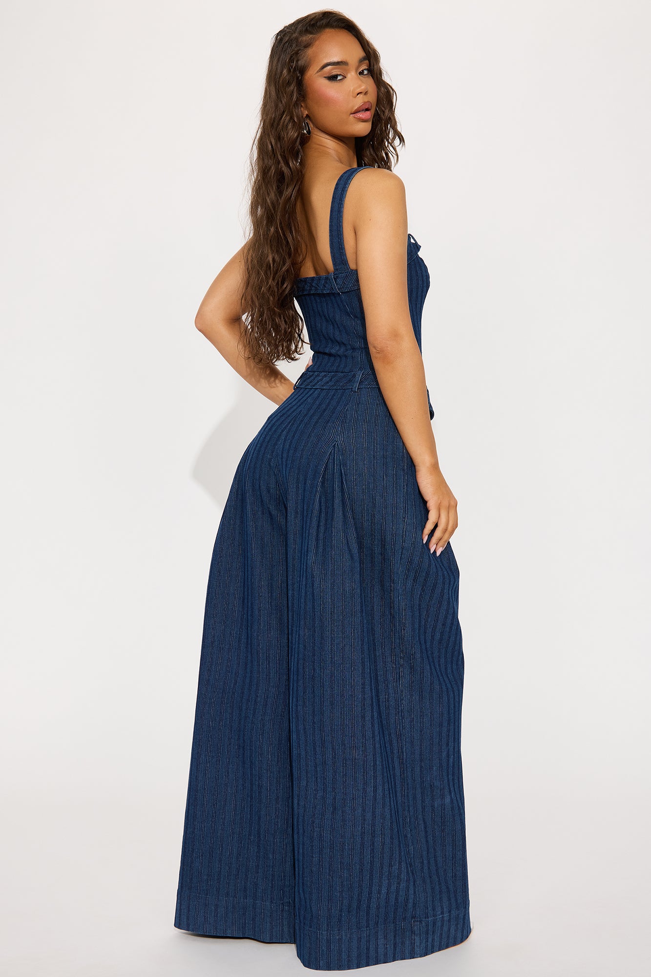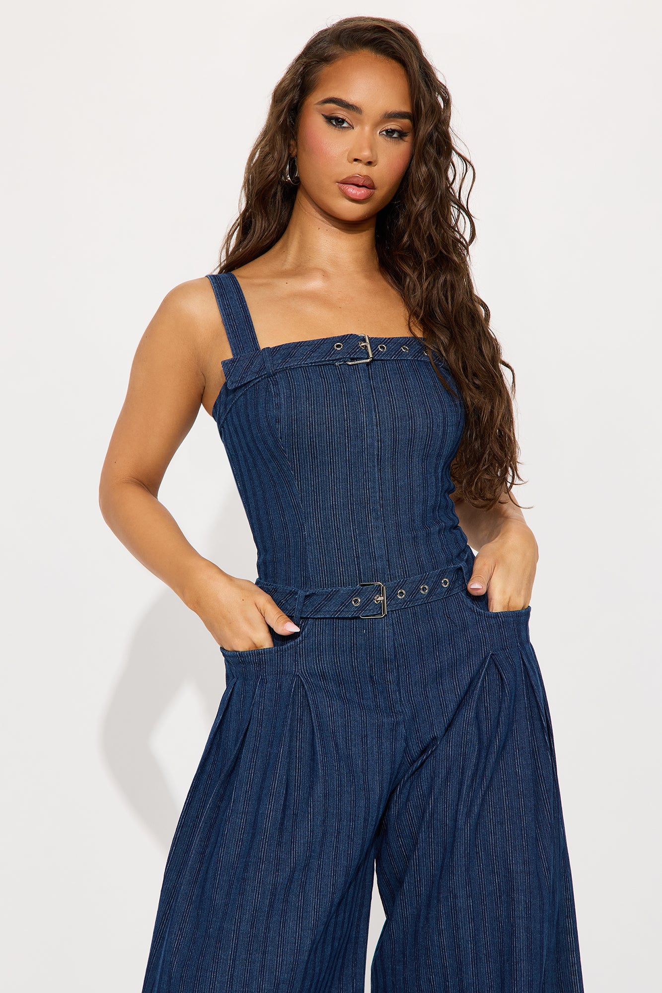 Available In Dark Wash. Jumpsuit Adjustable Belt Detail Hidden Front Zip Closure Pockets Wide Leg Slight Stretch Inseam = 33" Disclaimer: Due To The Specialized Wash, Each Garment Is Unique. Self: 68% Cotton 29% Polyester 3% Spandex Lining: 88% Polyester 12% Spandex Imported |