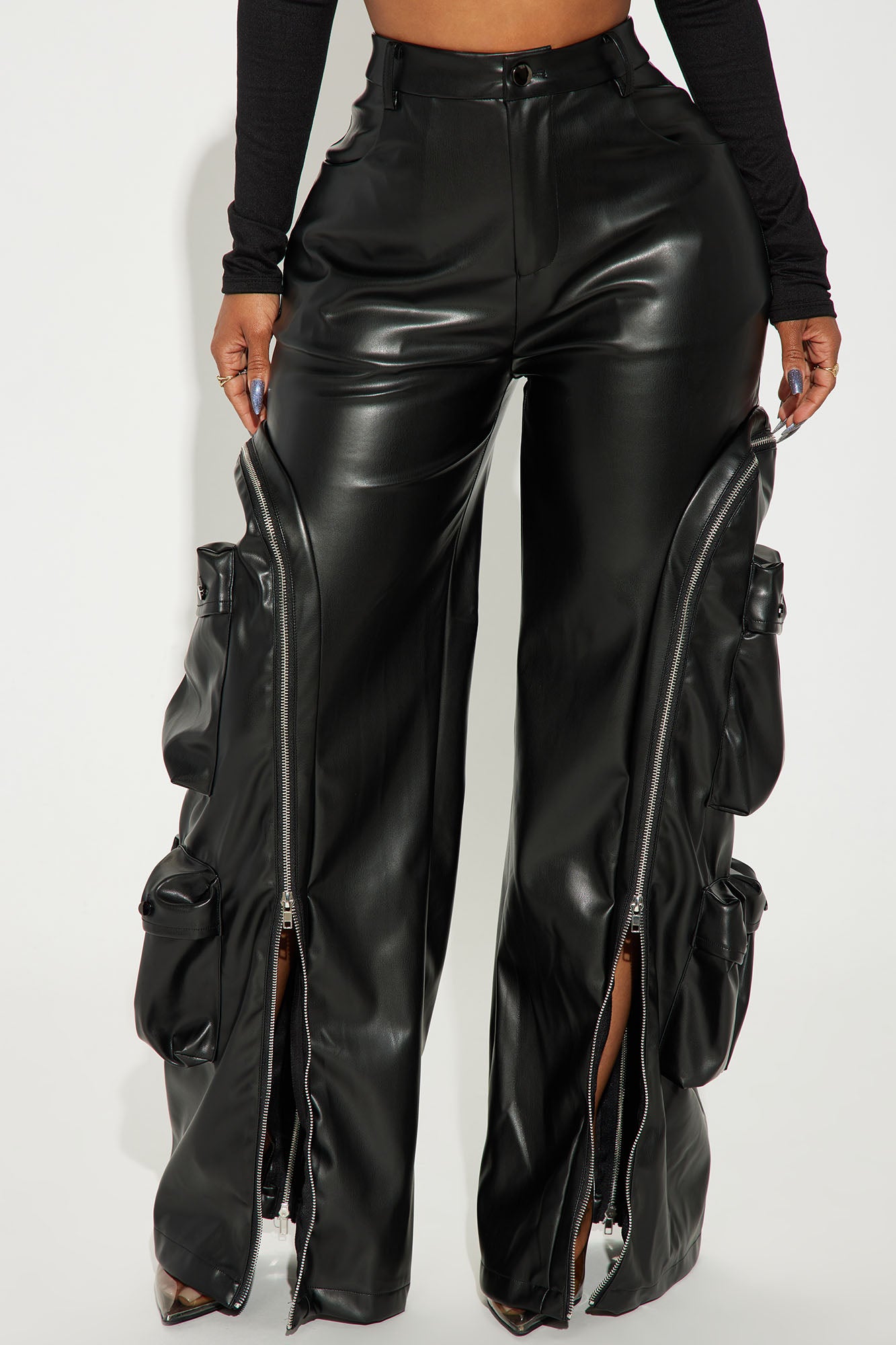 Available In Navy And Black. Faux Leather Pant High Rise Button Zipper Closure Cargo Pockets Functional Zipper Detail Wide Leg Non Stretch 100% Polyester Polyurethane Coated Imported |