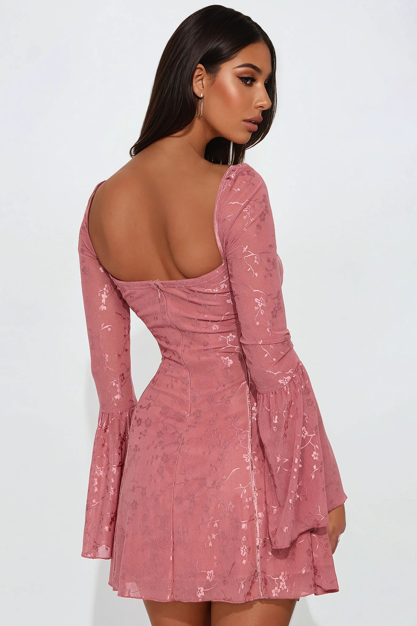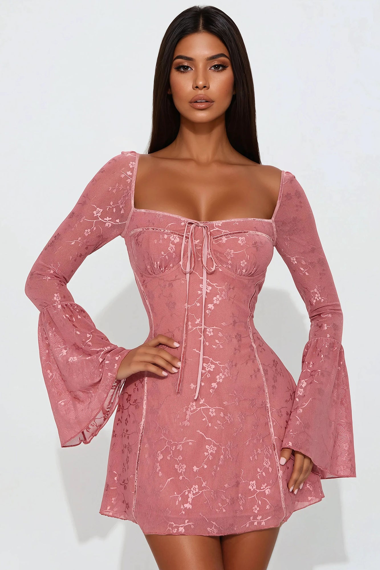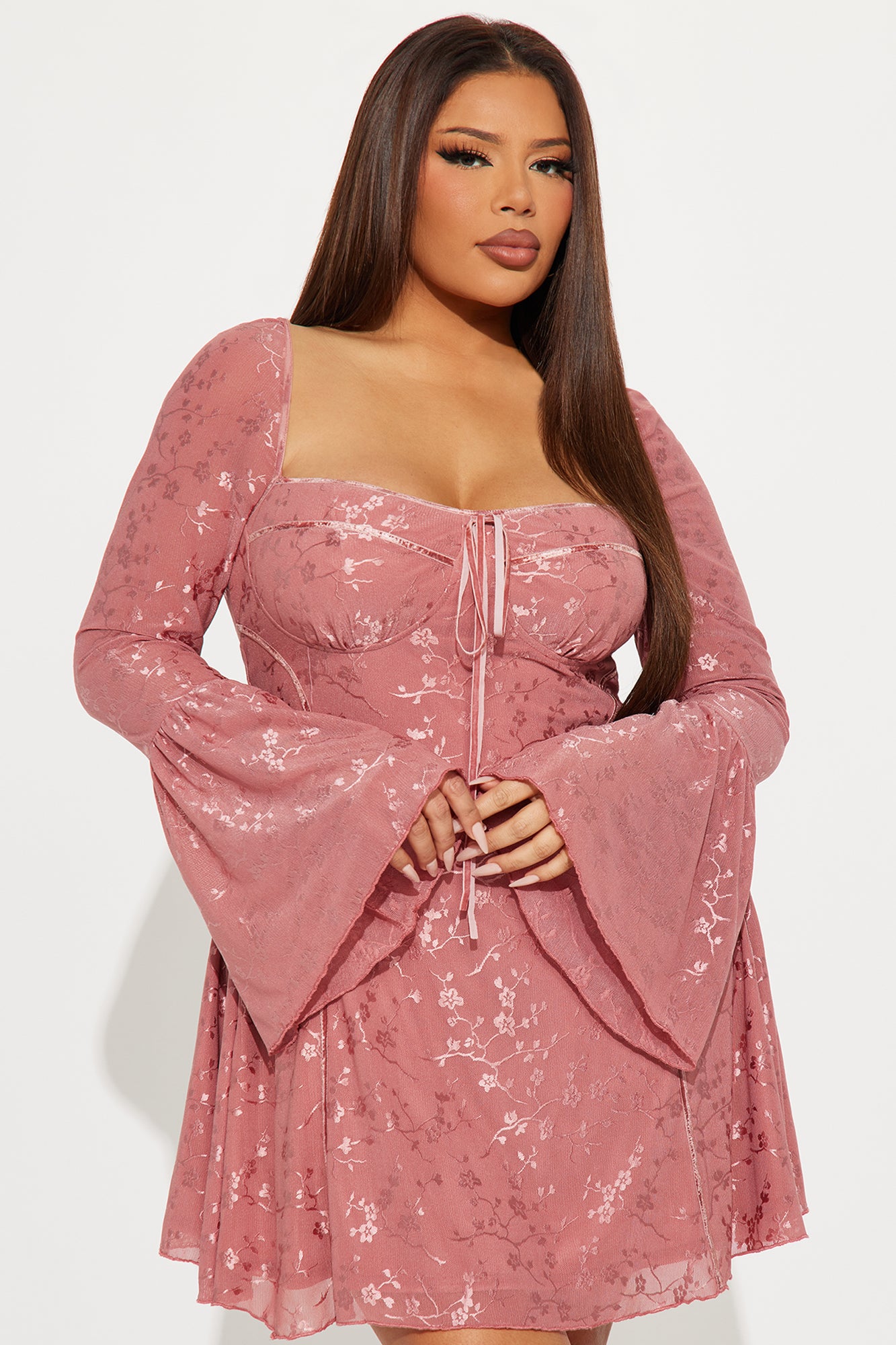 Available In Lavender And Mauve. Floral Lace Mini Dress Sweetheart neckline Long bell sleeves Tie detail Bra cups Back zipper Lined Stretch Length = 31" Disclaimer: Design Placement May Vary. Self 91% Nylon 9% Spandex Lining 100% Polyester Imported |