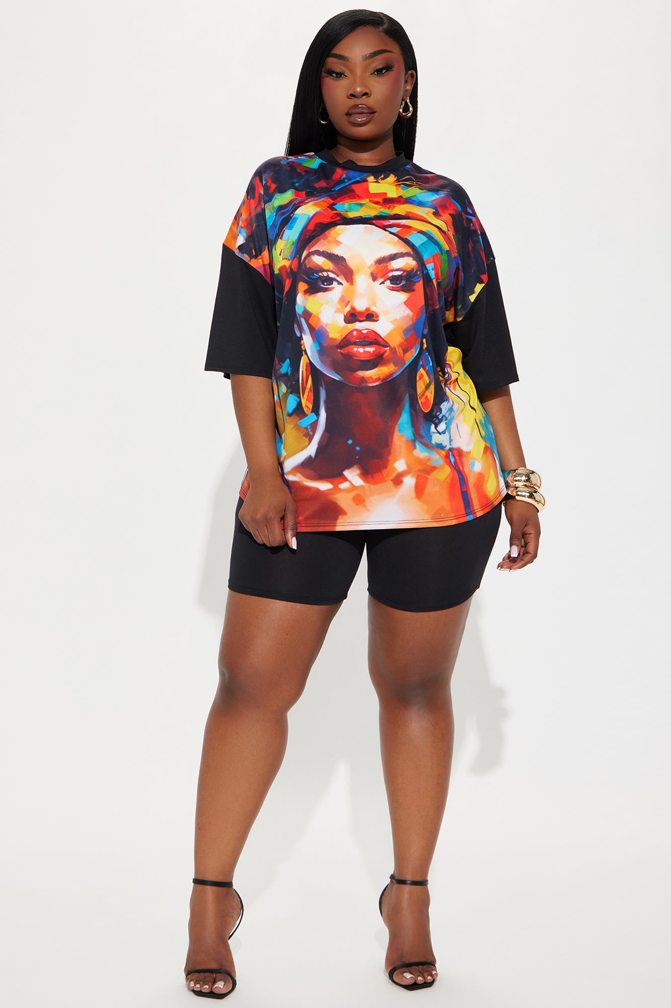 Available In Black. Biker Short Set Oversized T-Shirt Crew Neck Short Sleeve Biker Short Elastic Waistband Stretch Disclaimer: Print Placement Will Vary Self: 96% Polyester 4% Spandex Imported |