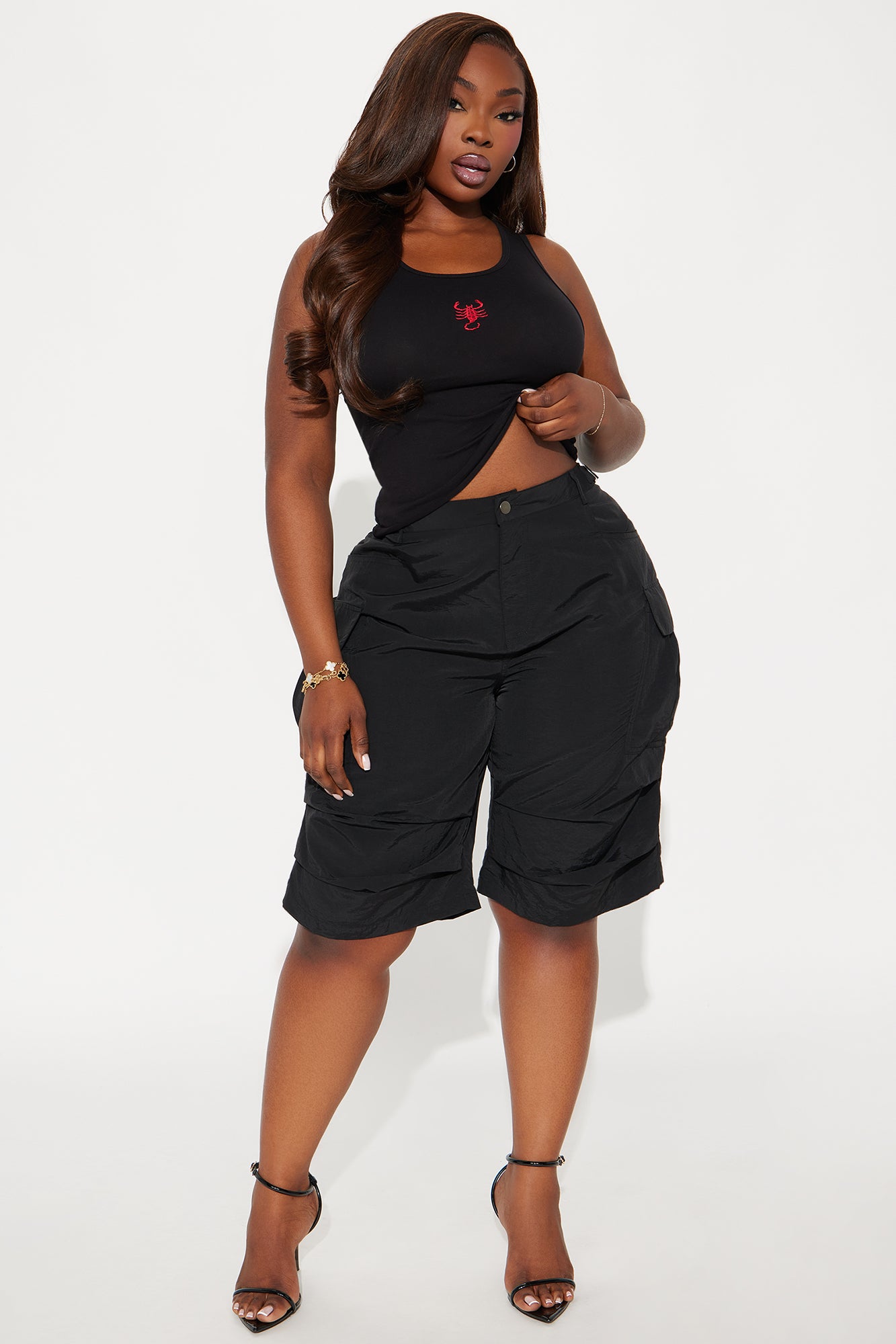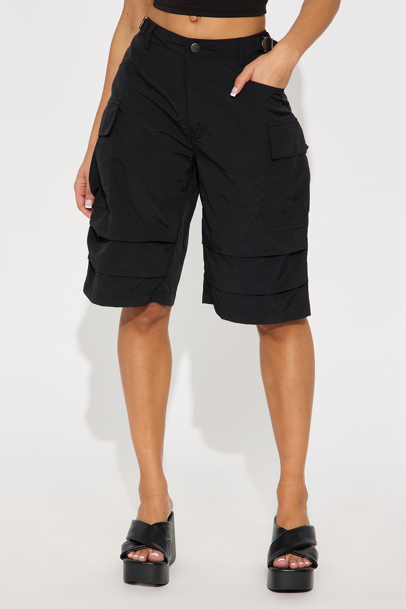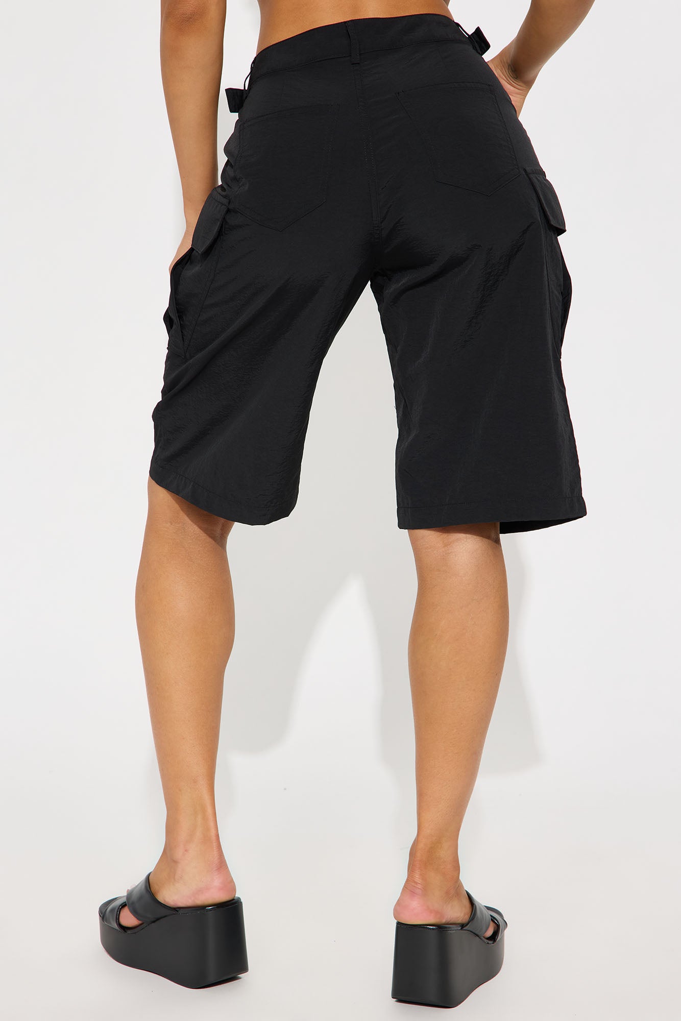 Available In Black And Olive. Windbreaker Bermuda Short Mid Rise Button & Zip Closure Adjustable Side Tabs Ruched Non Stretch 100% Nylon Imported |