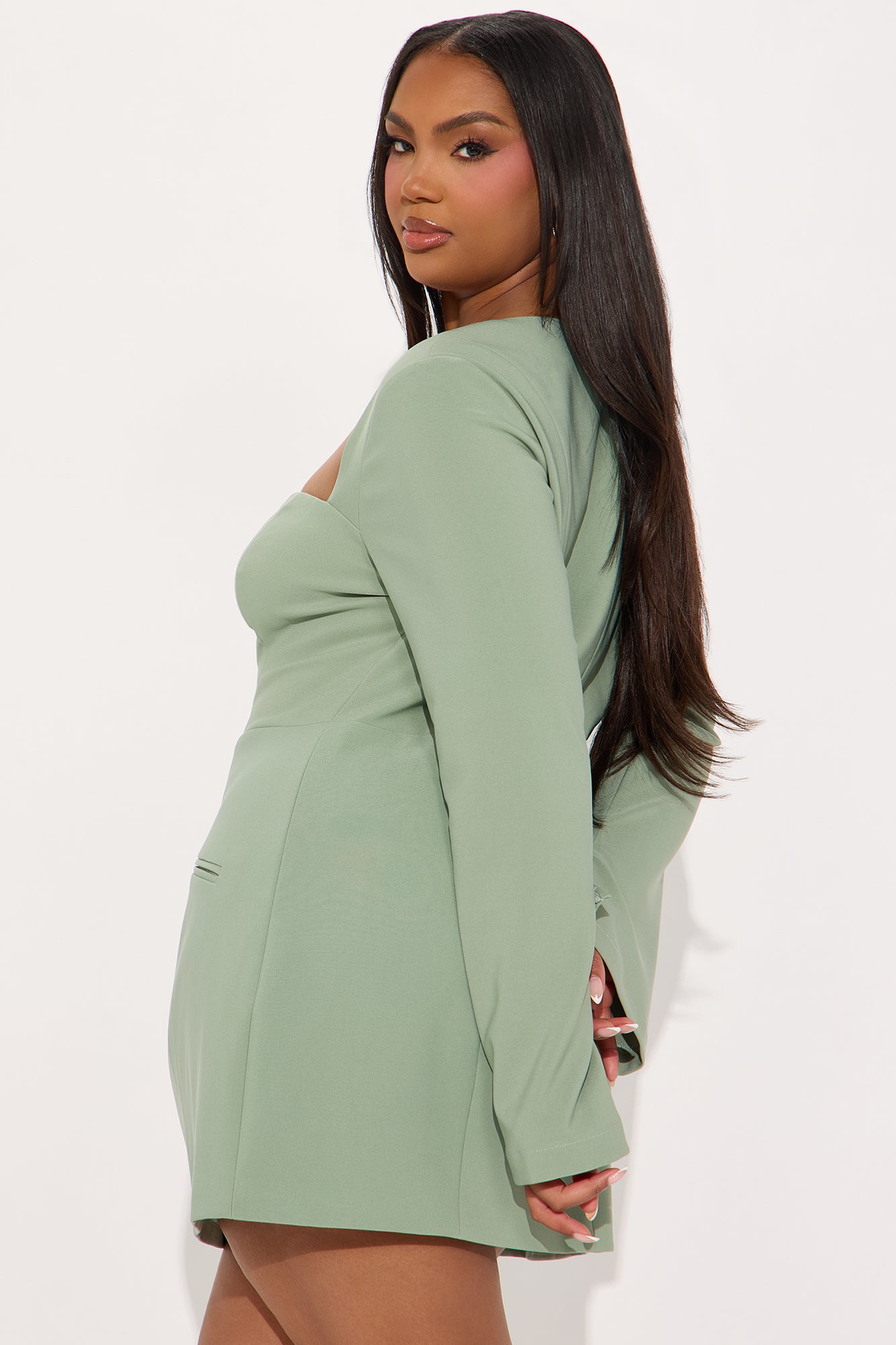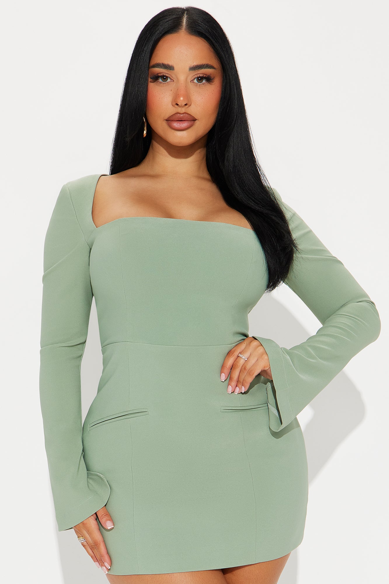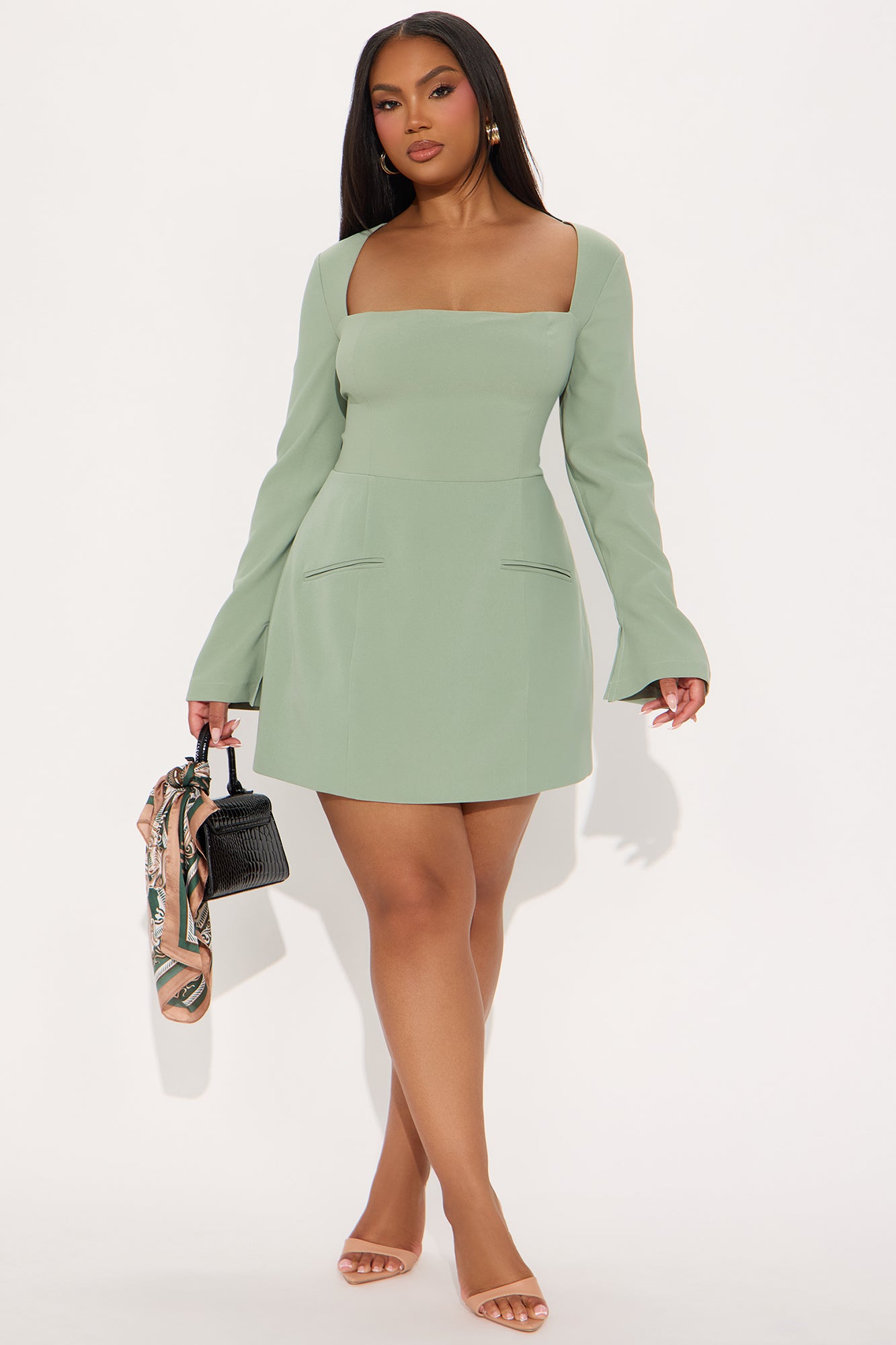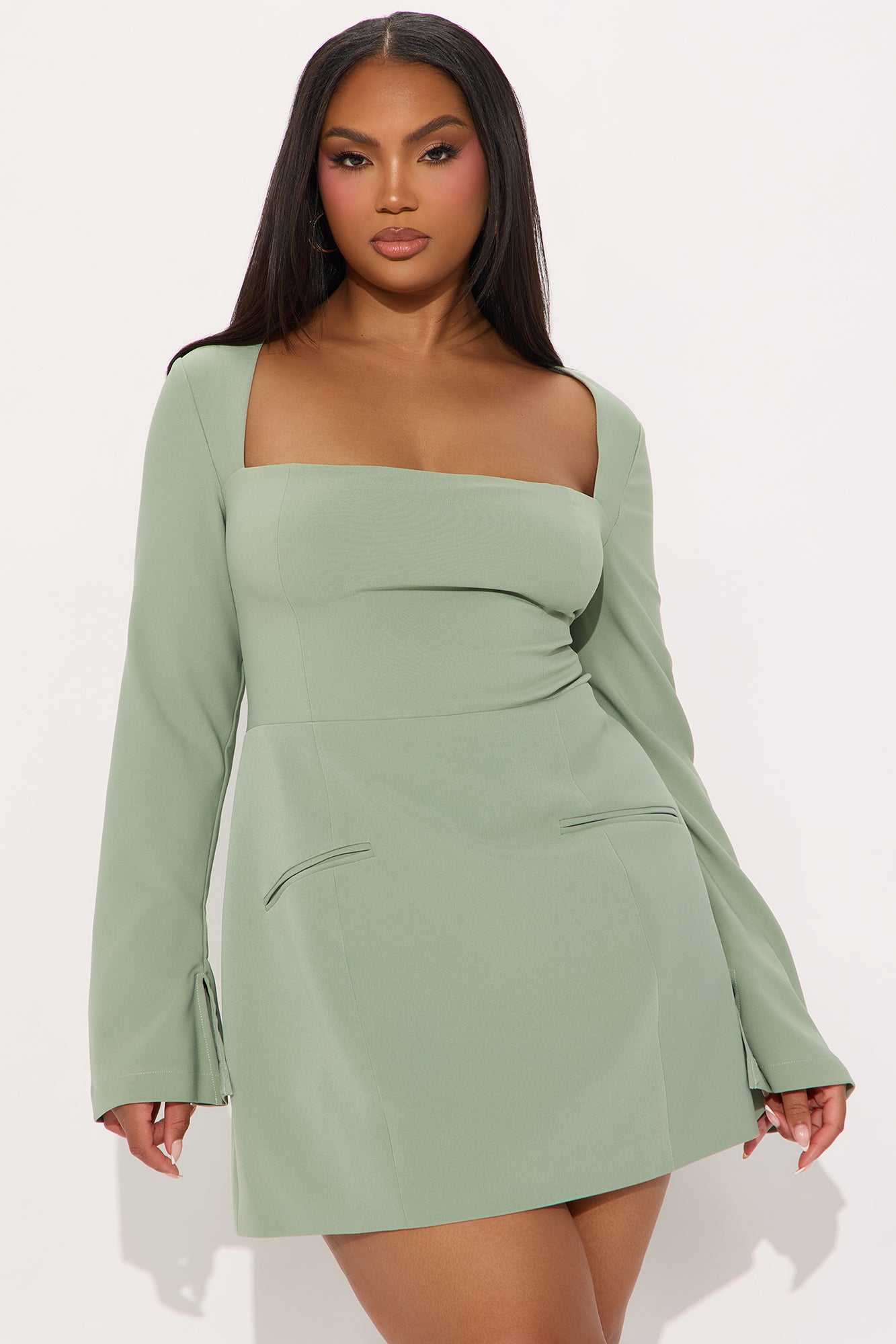 Available In Black, Off White, And Sage. Square Neck Micro Mini Dress Square neckline Long sleeves Faux pockets Back zipper Lined Length measured flat = 32" Self: 92%Polyester 8%Spandex Lining: 95%Polyester 5%Spandex Imported |