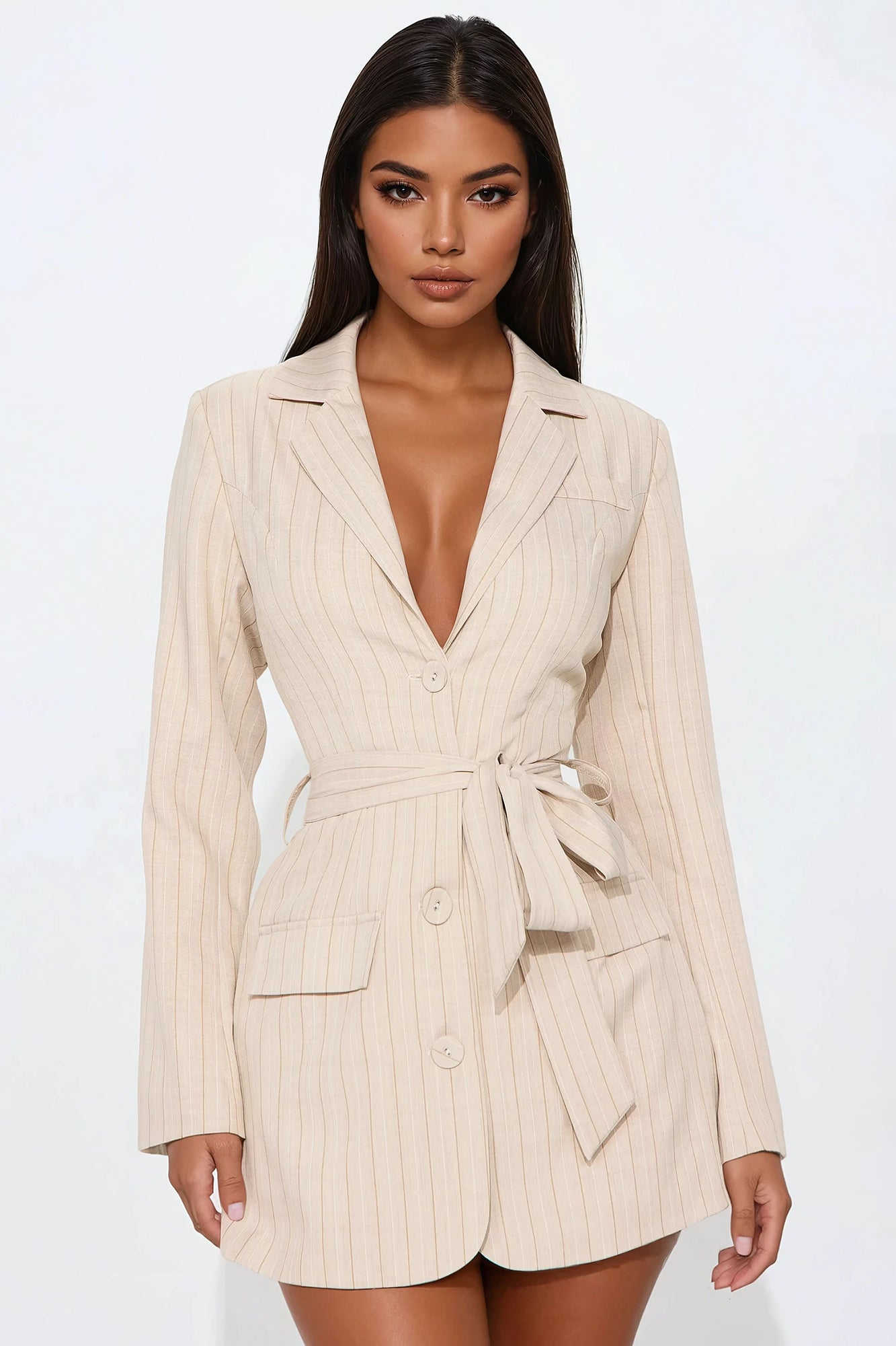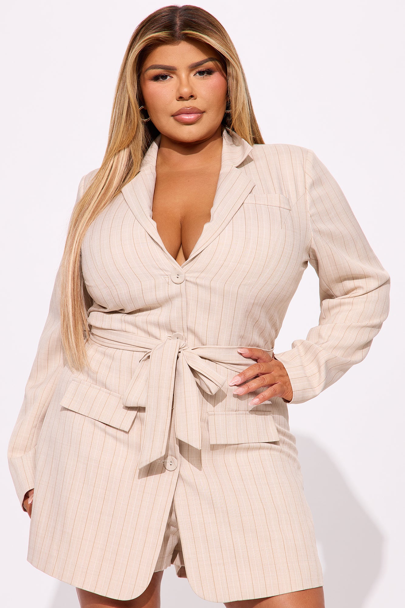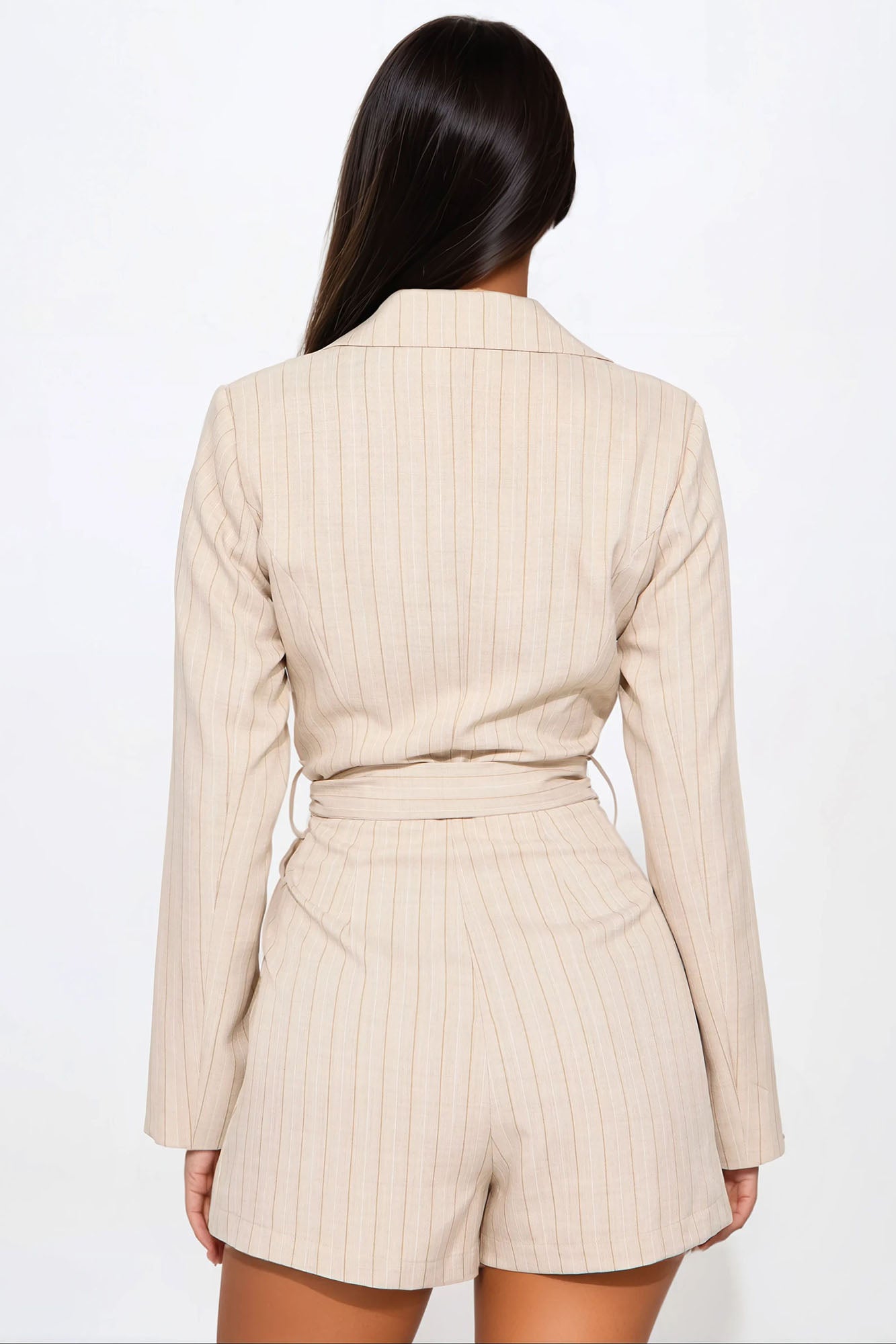 Available In Oatmeal/combo. Romper Notched Collar Button Up Front Closure Lined Top Zipper Front Bottom Closure Waist Tie Detail Straight Short Disclaimer: Stripe Placement Will Vary. Self: 98.7% Polyester 1.3% Elastane Lining: 100% Polyester Imported |
