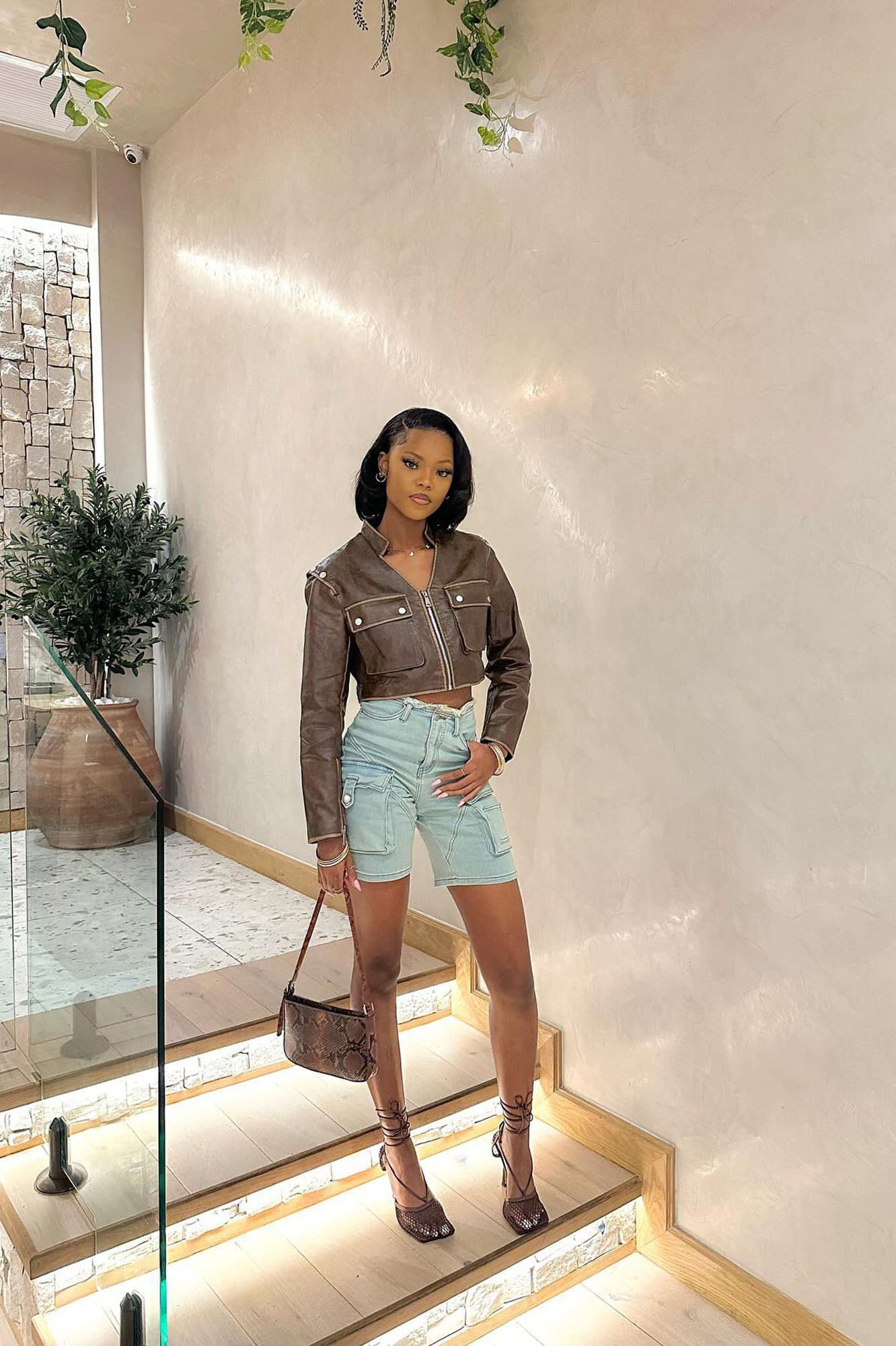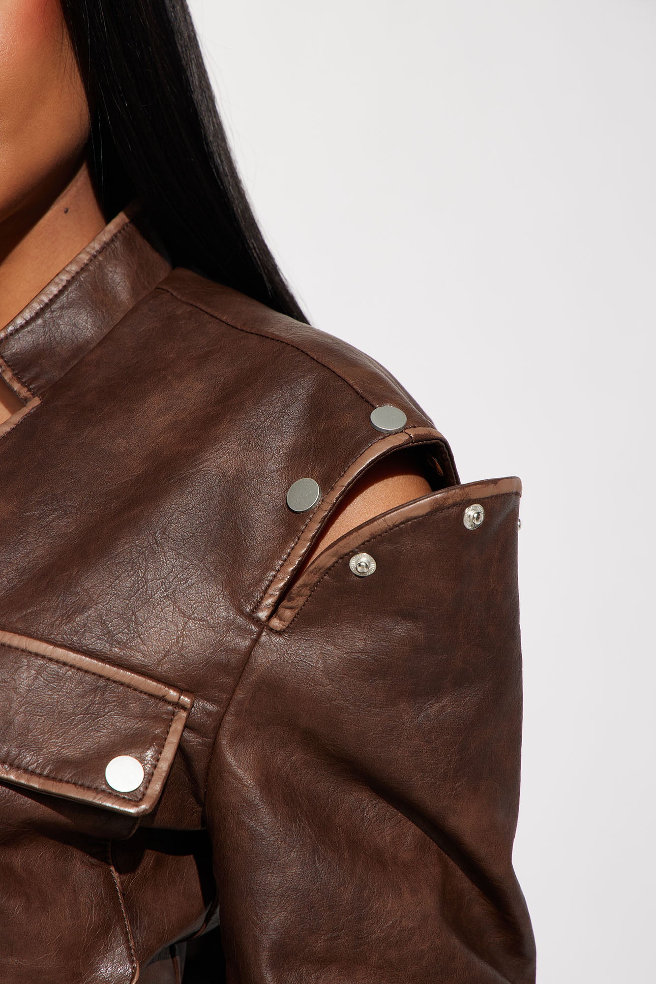 Available In Brown. Faux Leather Fitted Jacket Utility Pockets Full Zip Closure Shell: 60% PU 36% Polyester 3% Cotton 1% Viscose? Lining: 100% Polyester? Imported |