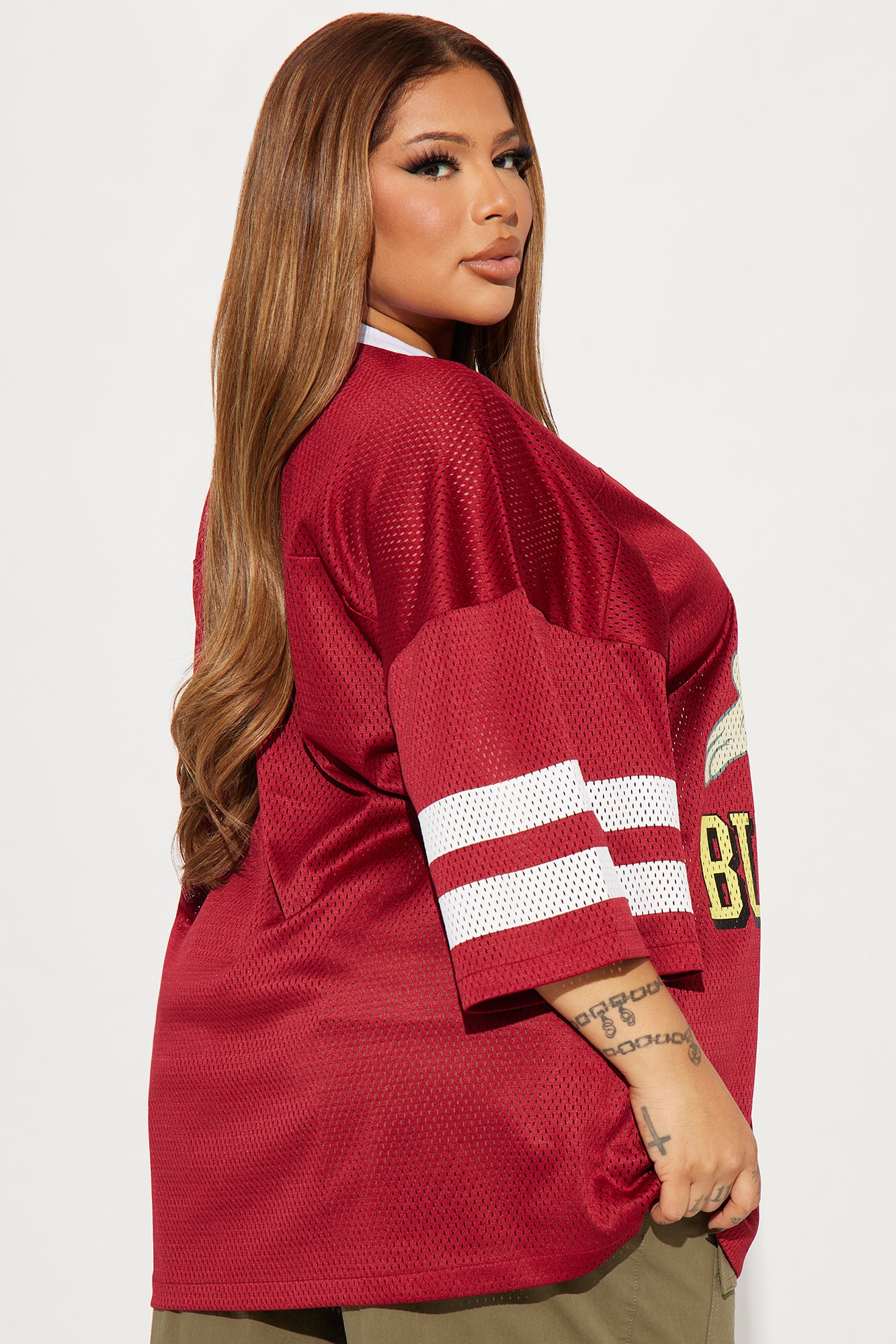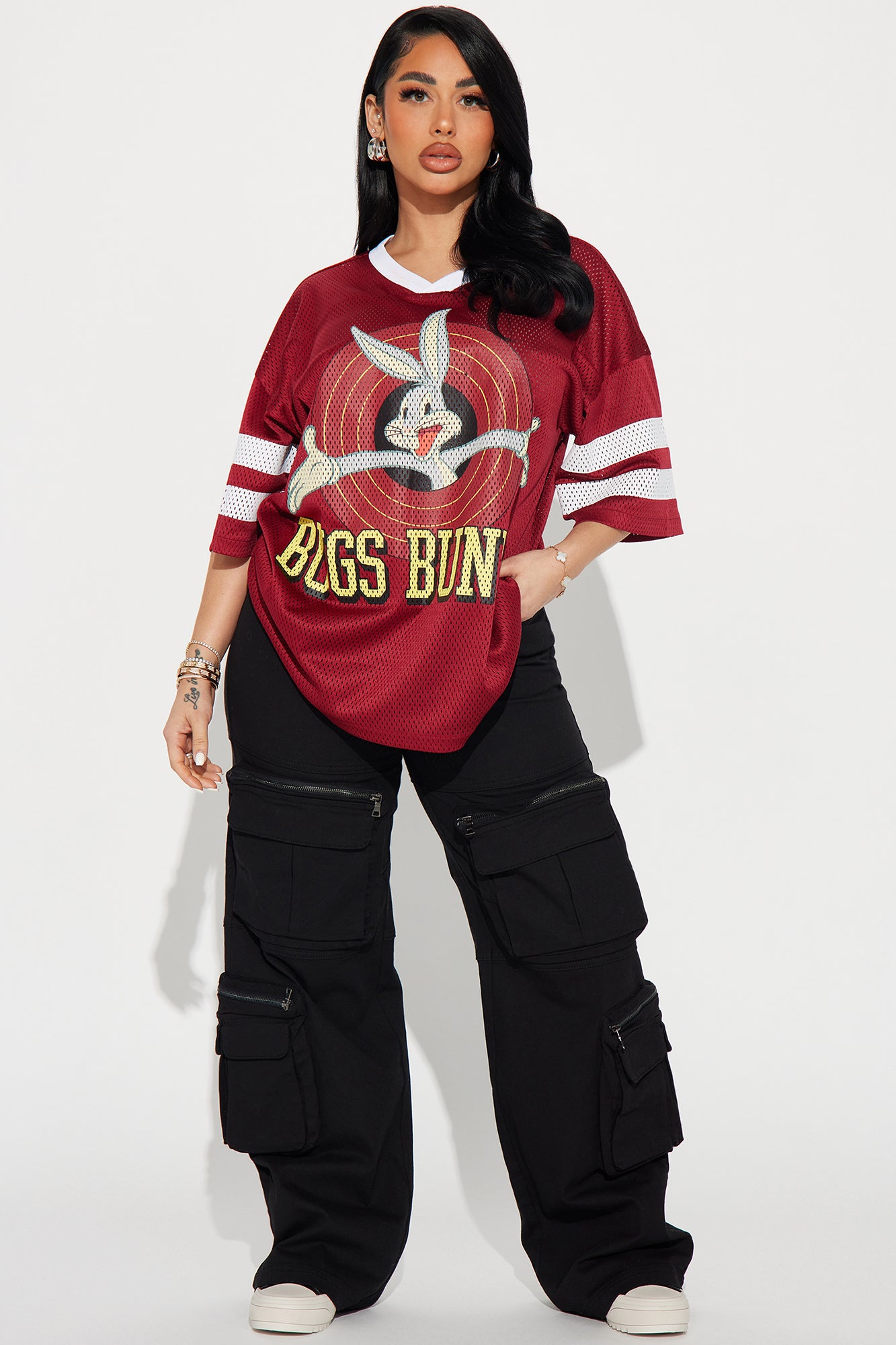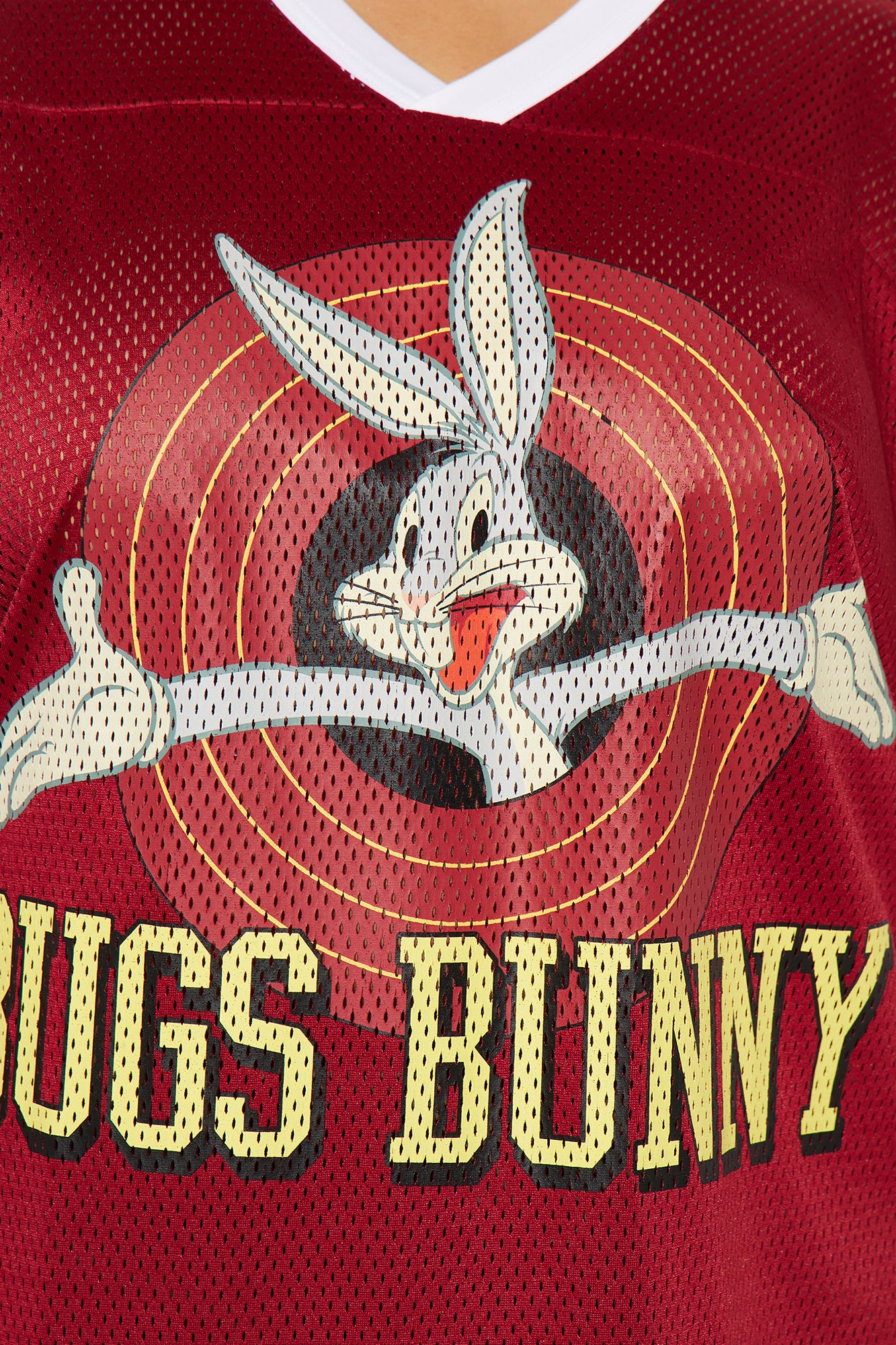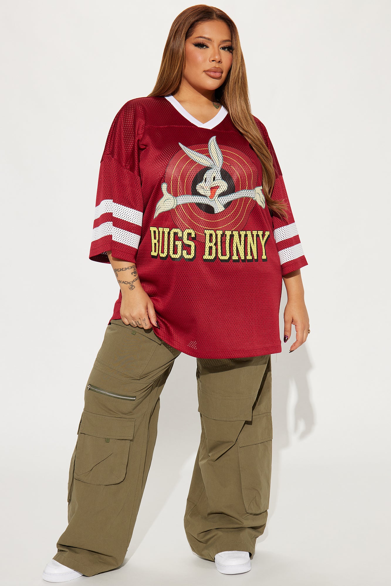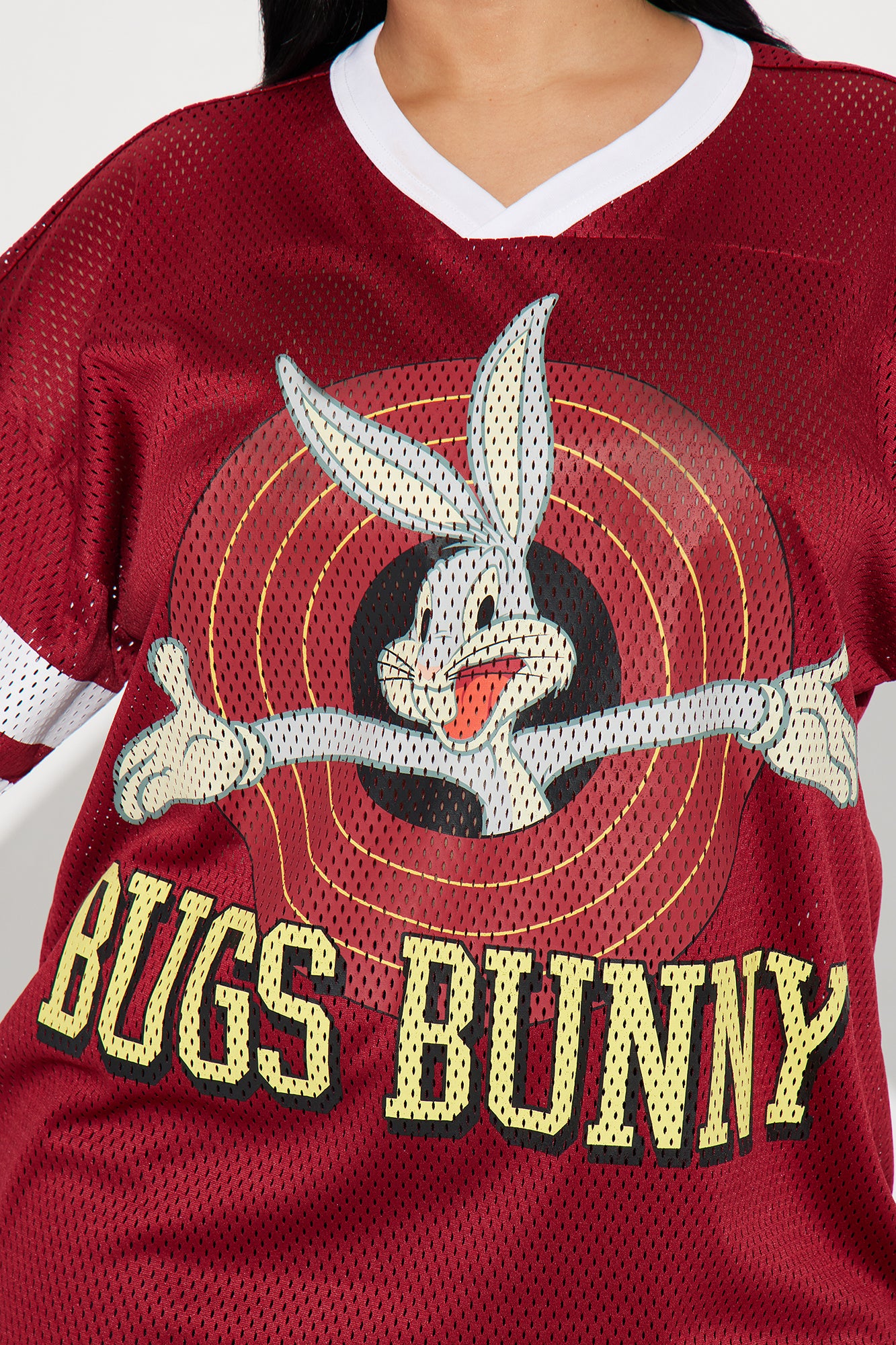 | Available In Red. V-Neck Short Sleeve Loose Fit Bugs Bunny Graphic Jersey Mesh Disclaimer: Due To The Specialized Screen Printing Process A Difference In Saturation May Occur. Each Garment Is Unique. 100% Polyester Imported |