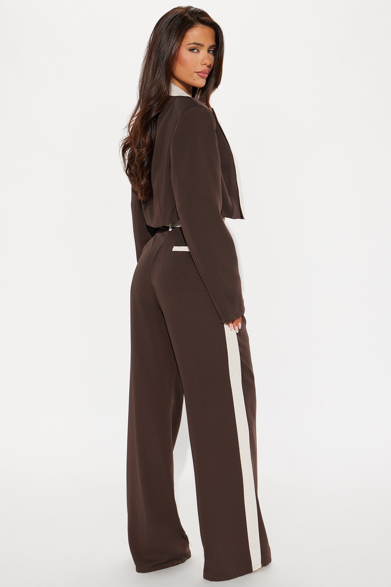 Available In Brown. Pant Set Blazer Contrast Collar Shoulder Pads Lined Wide Leg Pant Clasp And Zipper Closure Pockets Stripe Detail Non Stretch 34" Inseam Self/Contrast: 97% Polyester 3% Spandex Lining: 100% Polyester Imported |