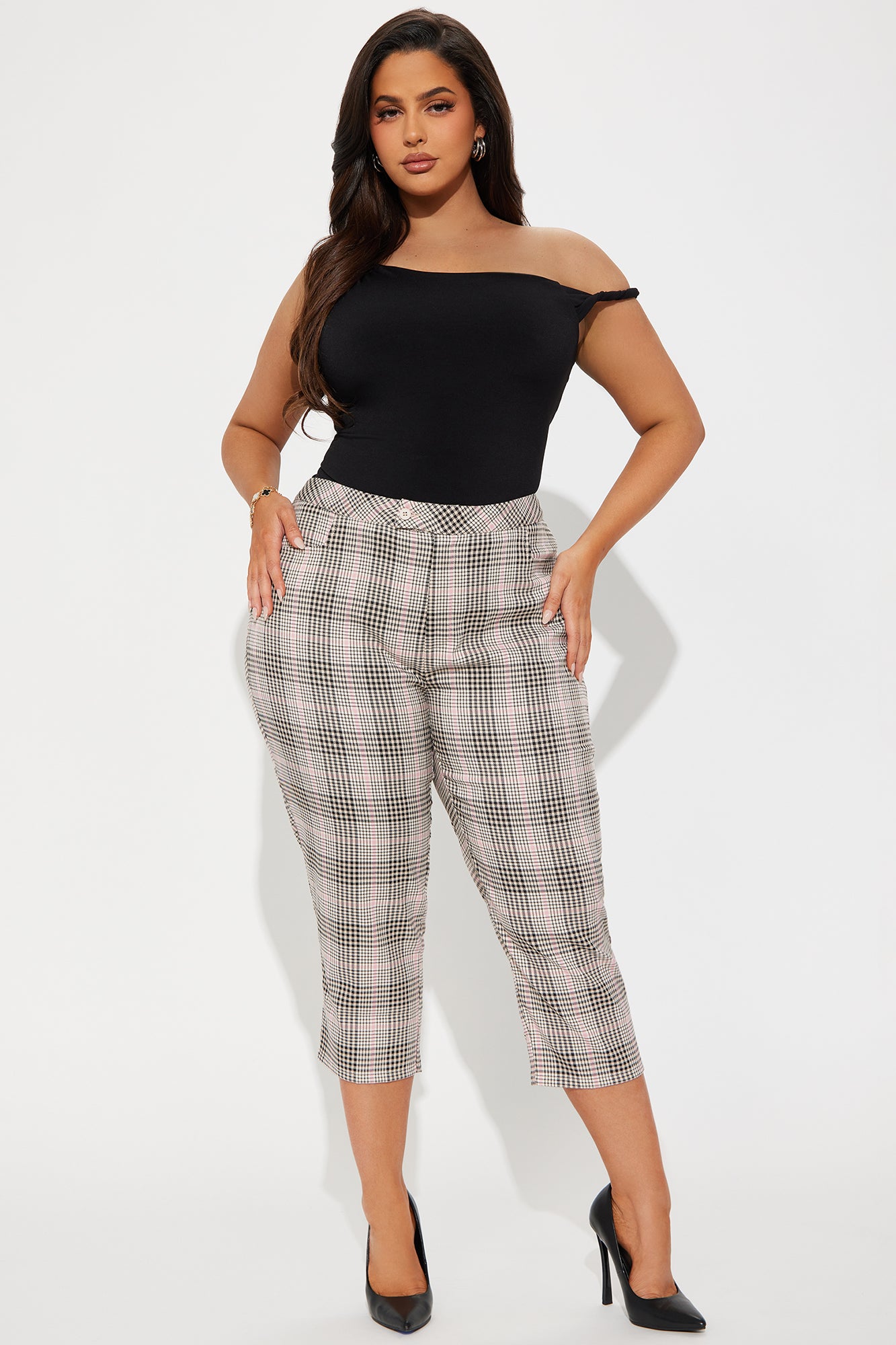 Available In Brown, Mauve, And Black. Capri Pant Mid Rise Double Button & Zip Closure Plaid Non Stretch 19" Inseam Self: 98% Polyester 2% Spandex Imported |