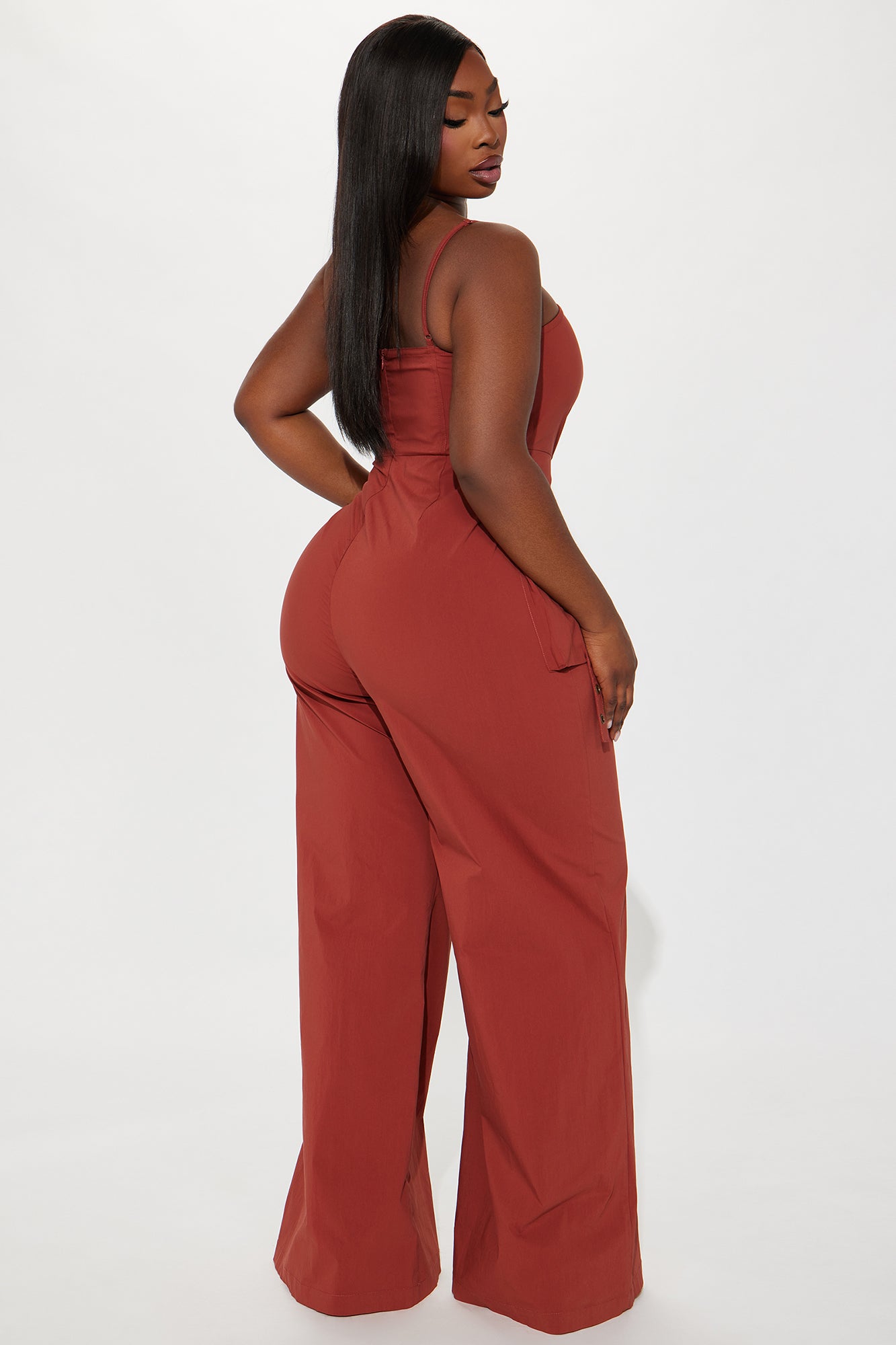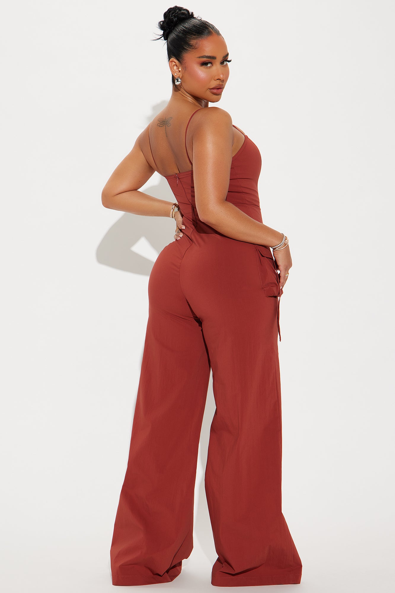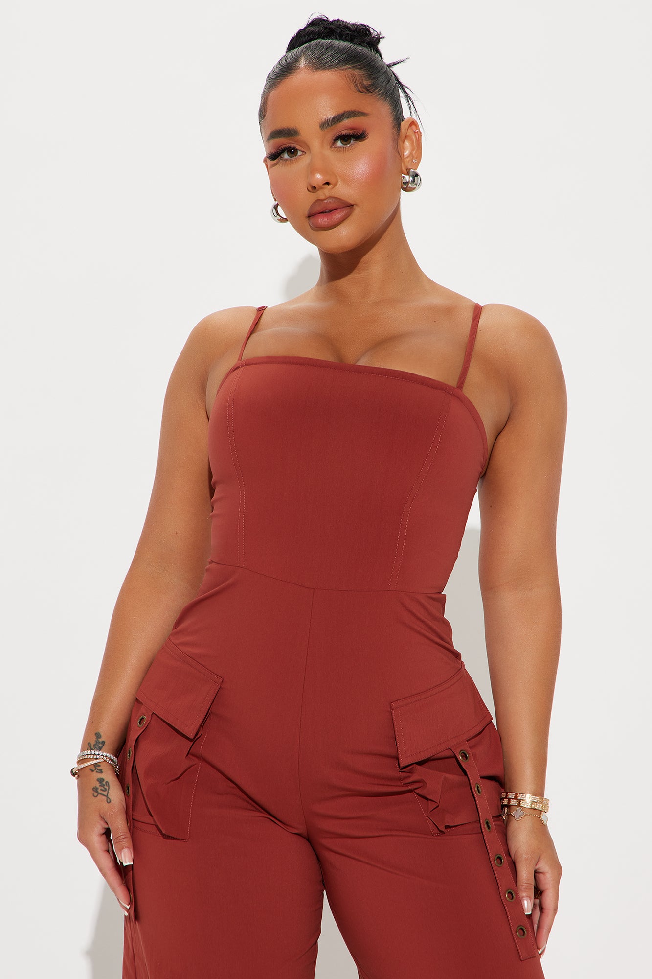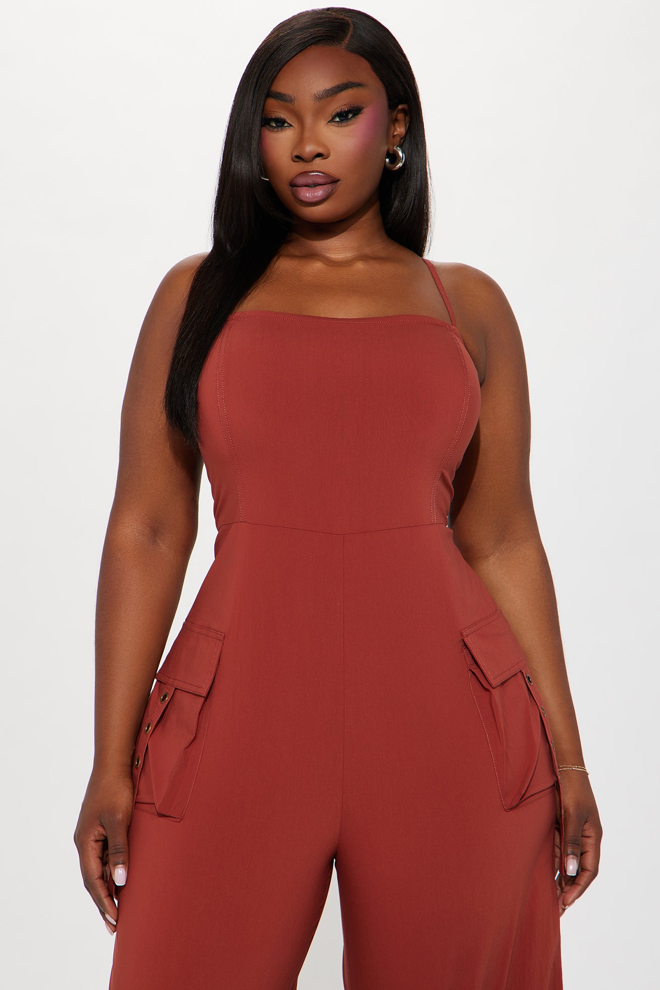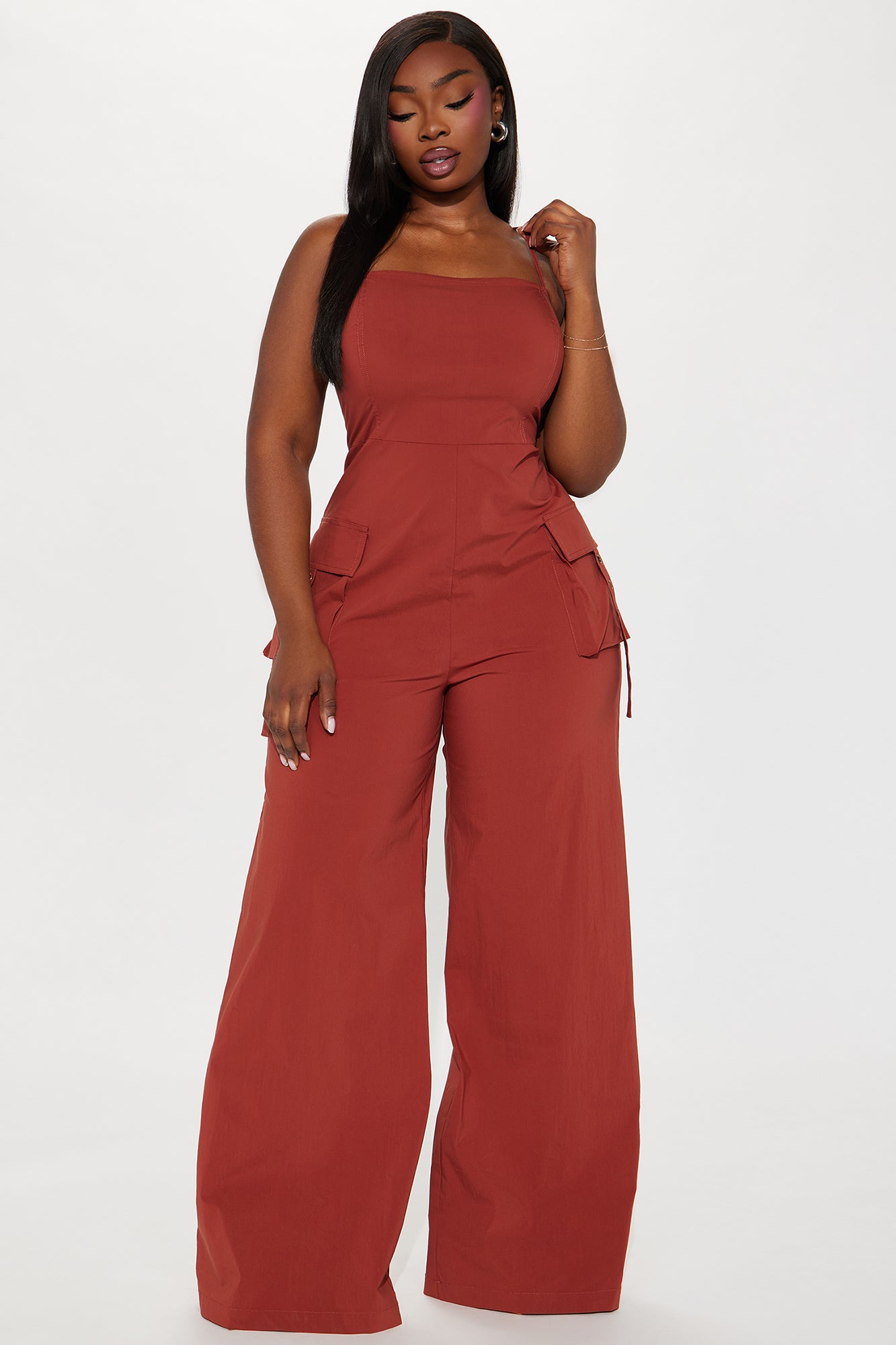 Available In Cognac. Jumpsuit Adjustable Spaghetti Straps Straight Neckline Cargo Pockets Wide Leg Non Stretch Inseam= 34" Self: 70% Cotton 25% Nylon 5% Spandex Imported |