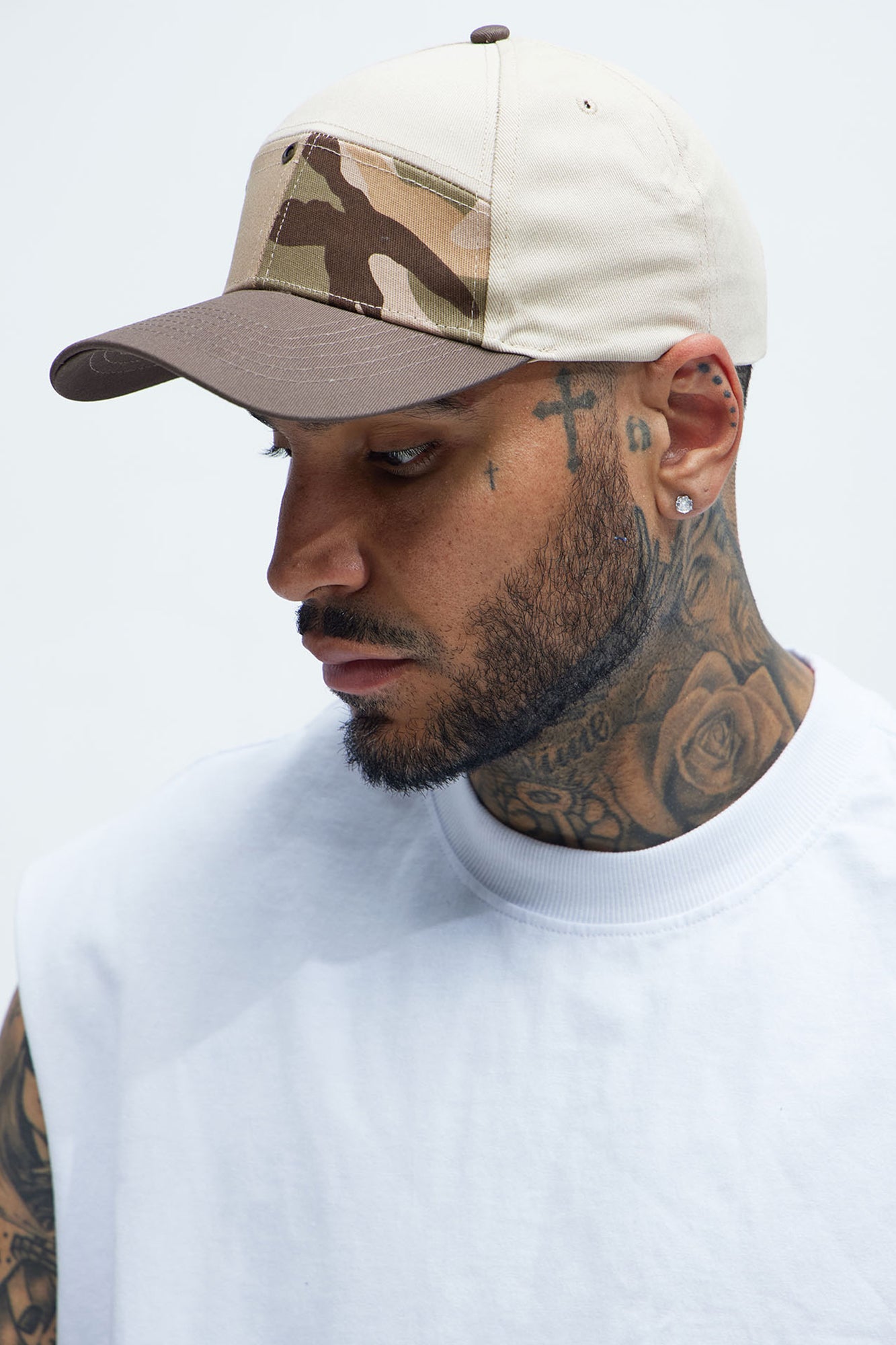 Available In Stone/Combo. 5 Panel Silhouette Brim Slightly Curved Camo Patchwork Detail 100% Cotton Imported |
