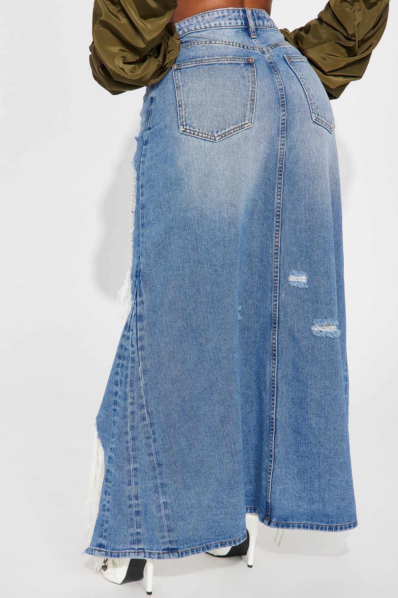 Available In Medium Wash. Denim Maxi Skirt High Rise Button & Zip Closure Distressed Detail High Low Hem Non Stretch Disclaimer: Due To The Specialized Wash & Distressing Process, Each Garment Is Unique 100% Cotton? Imported |