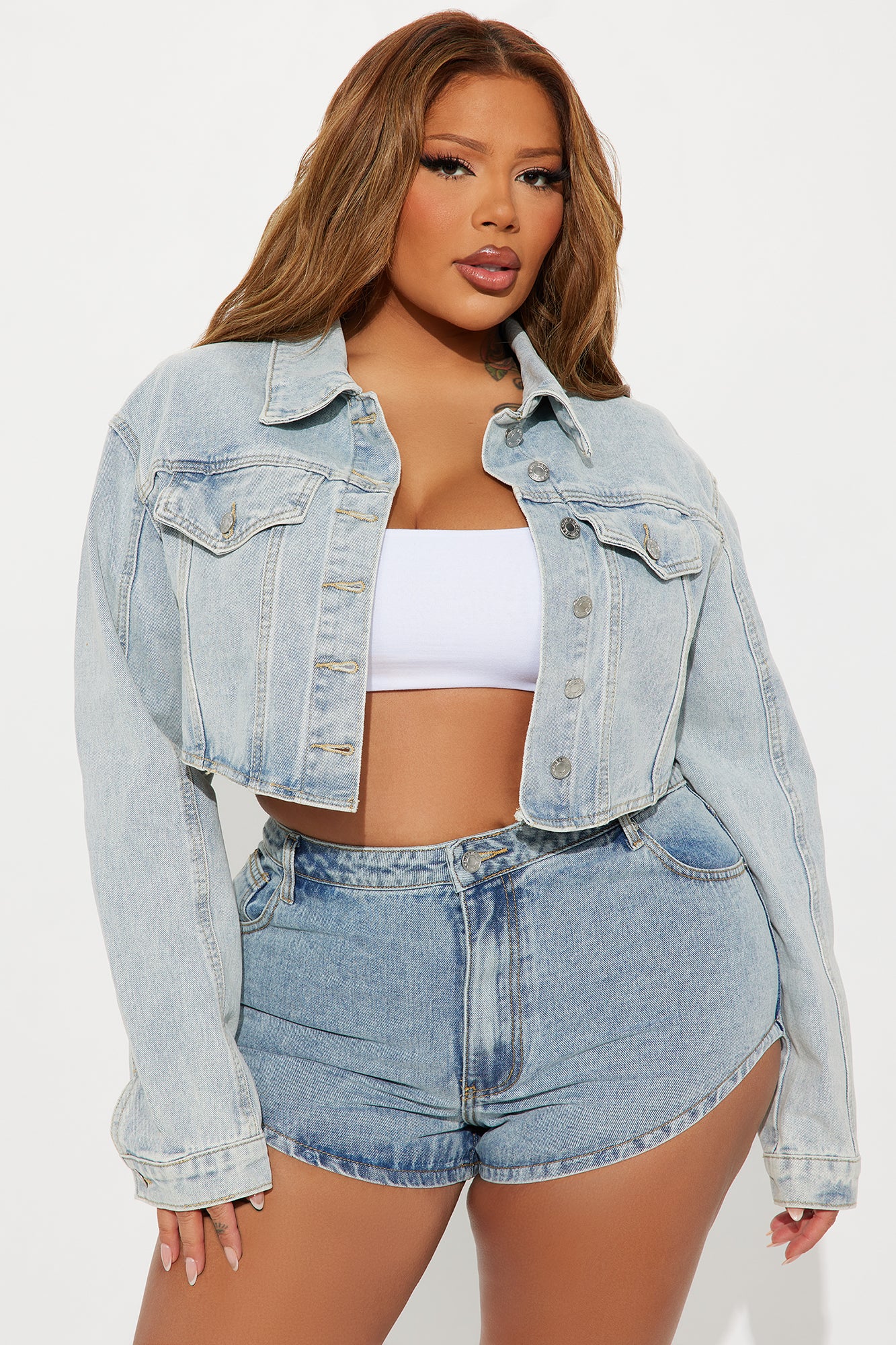 Pair With Can't Move On Denim Shorts Available In Light Wash. Denim Jacket Cropped Collared Faux Pockets Long Sleeve Non Stretch Disclaimer: Due To The Specialized Wash Process, Each Garment Is Unique. 80% Cotton 10% Viscose 7% Other Fiber 3% Polyester Imported |