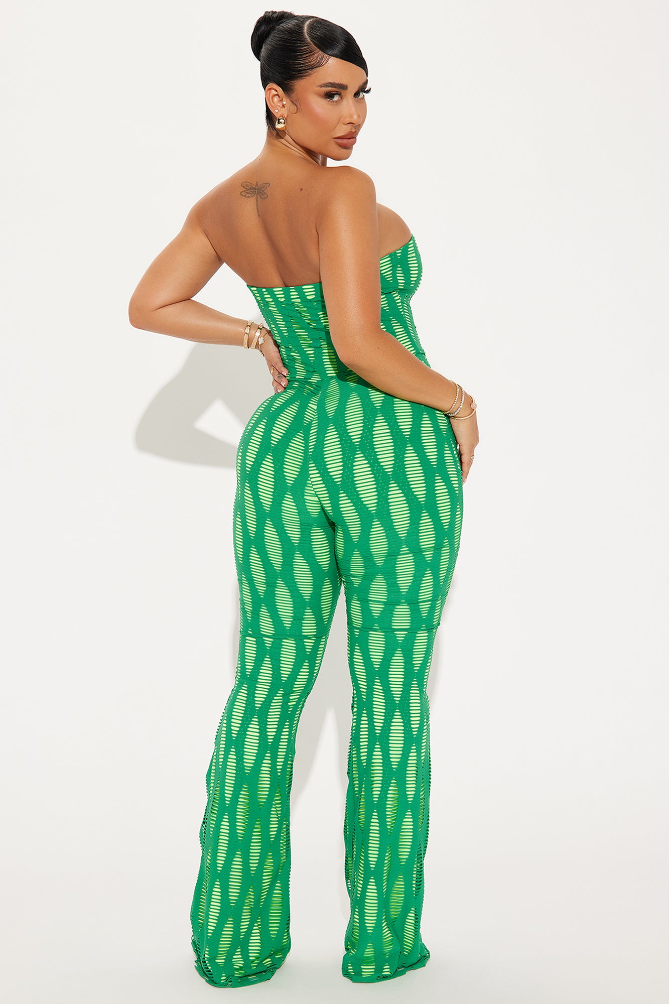 Available In Green/combo. Jumpsuit Strapless Straight Neckline Contrast Wide Leg Stretch Inseam= 33" Disclaimer: Pattern Placement May Vary. Self: 86% Polyester 14% Spandex Lining: 100% Polyester Imported |