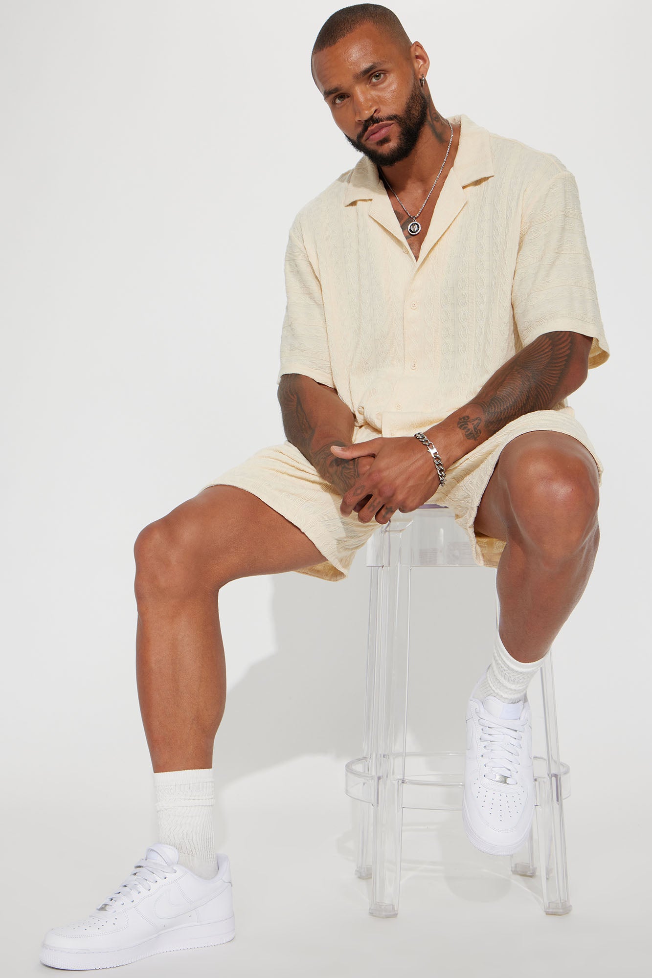 Model Height: 6'2 - Waist: 34 - Wearing Large Available In Cream. Elastic Waist Drawstring Side Pockets Pair With "Check My Bank Statement Short Sleeve Button Up" Disclaimer: Pattern Placement May Vary 98% Polyester 2% Spandex Imported |