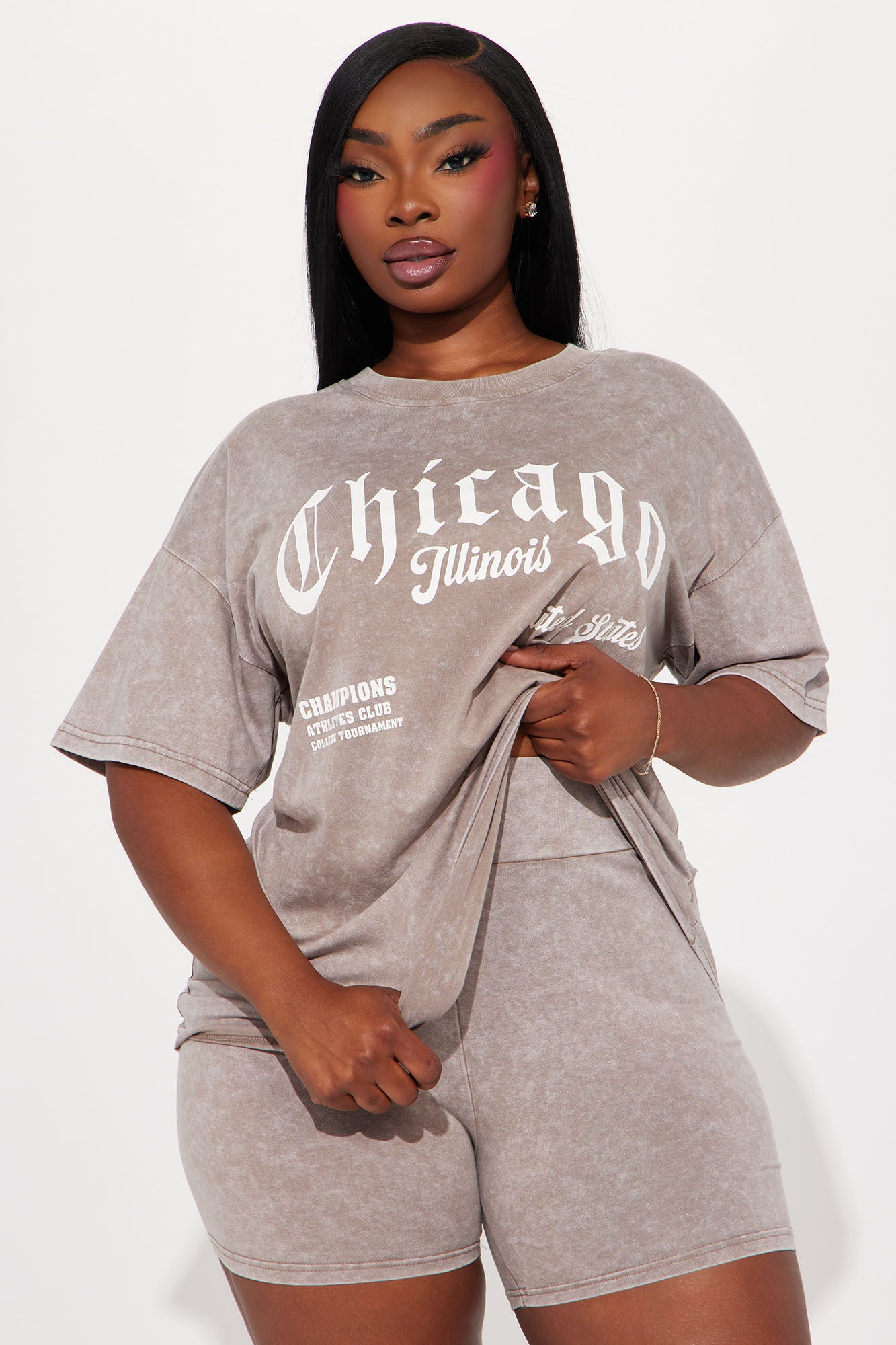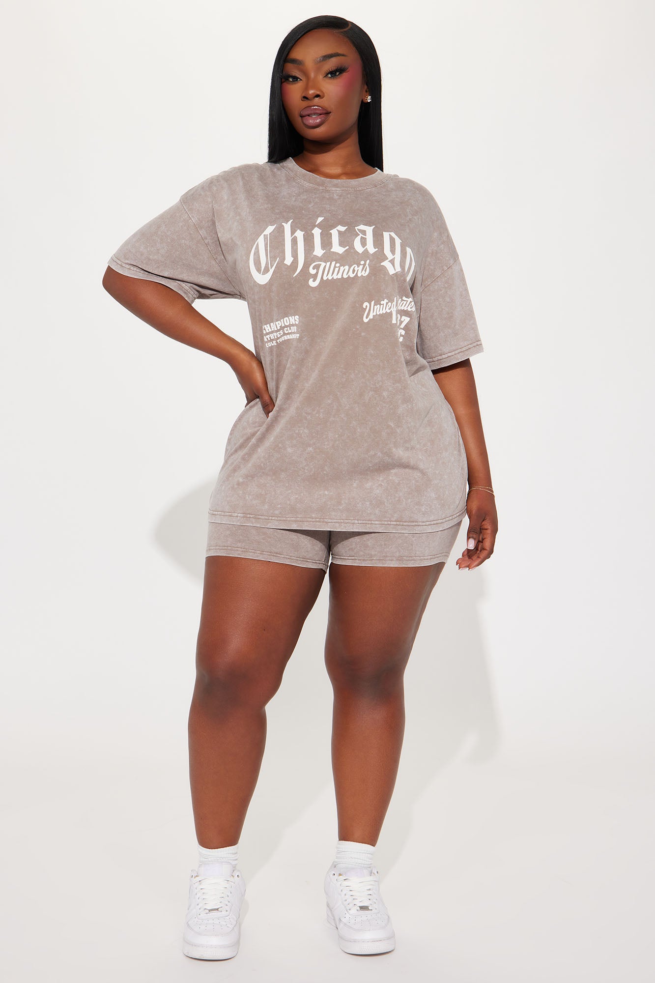 Available In Mocha. Biker Short Set Short Sleeve Oversized Tee Crewneck Biker Shorts Stretch Disclaimer: Due To The Printing Process A Difference In Saturation May Occur. Each Garment Is Unique. Top: 100% Cotton Shorts: 95% Cotton 5% Spandex Imported |
