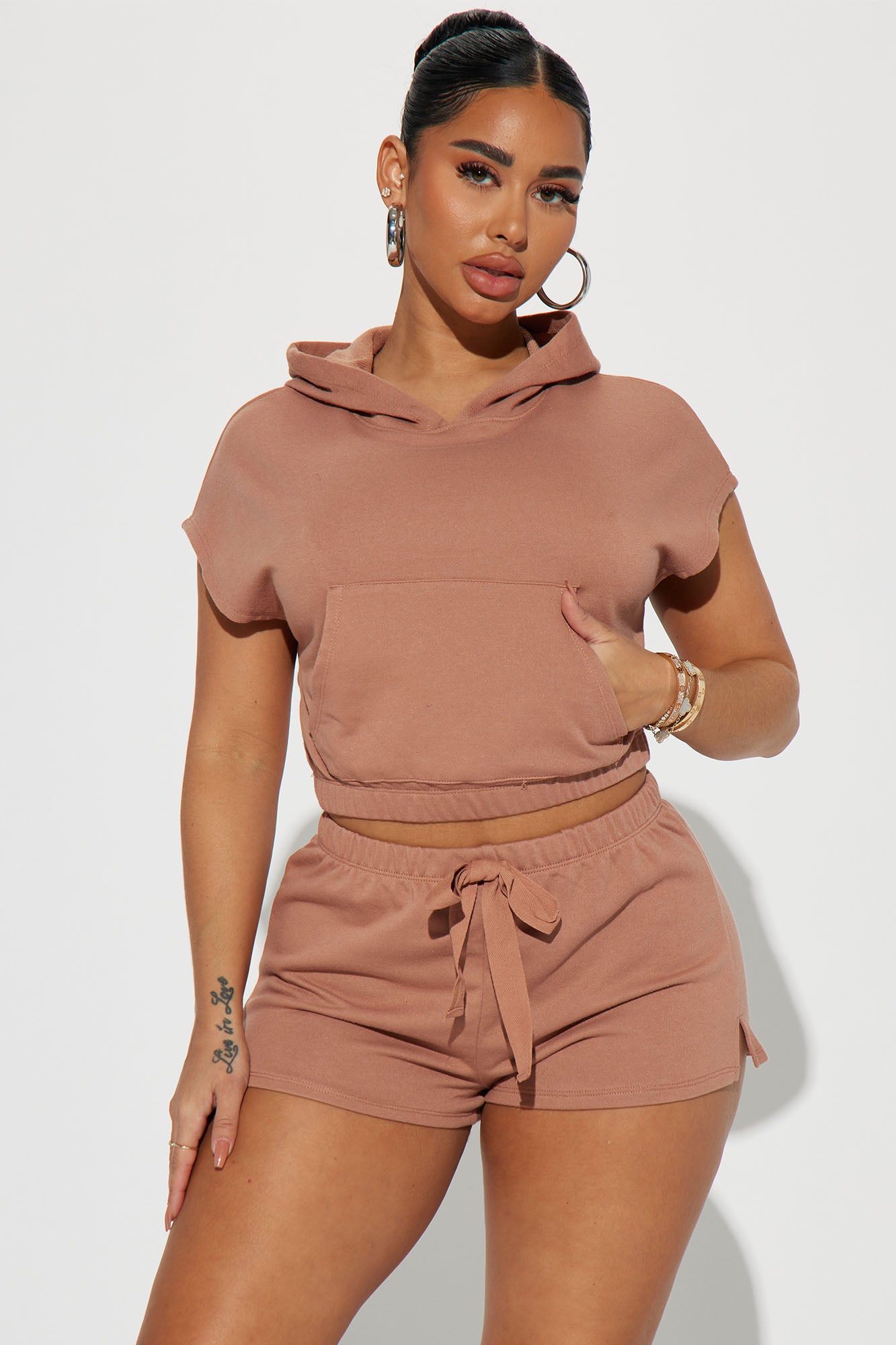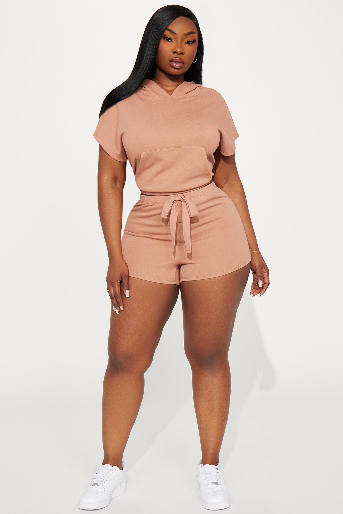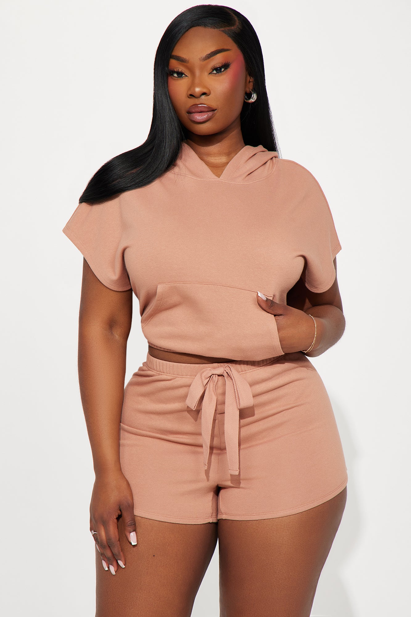 Available In Taupe, Orchid, Heather Grey, And Black. Short Set Short Sleeve Hoodie Kangaroo Pocket Short Tie Front Elastic Waistband Stretch 58% Cotton 42% Polyester Imported |