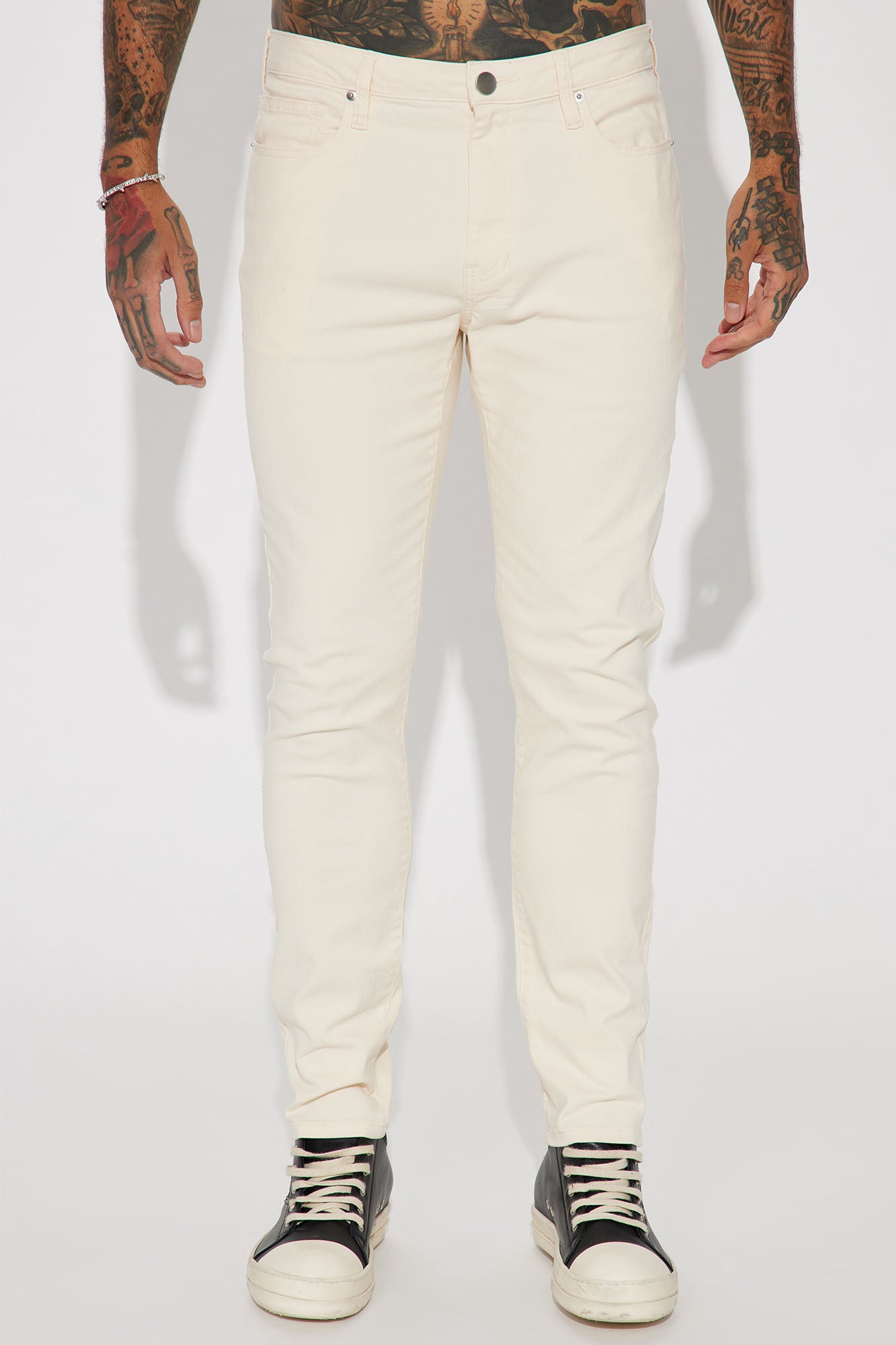 Available In Cream, Black, Burgundy, Charcoal, Brown, Khaki and Light Blue Button Closure Zip Fly 5-Pocket Style Skinny Fit 32 Inseam 98% Cotton 2% Spandex Imported |