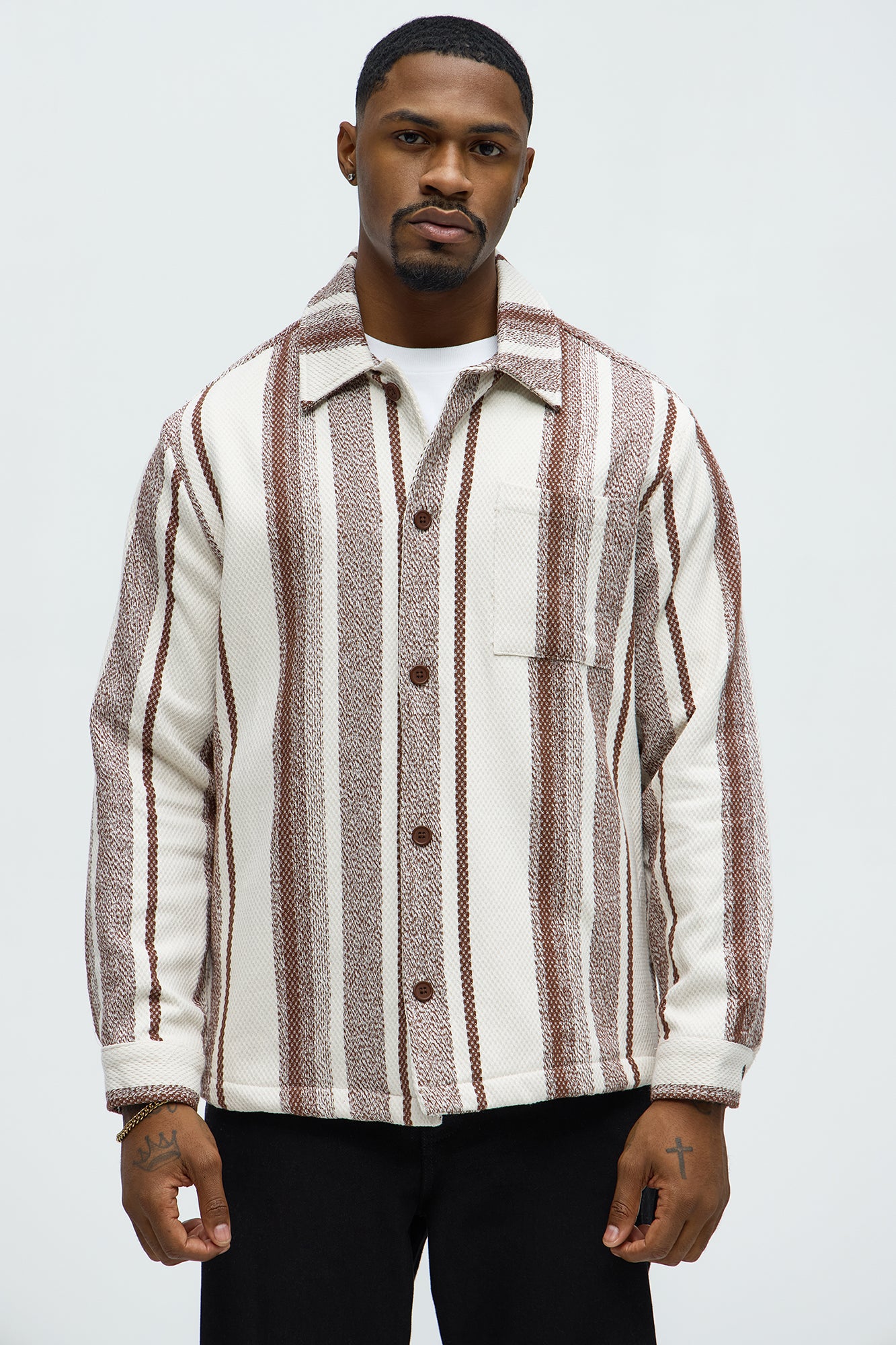 Available In Brown Combo. Fold Down Collar Front Button Closure Left Chest Pocket Button Cuffs Long Sleeves 95% Cotton 3% Viscose 2% Polyester Imported |