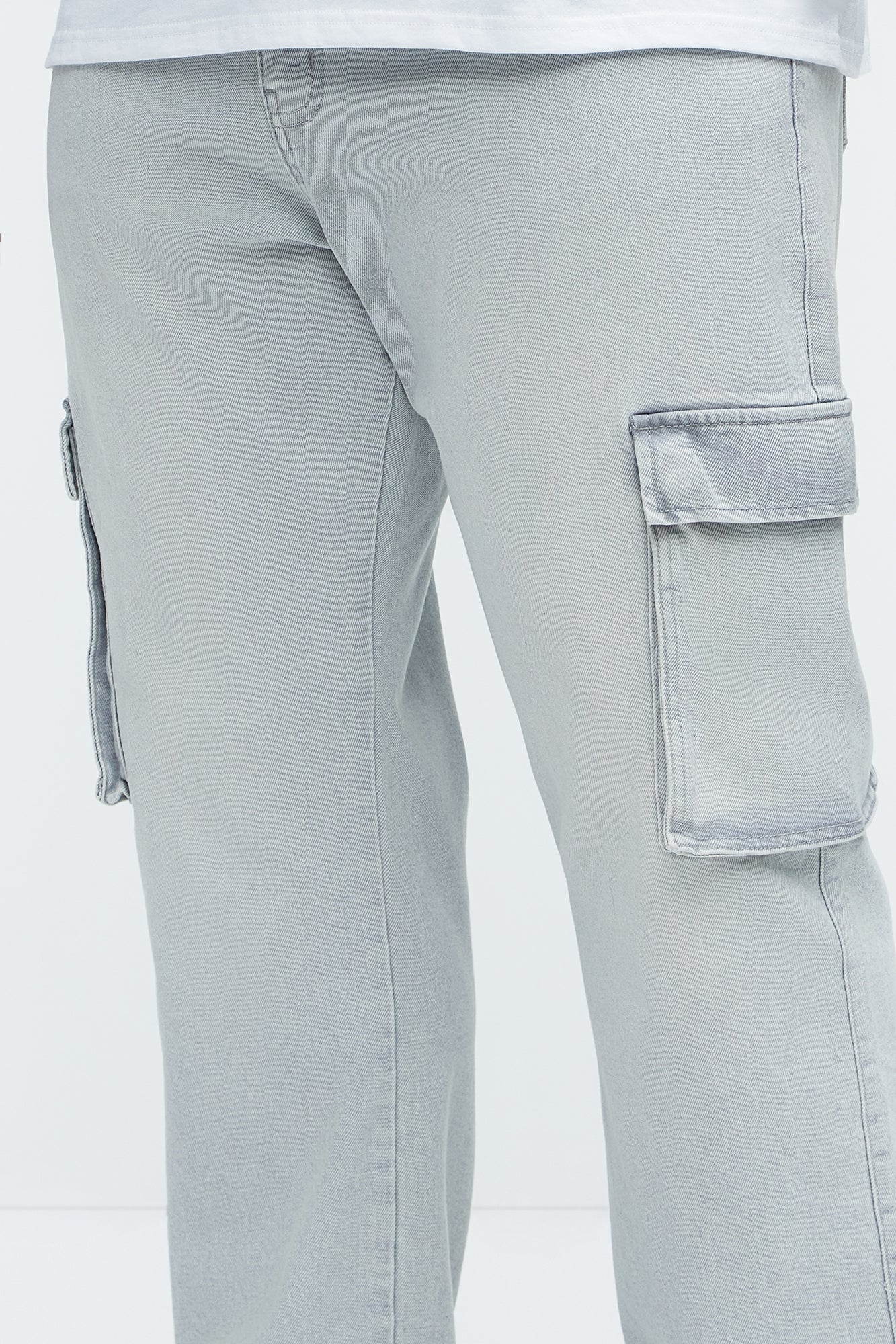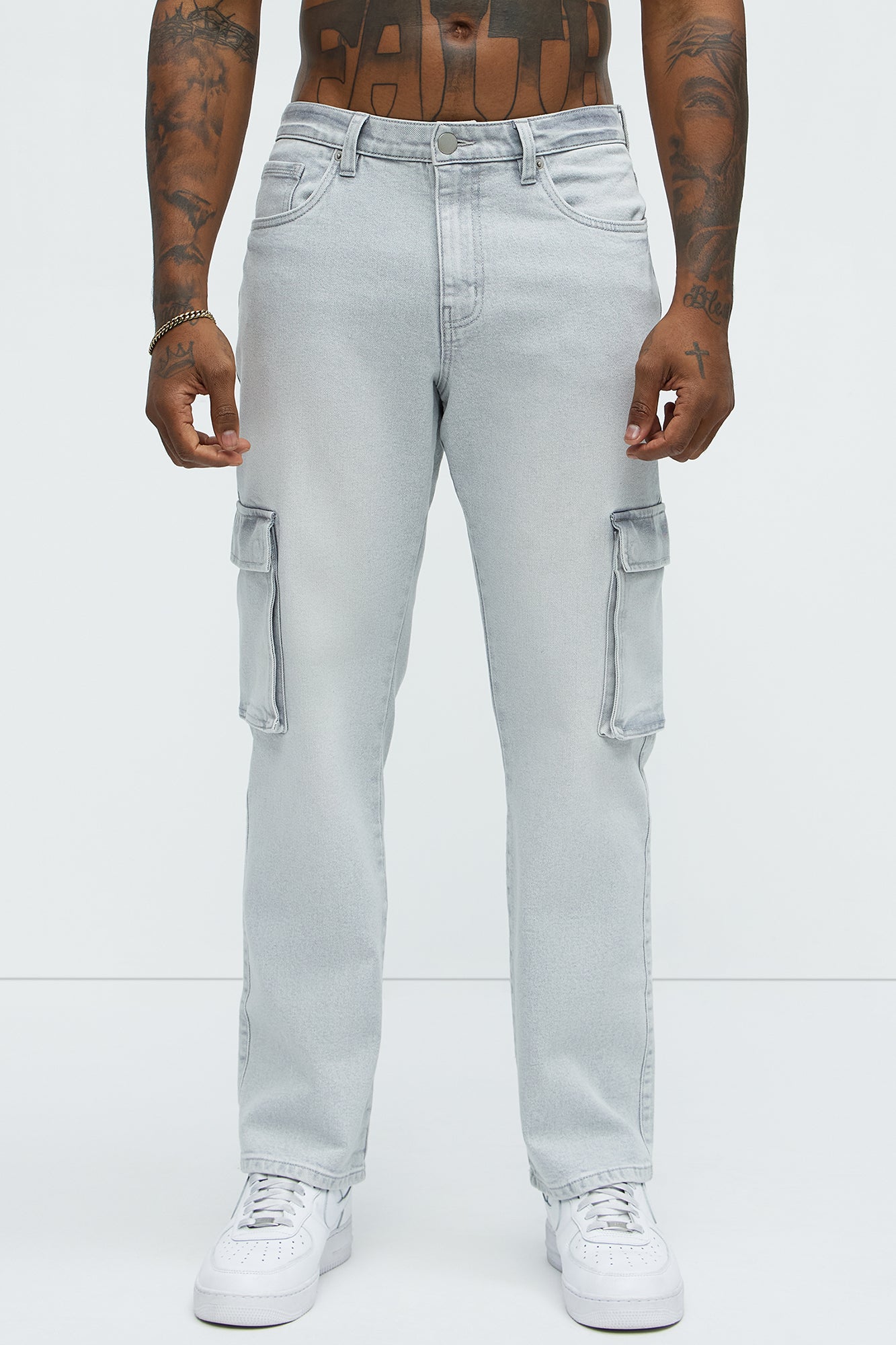 Available In Grey. Straight Fit Zip Fly Button Closure 5 Pocket Detail Cargo Pockets 61% Cotton, 38% Polyester, 1% Spandex Disclaimer: Due To The Specialized Wash Process, Each Garment Is Unique. Imported |