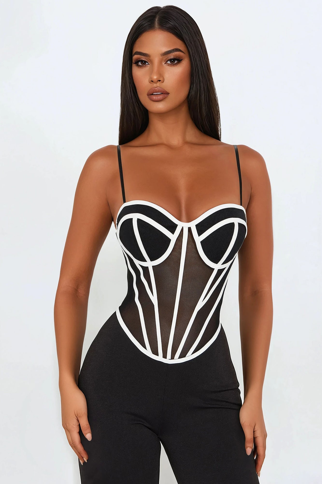 Available In Black/White. Jumpsuit Adjustable Strap Boning In Top Back Zip Closure Wide Leg Stretch Inseam = 34" Self: 95% Polyester 5% Spandex Contrast: 95% Nylon 5% Spandex LIning: 100% Polyester Imported |