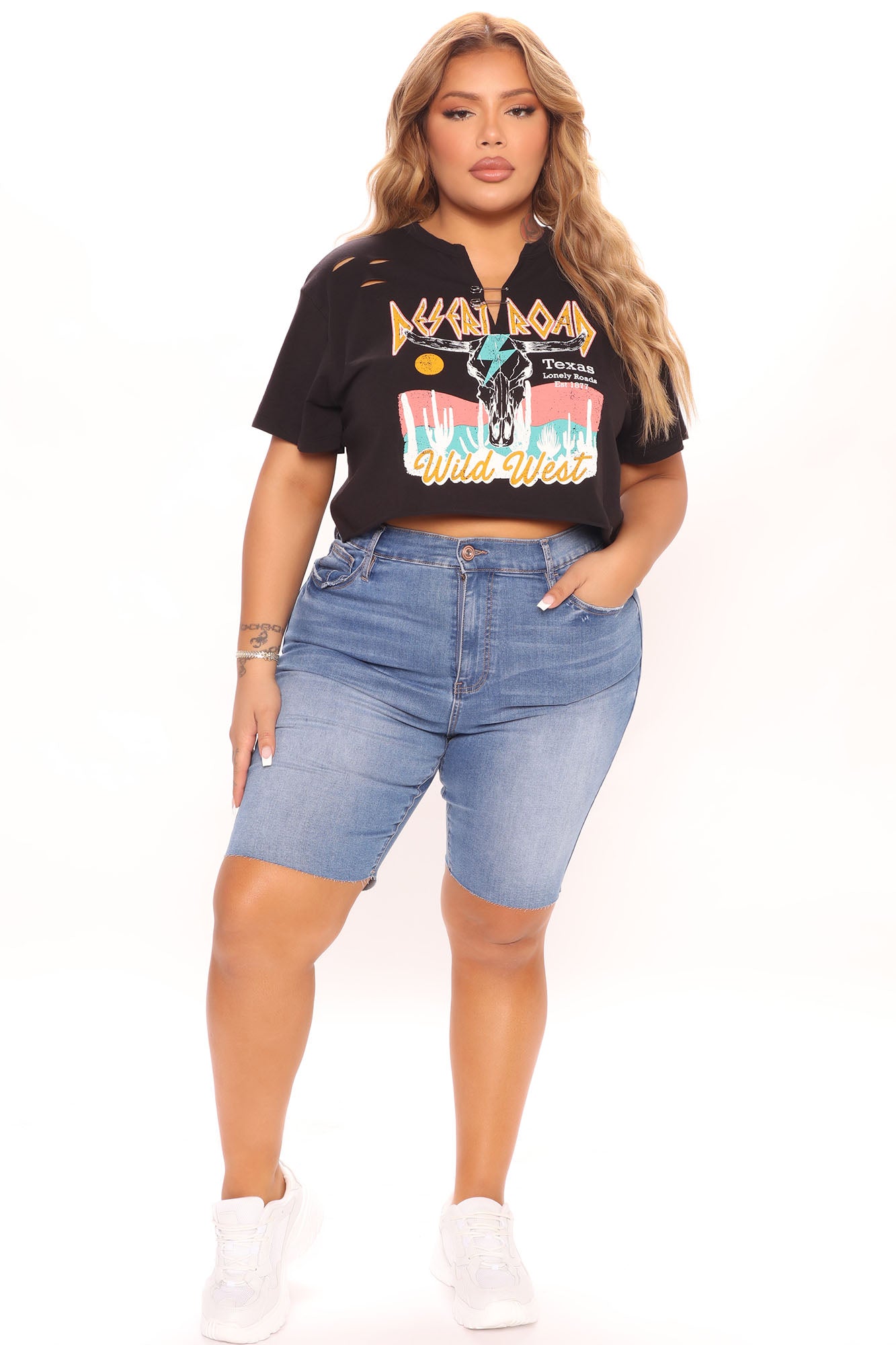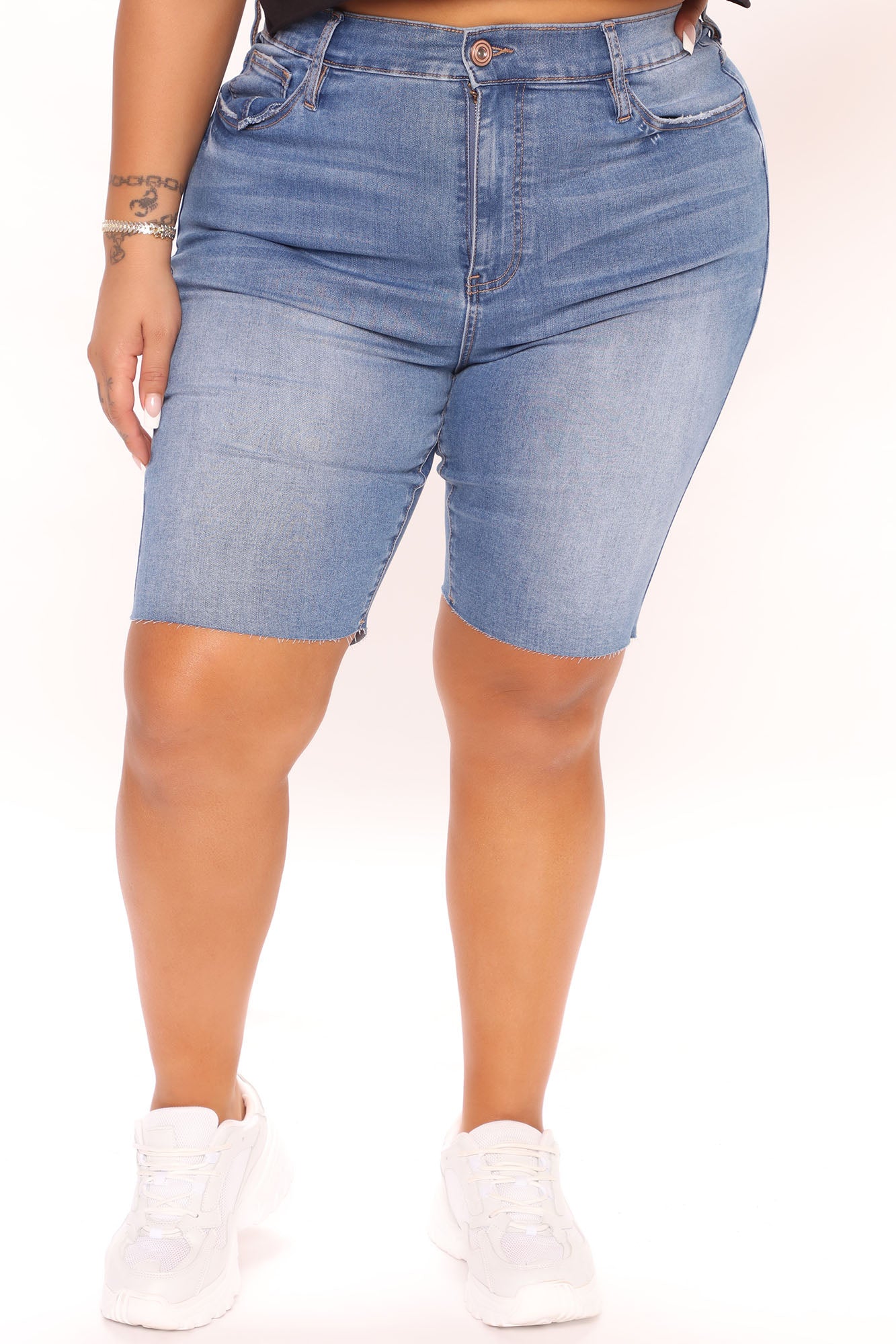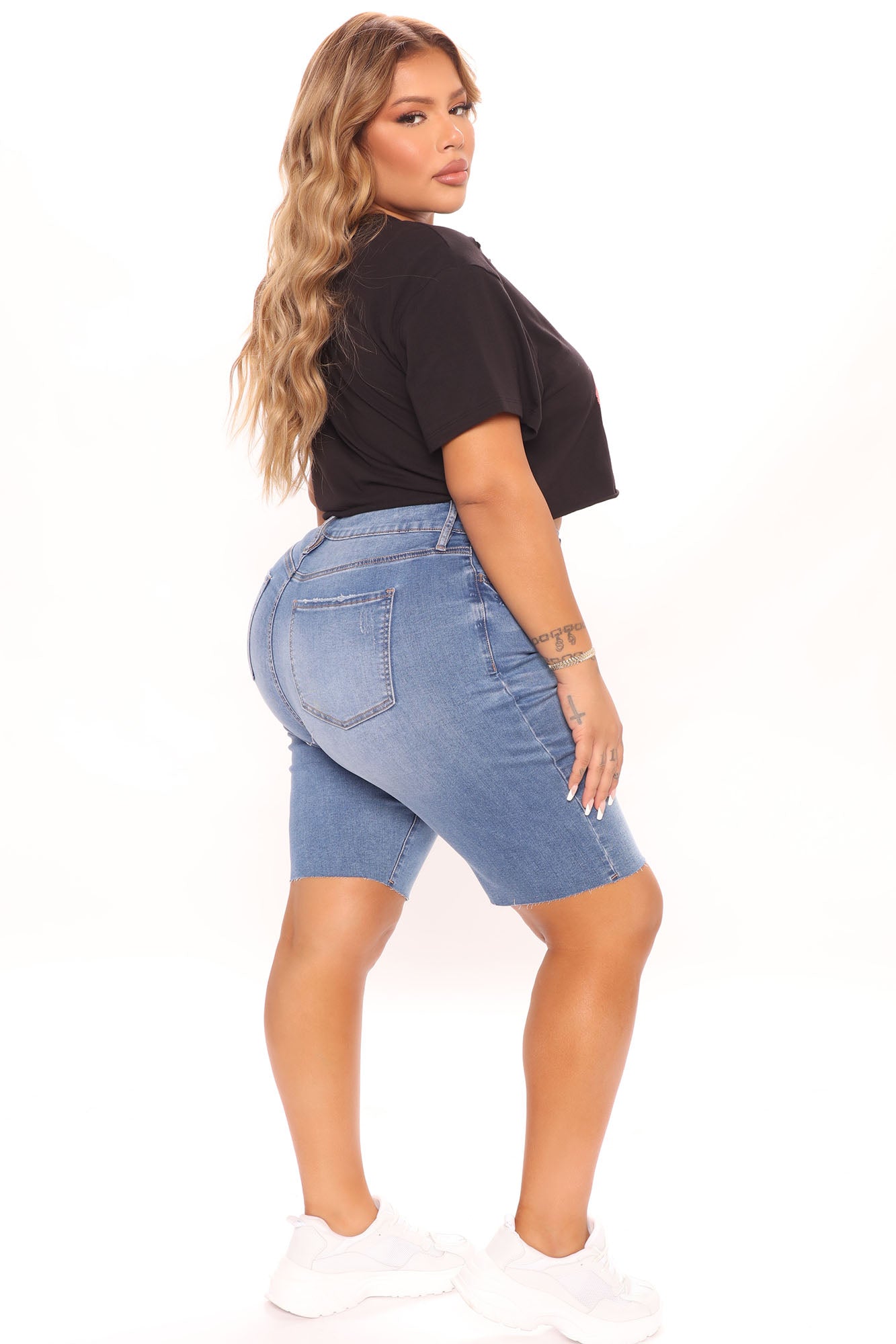 Available In Medium Blue Wash. Denim Bermuda High Stretch Raw Hem 5 Pocket 9" Inseam 10.75" High Rise Disclaimer: Due To The Specialized Wash Process, Each Garment Is Unique. Disclaimer: To Keep The Aesthetic Of This Garment, Please Follow The Care Instructions Carefully. 54% Cotton 27.5% Polyester 16.5% Viscose2% Spandex Imported |