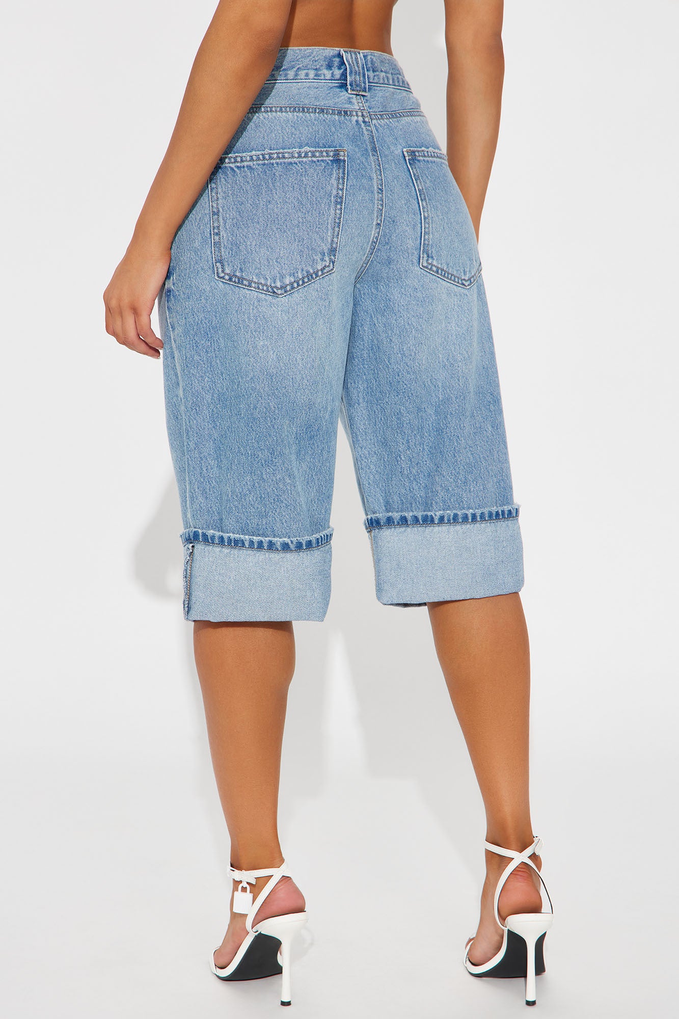 Available In Medium Wash. Denim Short 5 Pocket Cuffed 11" High Rise 14" Inseam Non Stretch Disclaimer: Due To The Distressing Process, Each Garment Is Unique 100% Cotton Imported |