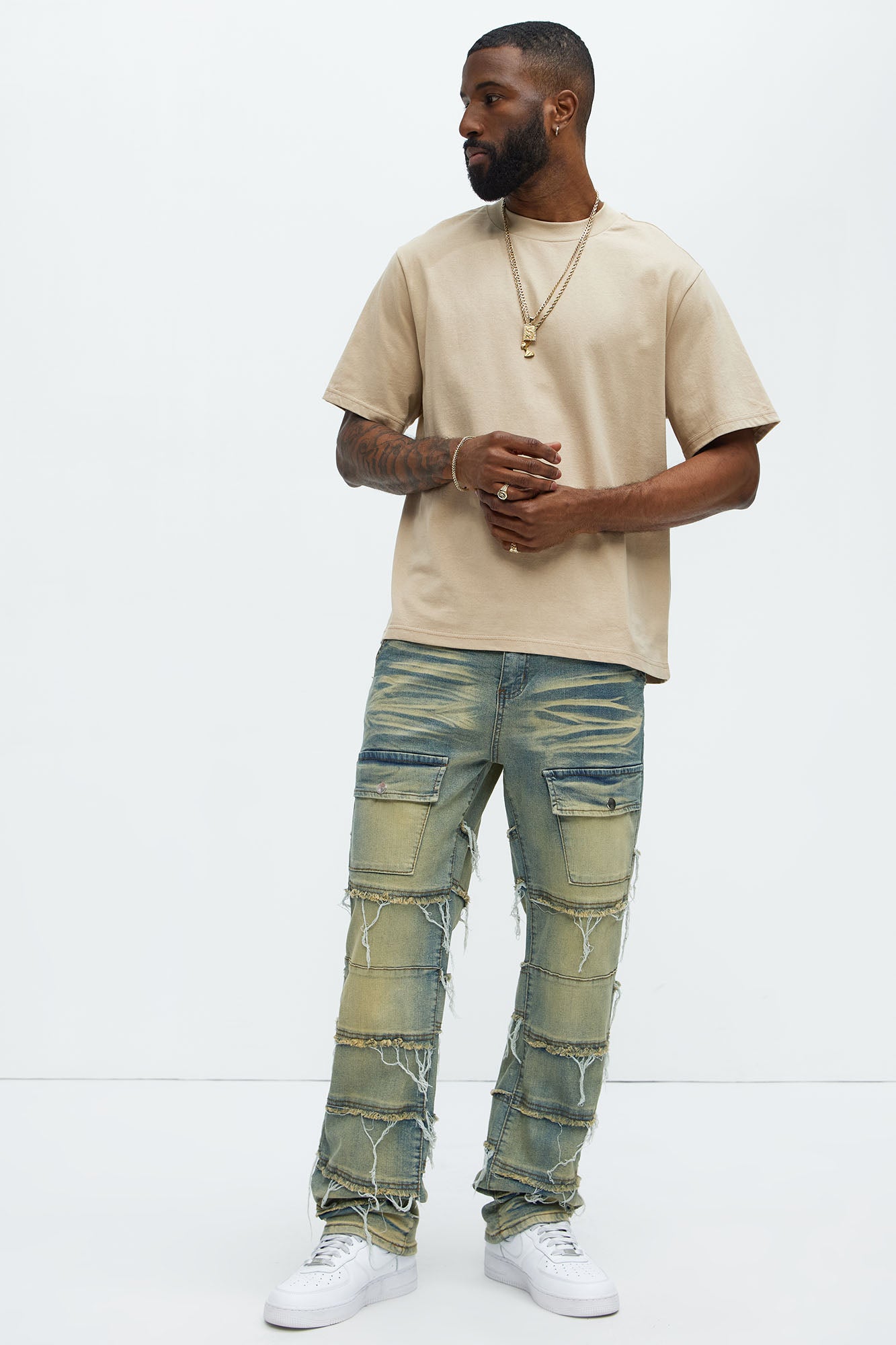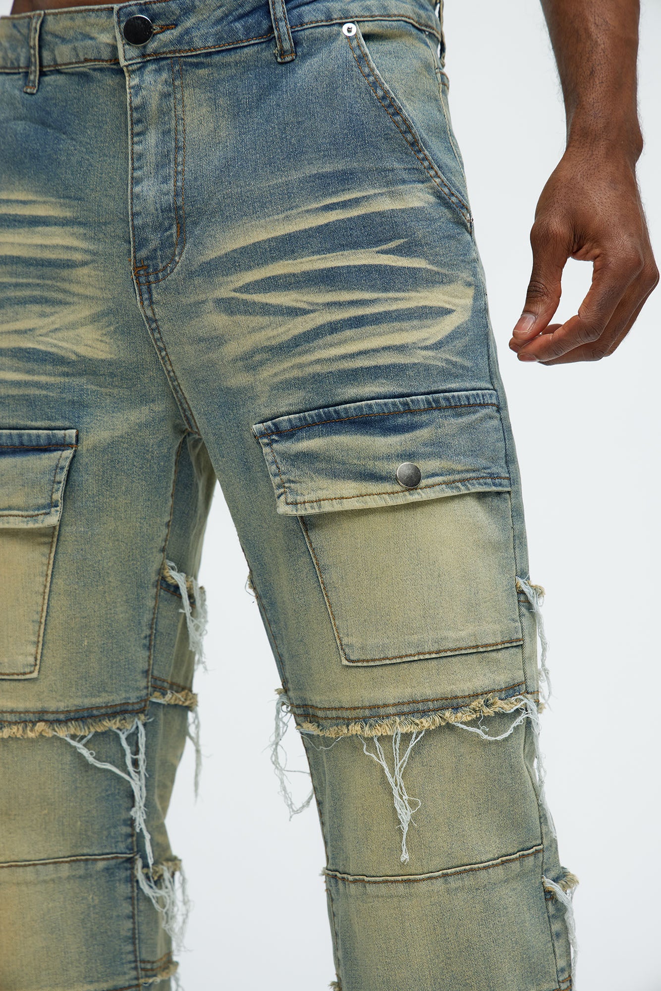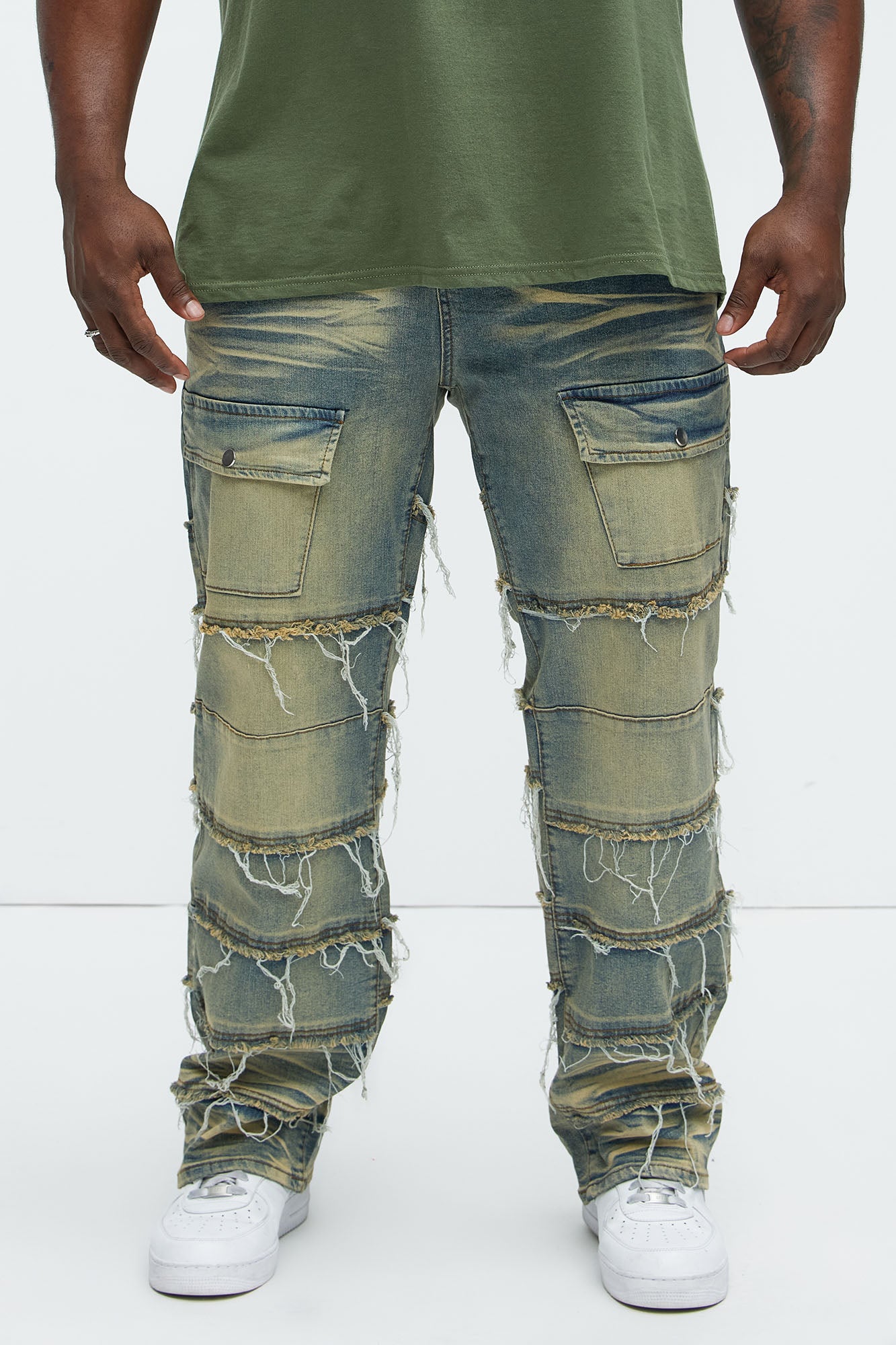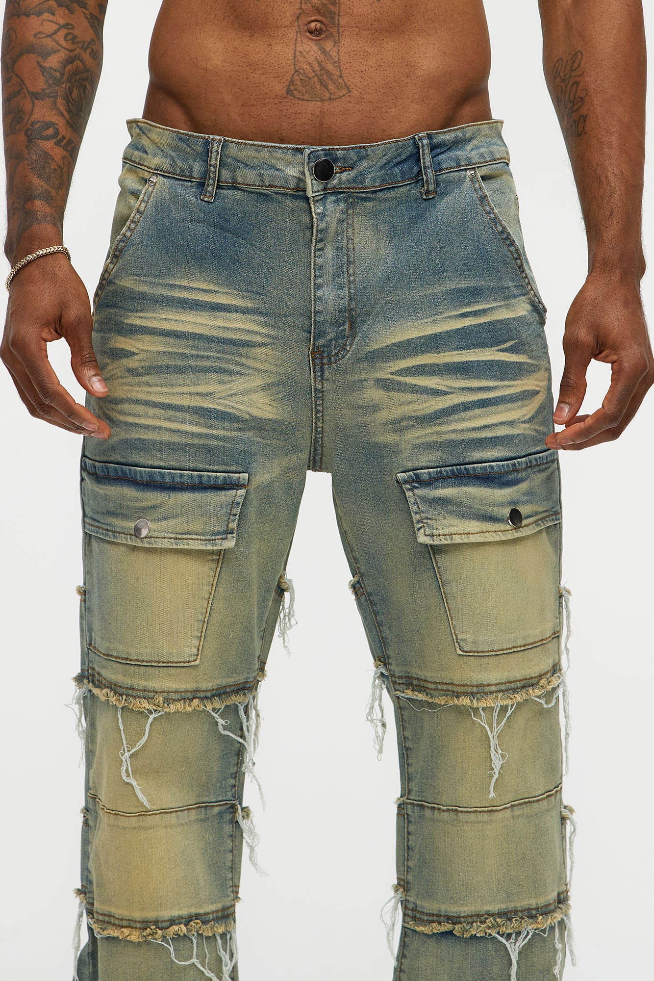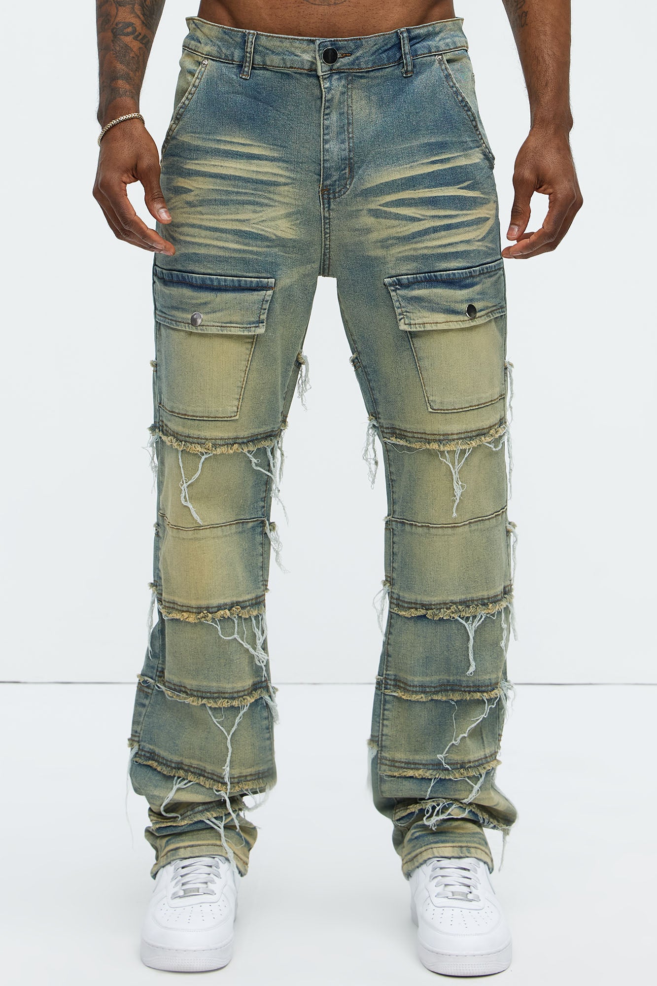 Available In Vintage Blue Wash. Straight Fit Zip Fly Button Closure 5 Pocket Detail Front Pockets With Snap Button Fray Detail Open Hem 82% Cotton, 16% Polyester, 2% Spandex Disclaimer: Due To The Specialized Distressing & Wash Process, Each Garment Is Unique. Imported |