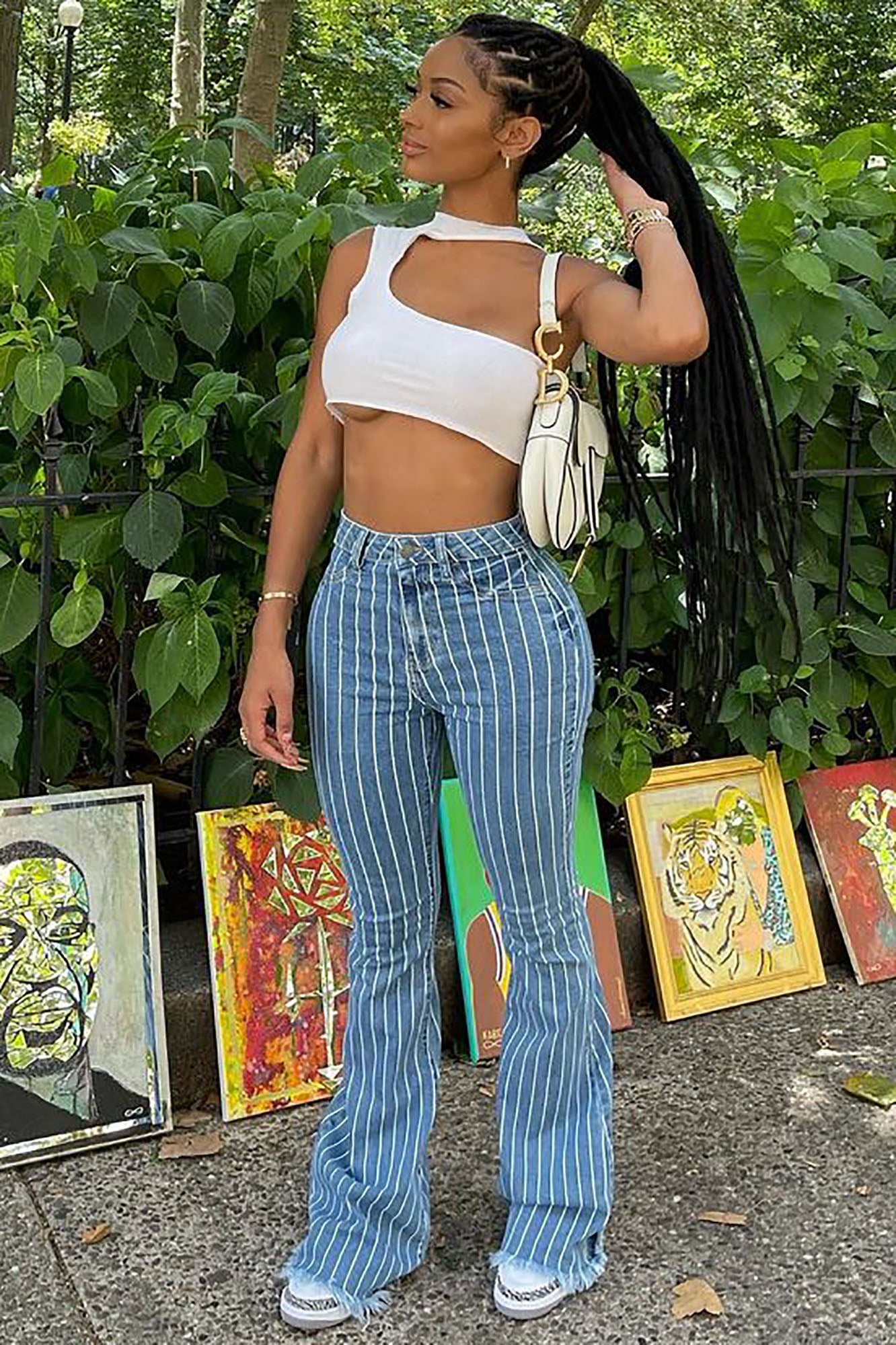 Available In Light Blue Wash. Flare Jean Medium Stretch Striped Faux Front Pockets Functional Back Pockets Fray Hem 11.5" High Rise 34.5" Inseam Disclaimer:Due To The Specialized Wash & Distressing Process, Each Garment Is Unique, andStripe Placement Will Vary 99% Cotton 1% Spandex Imported |