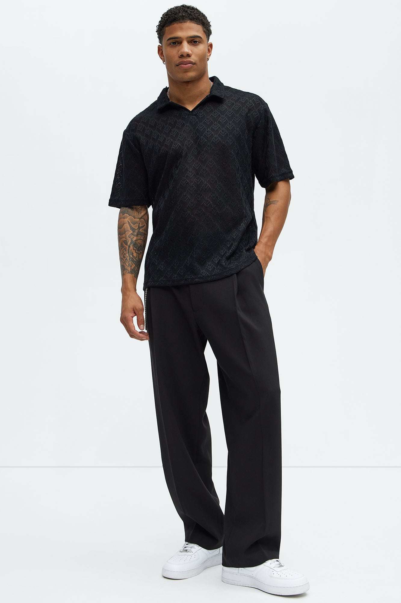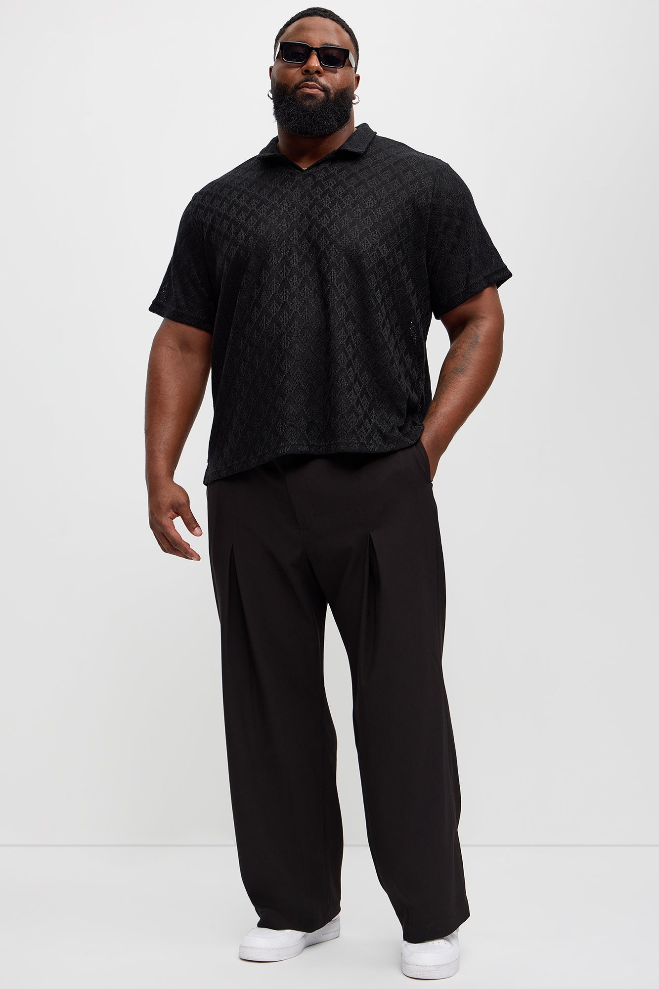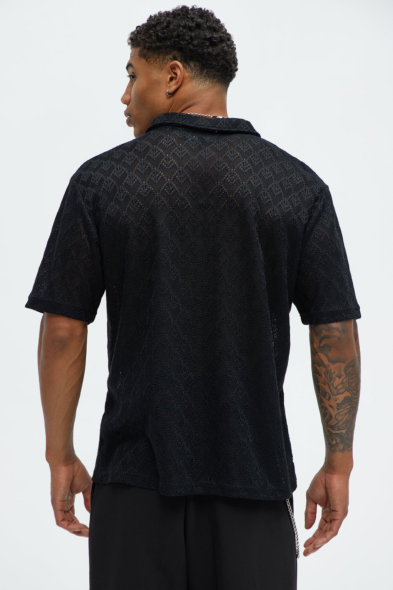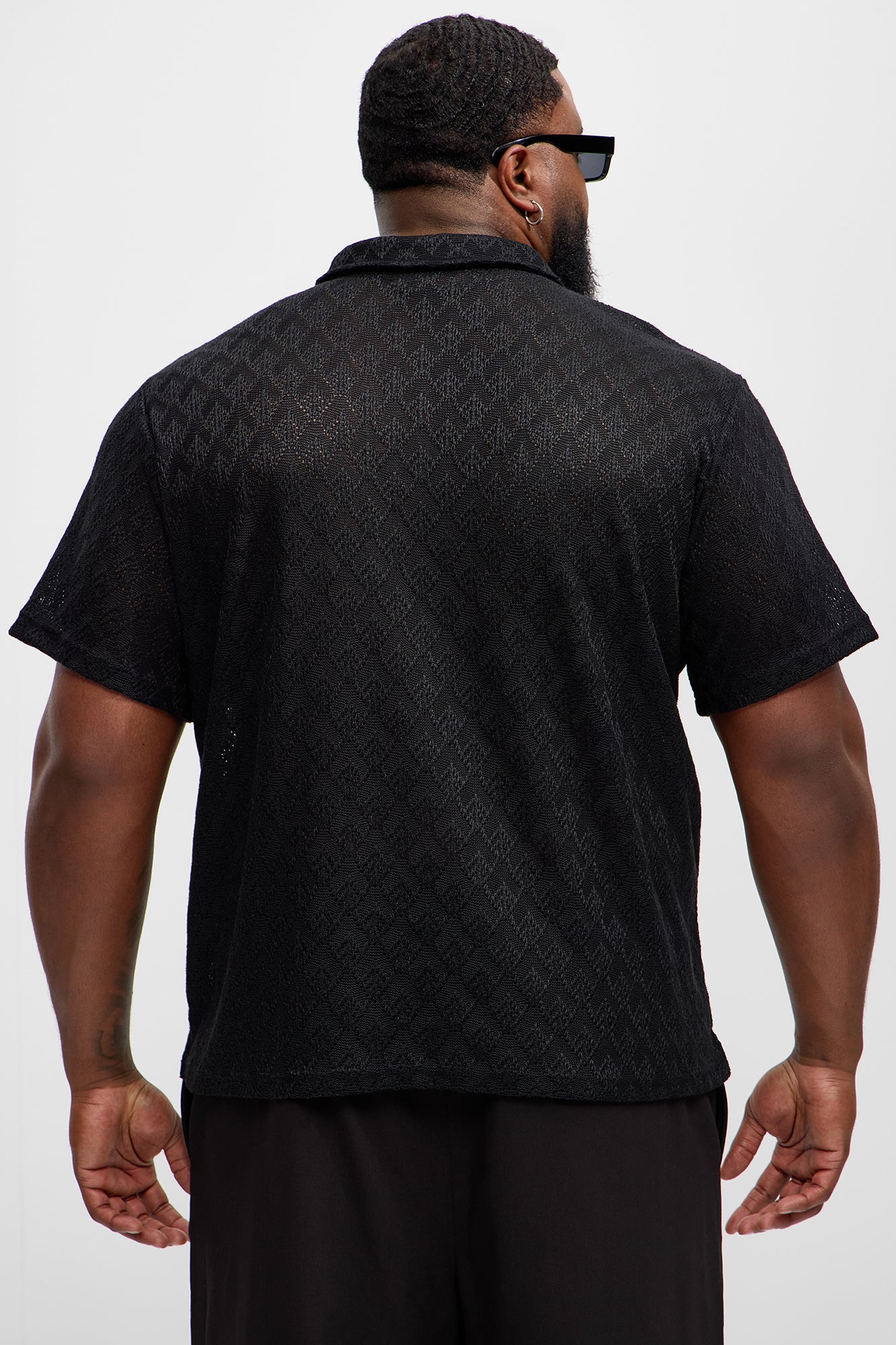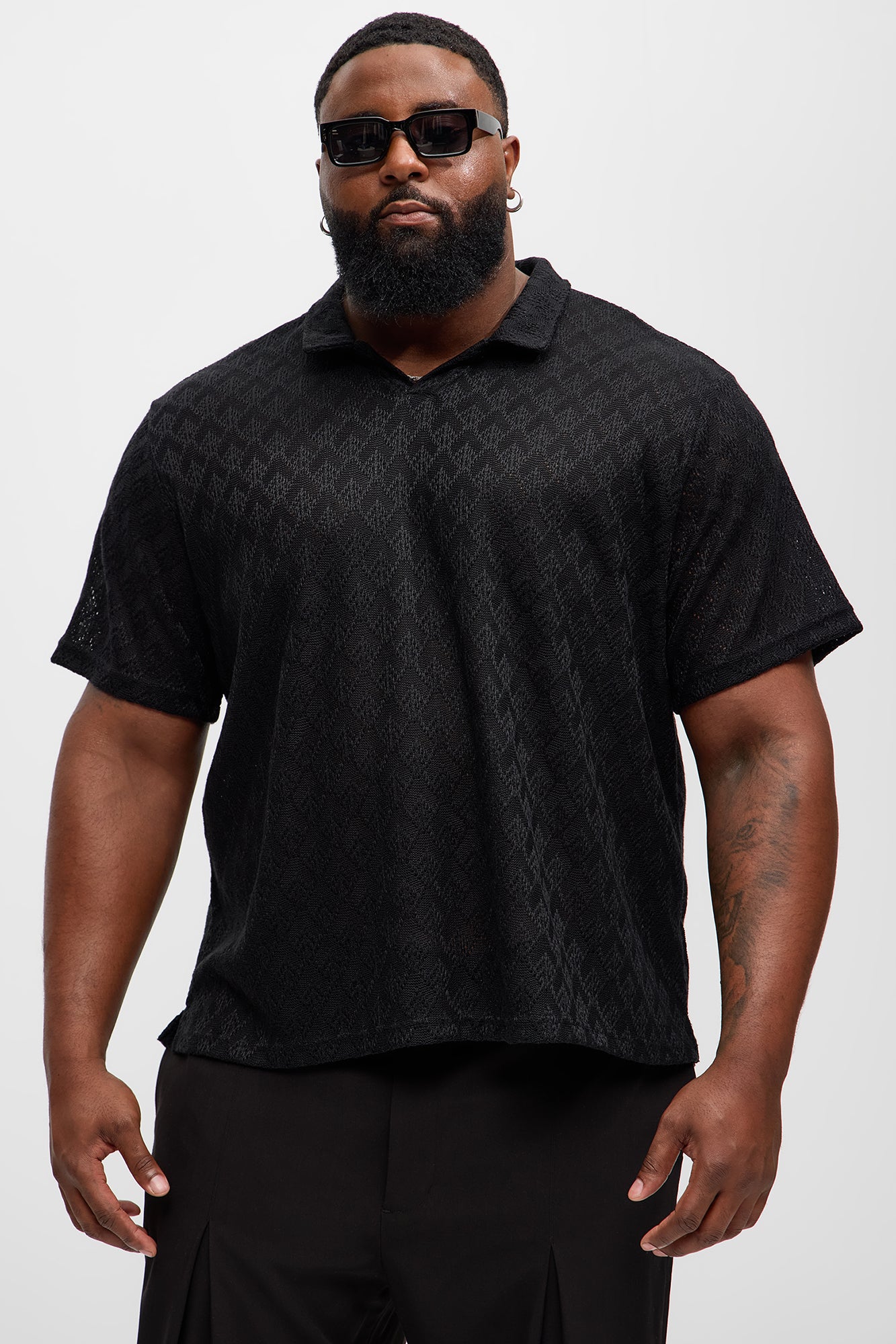 Available In Black. Johnny Collar Textured Diamond pattern Short Sleeve 100% Polyester Disclaimer: This garment has been made with delicate materials and may snag or pull if jewelry or watches are worn. Do not wash with items that may cause snagging such as zippers or hooks. This garment is unique and must be handled with care. Imported |