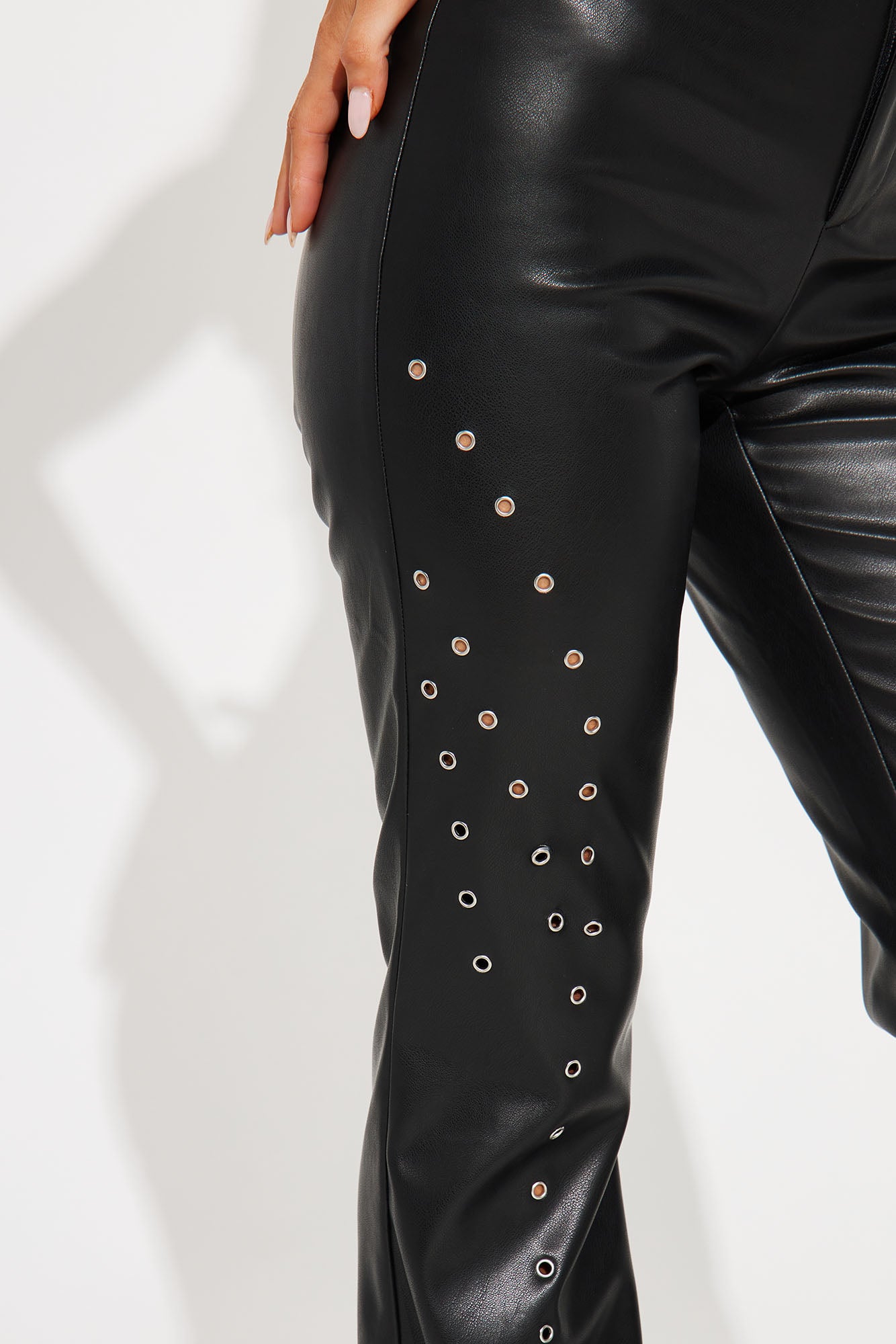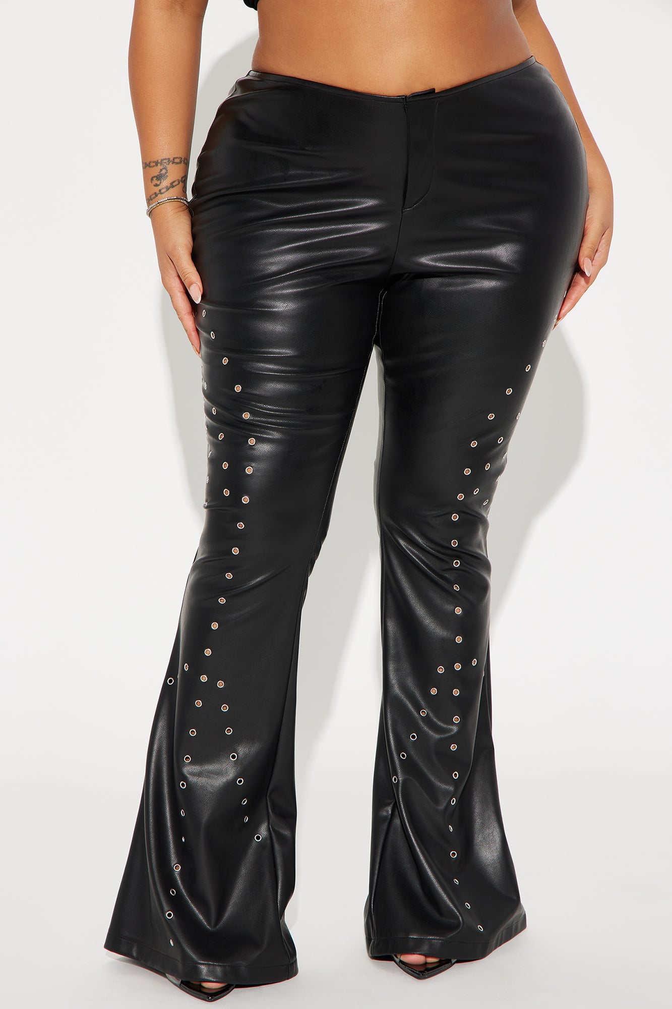 Available In Black. Flare Pant Low Rise Hidden Front Zip Closure Grommet Detail Faux Leather Stretch 32" Inseam Self: 55% Polyurethane 45% Polyester Imported  |