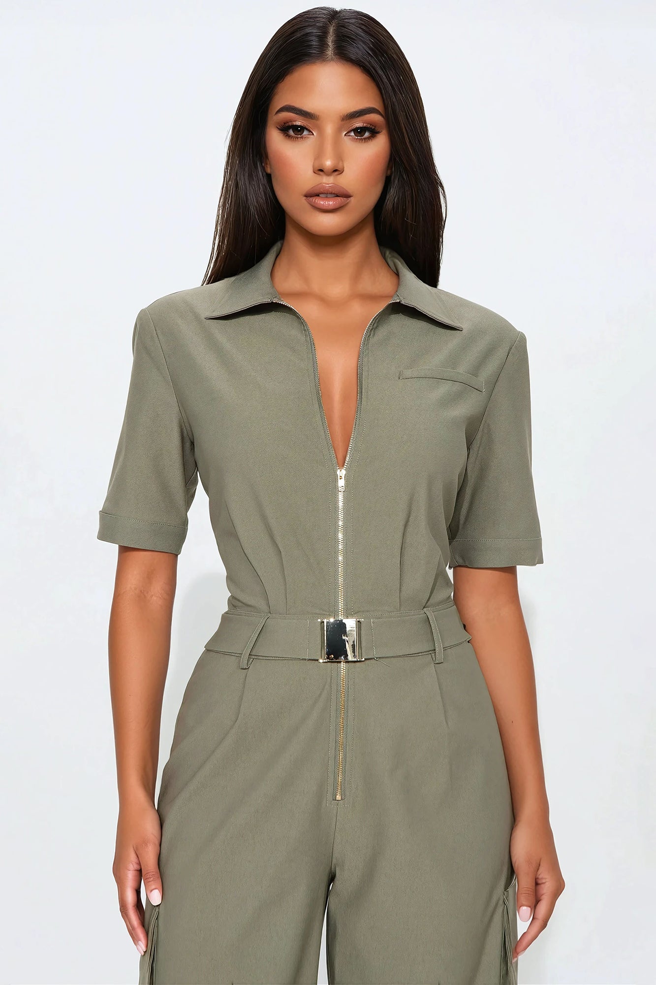 Available In Olive And Mocha. Jumpsuit Collar Zip Front Belted Shoulder Pads Cargo Pockets Wide Leg Slight Stretch Inseam = 33" Self: 63.2% Rayon 31.6% Nylon 5.2% Spandex Imported |