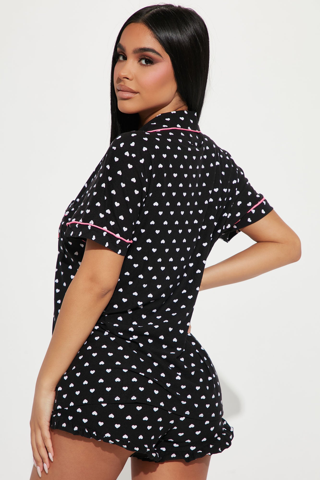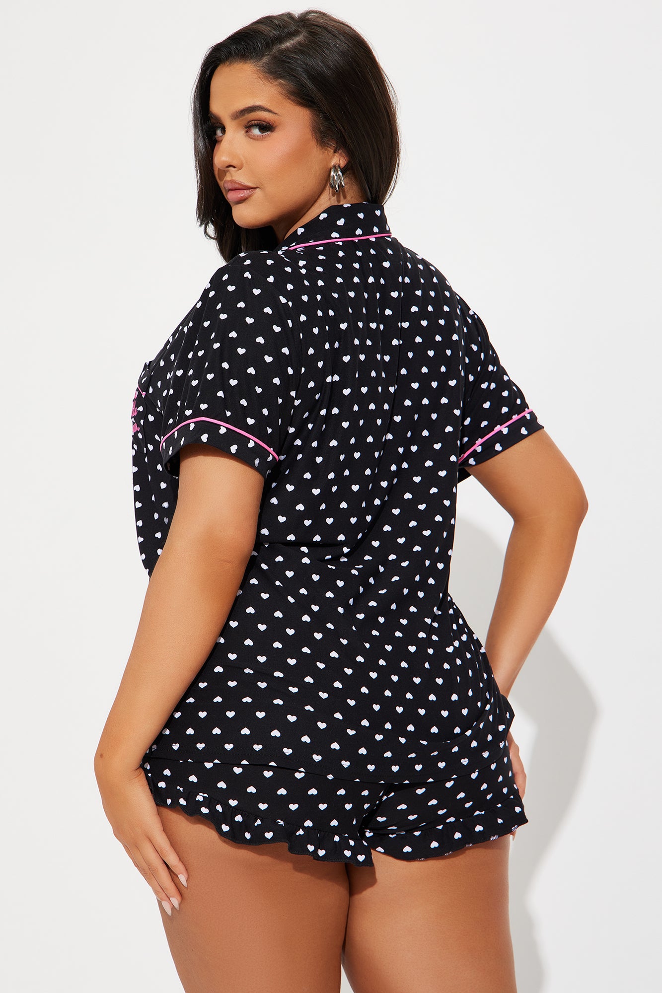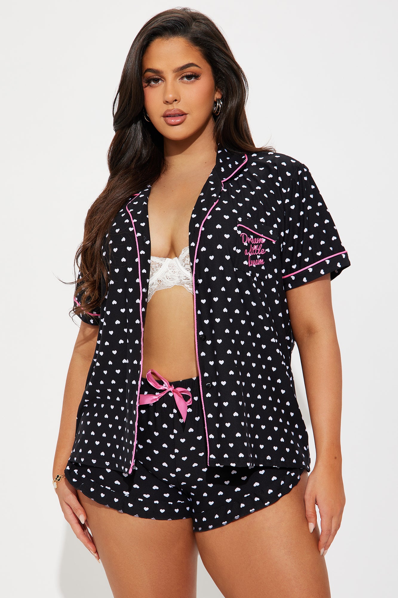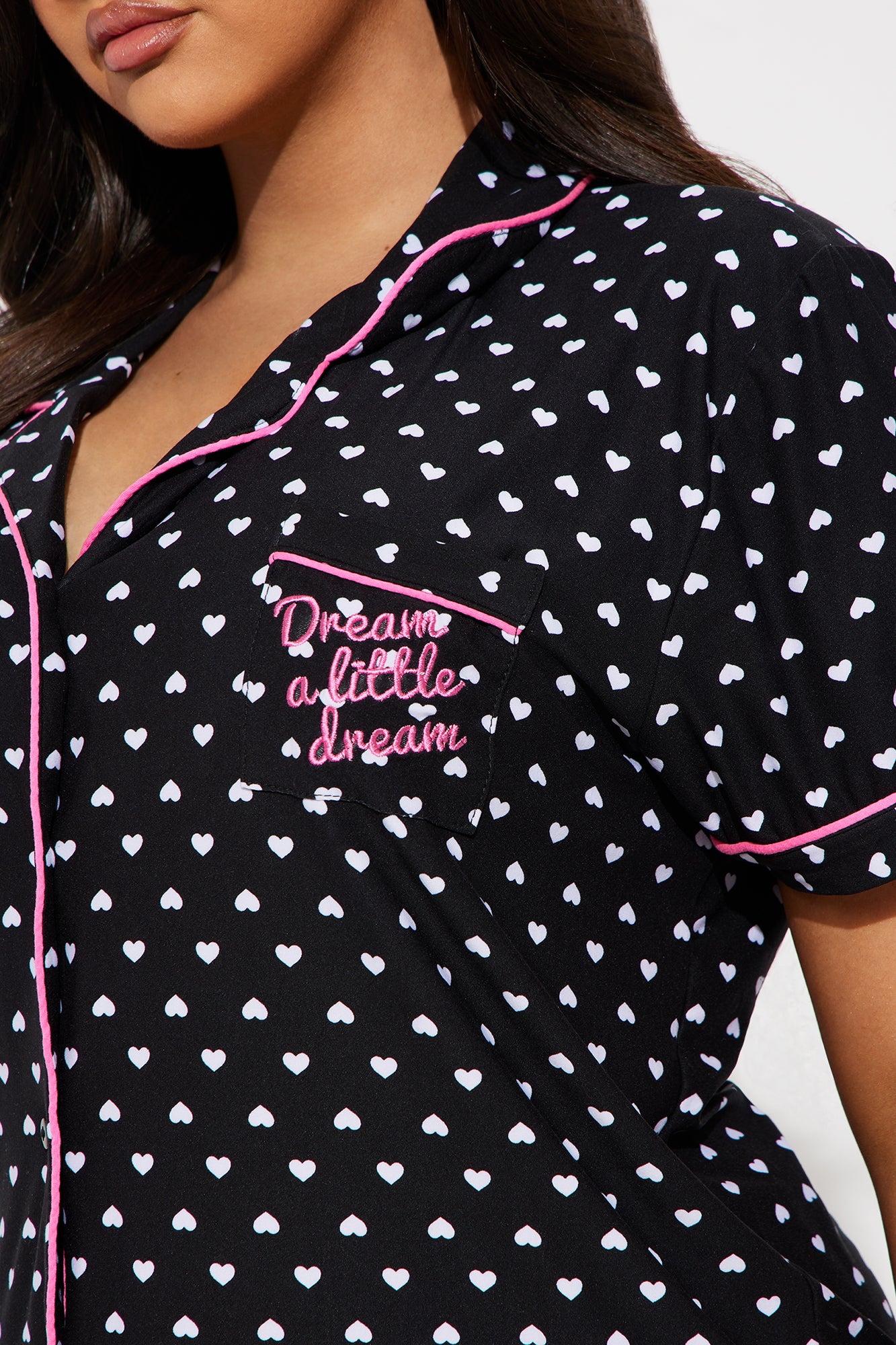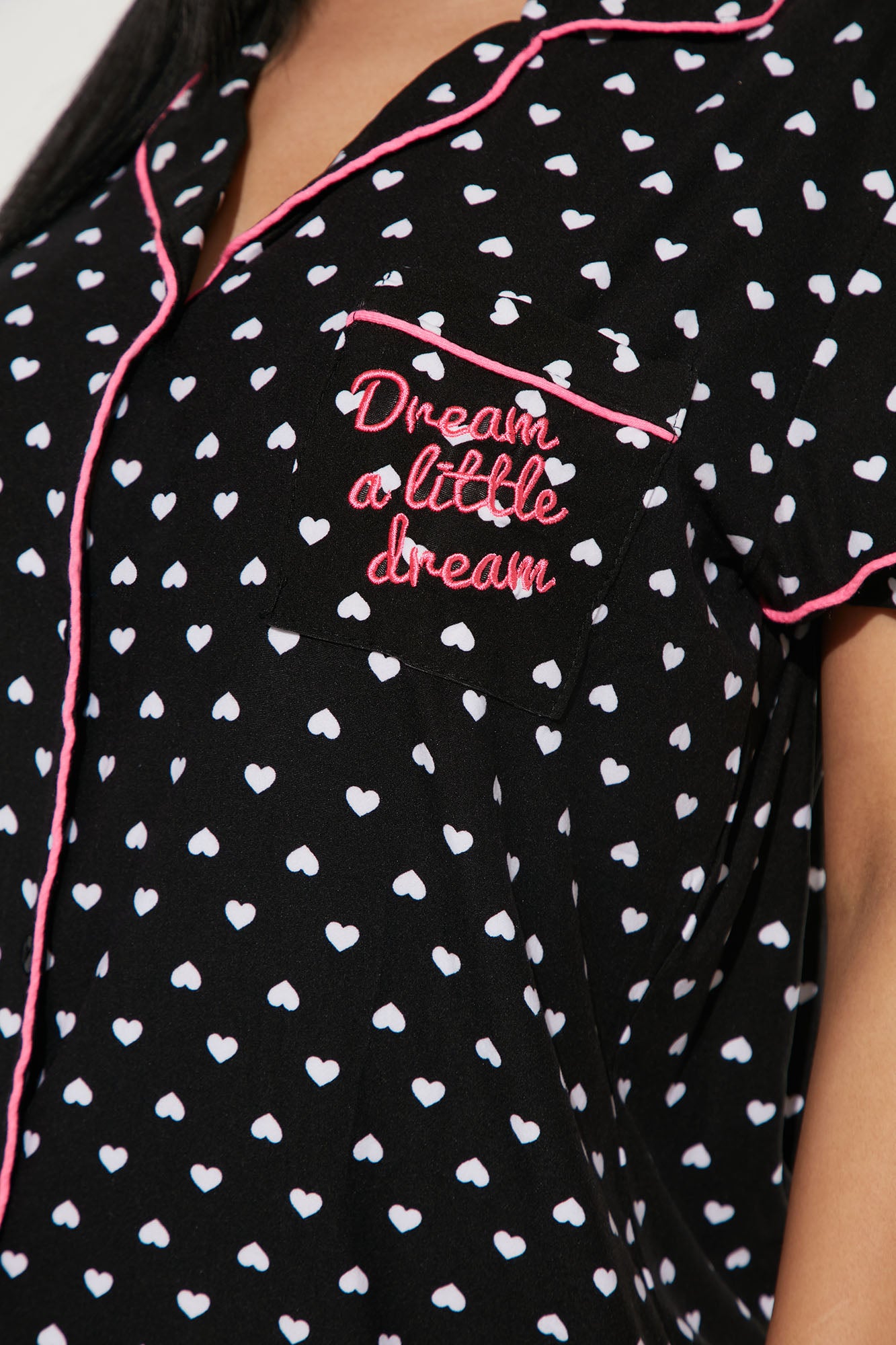 Available In Black/combo. 2 Piece PJ Set Short Sleeve Collared Button Up Top Pocket Embroidery "Dream A Little Dream" Verbiage Full Stretch Elastic Waistband Ruffled Hem And Bow Applique Final Sale Disclaimer: Print Placement May Vary 95% Polyester 5% Spandex Imported |