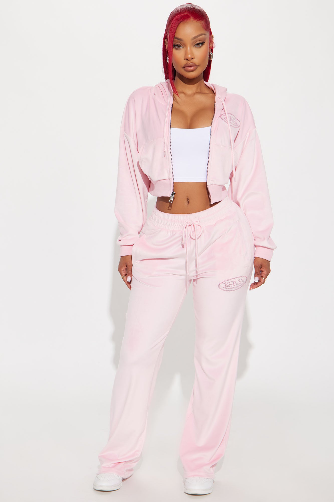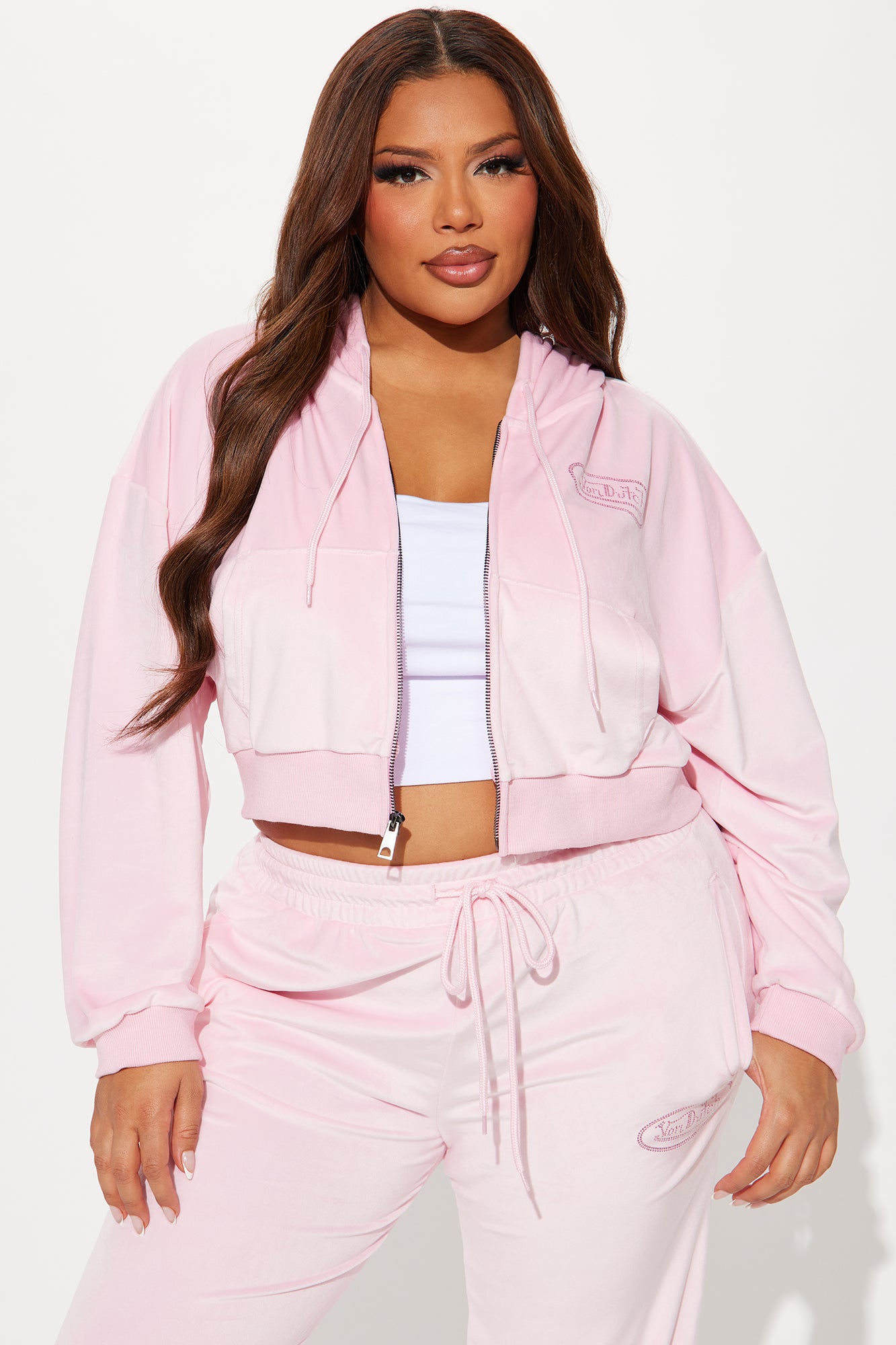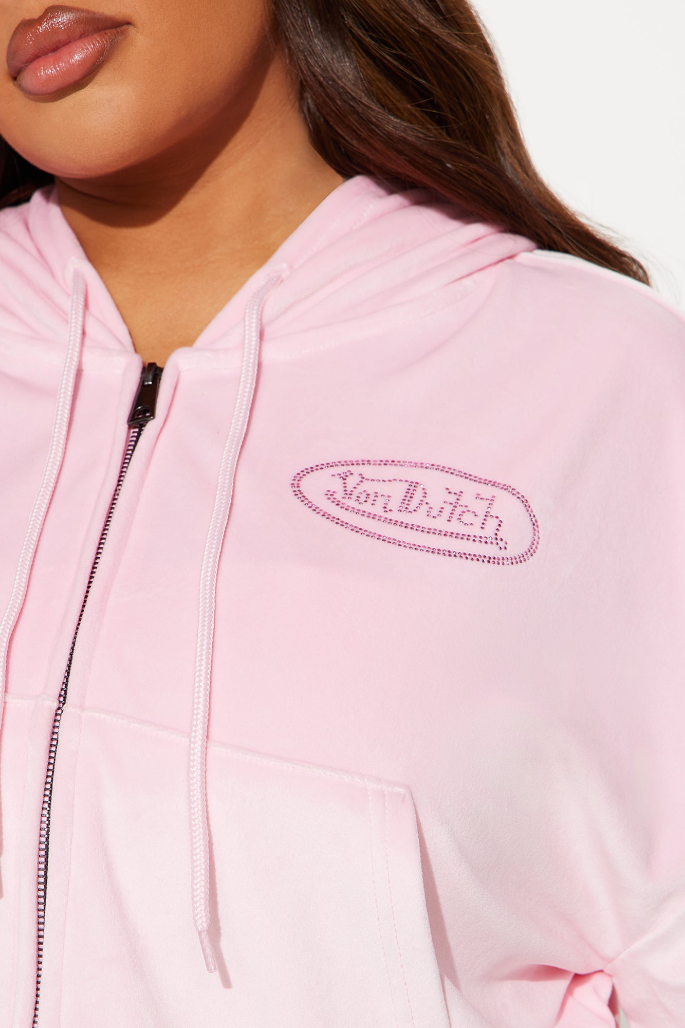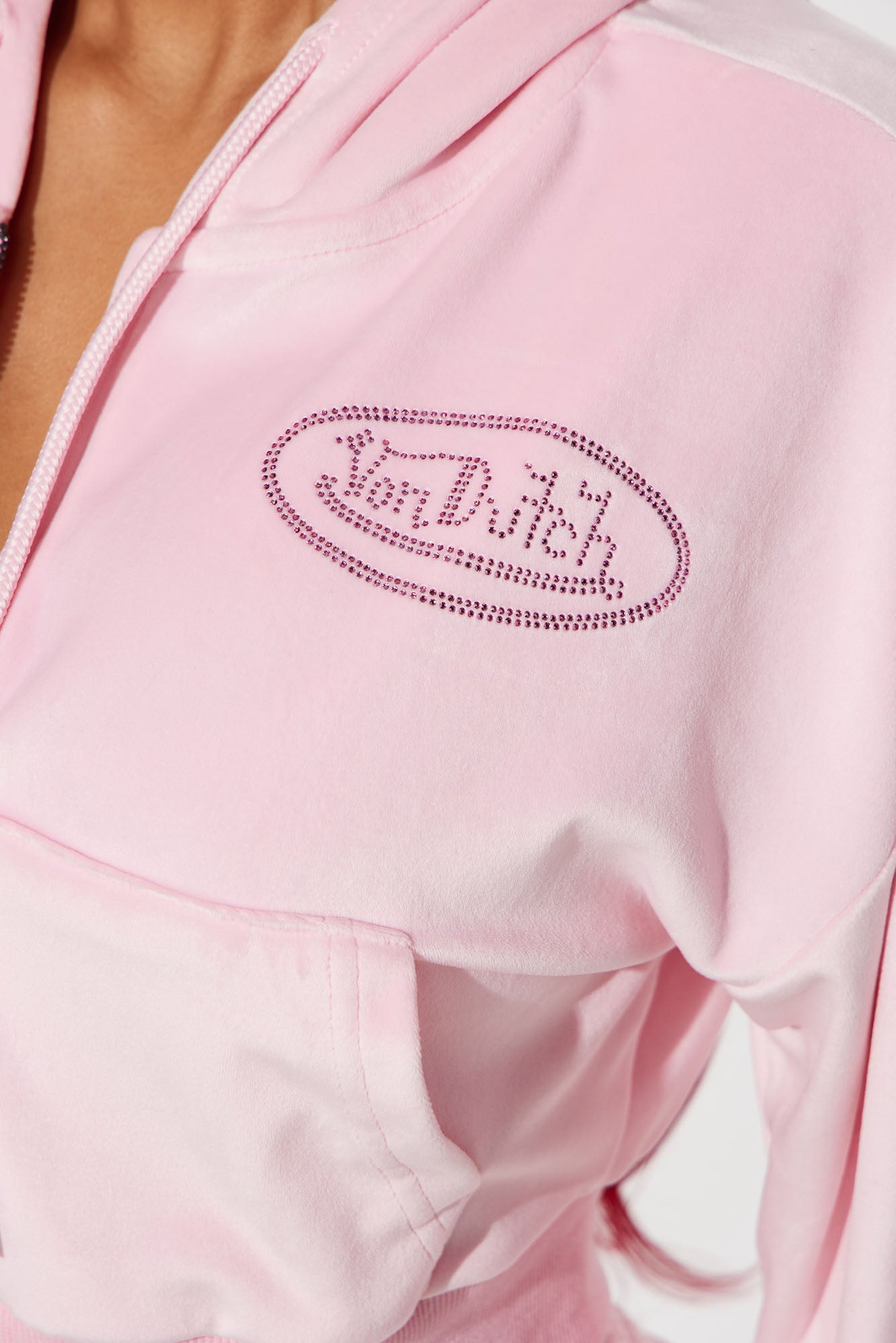 Available In Pink. Cropped Hoodie Zip Front Drawstrings Rhinestone Von Dutch Logo Pair To "Von Dutch Velour Rhinestone Wide Leg Pant" 95% Polyester , 5% Spandex Imported |