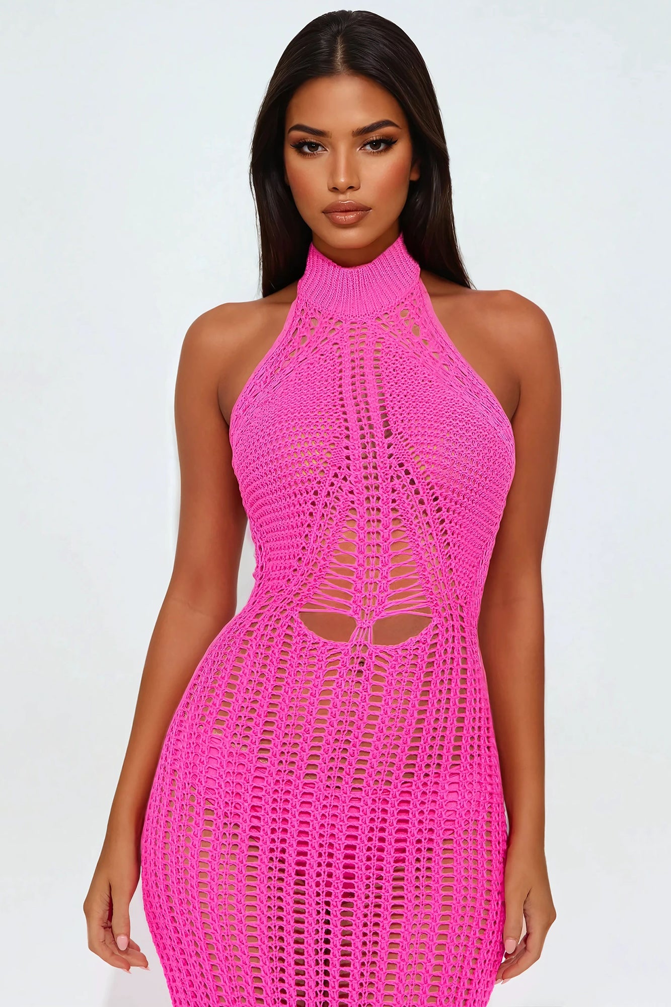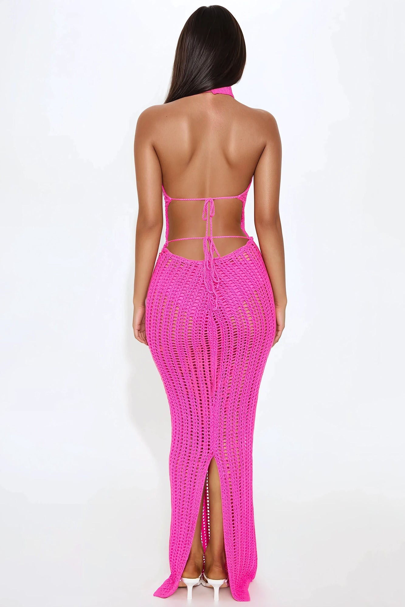 Available In Hot Pink. Crochet Maxi Dress Halter High Neckline Cut Out Backless Tie Back Stretch Self:100%Acrylic Imported |