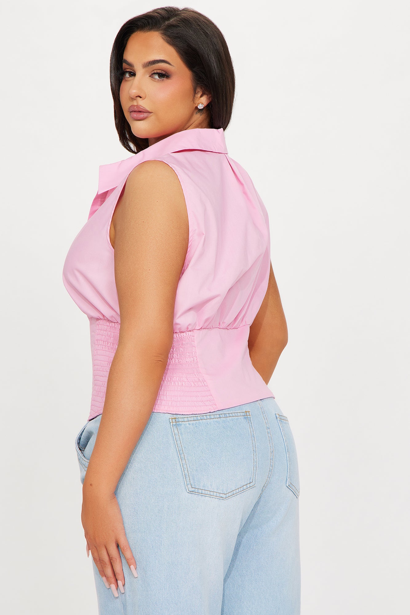 Available In White, Black, And Pink. Corset Top Sleeveless Boning Detail Collar Button Down Smocked Side Cropped Non Stretch 80% Polyester 20% Cotton Imported |