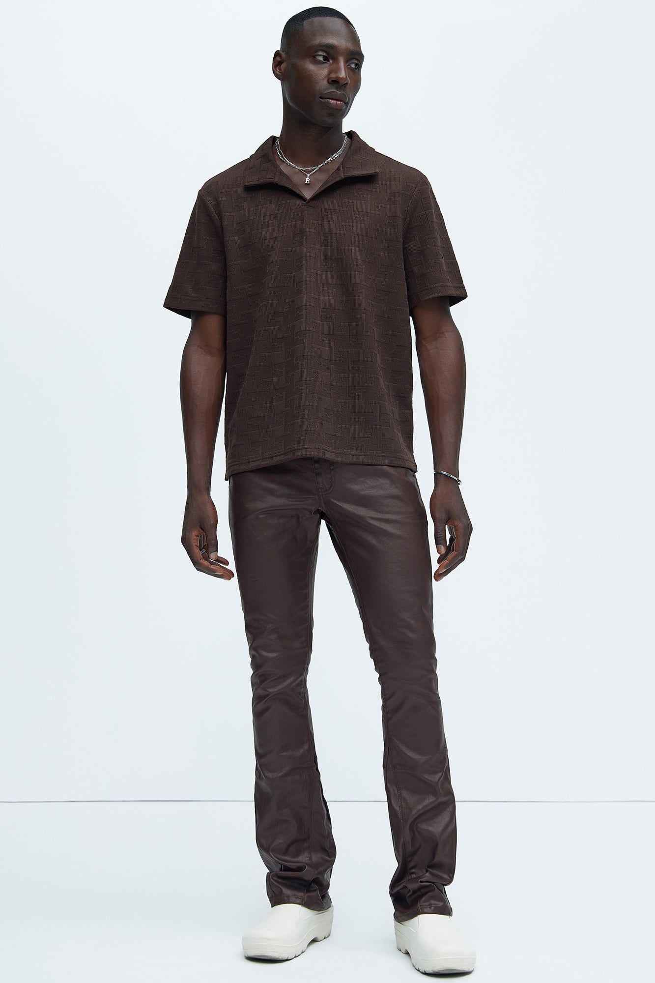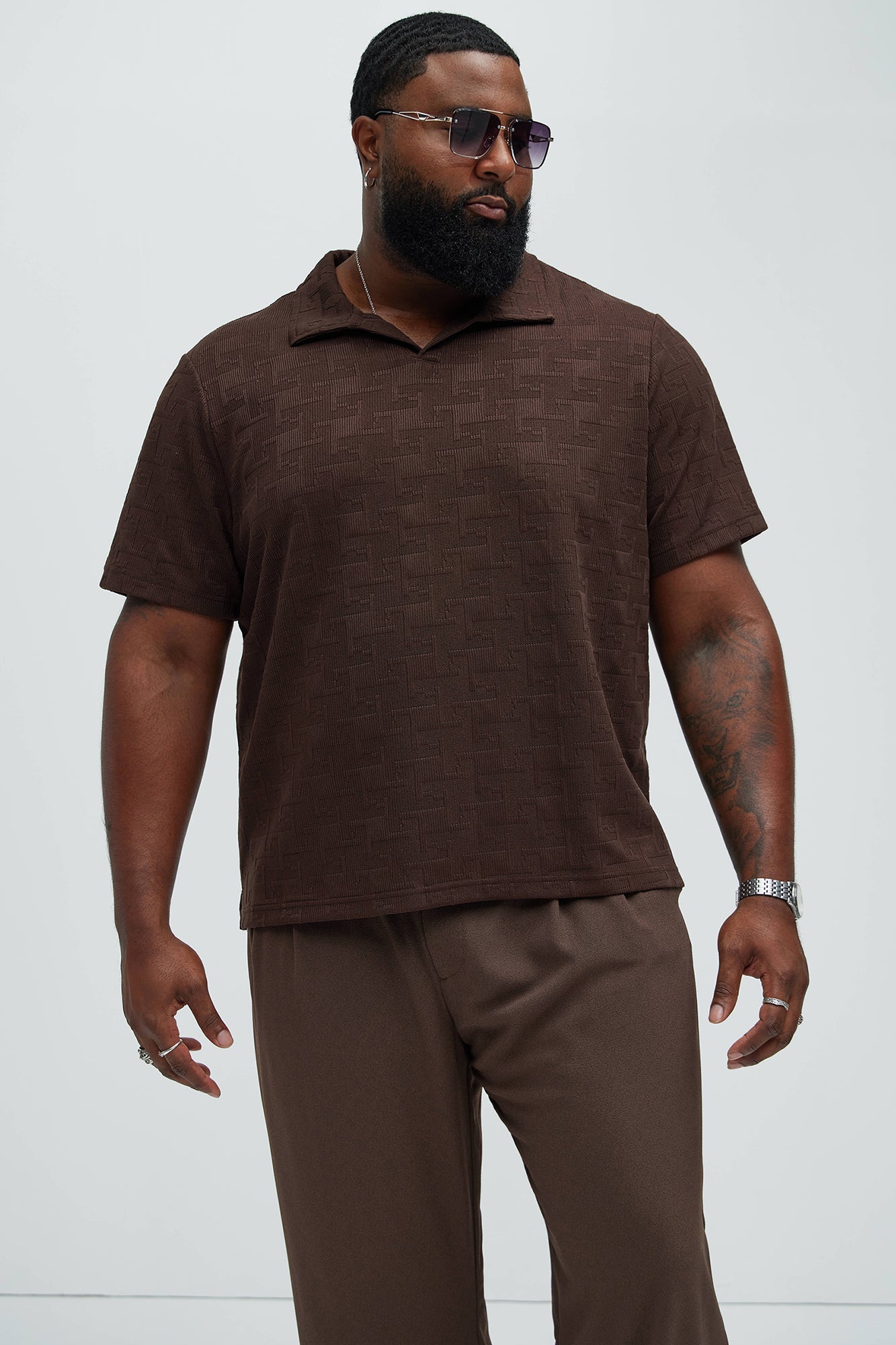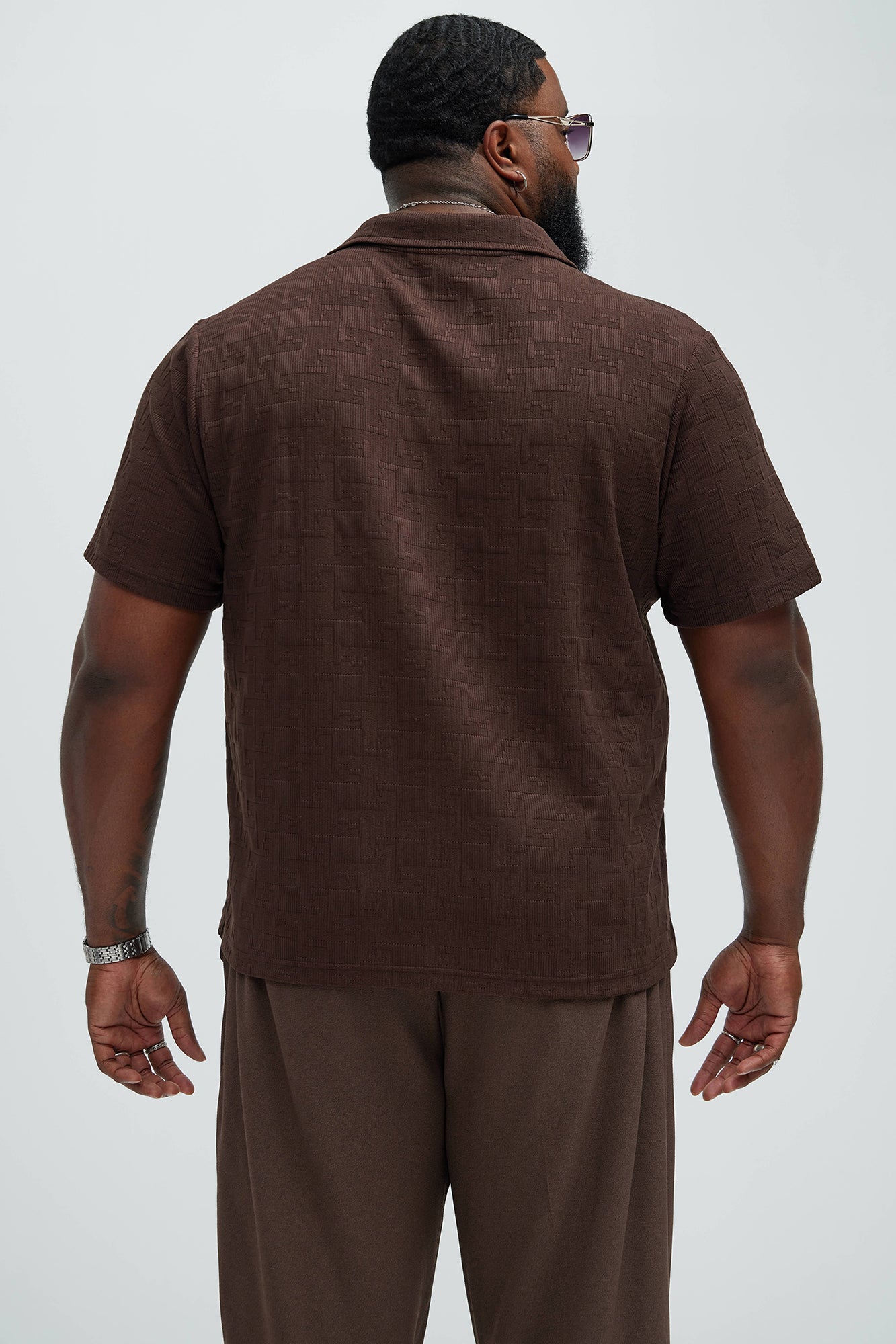 Available In Brown. Fold Down Collar Short Sleeve Bottom Side Slit 97% Polyester 3% Spandex Imported |