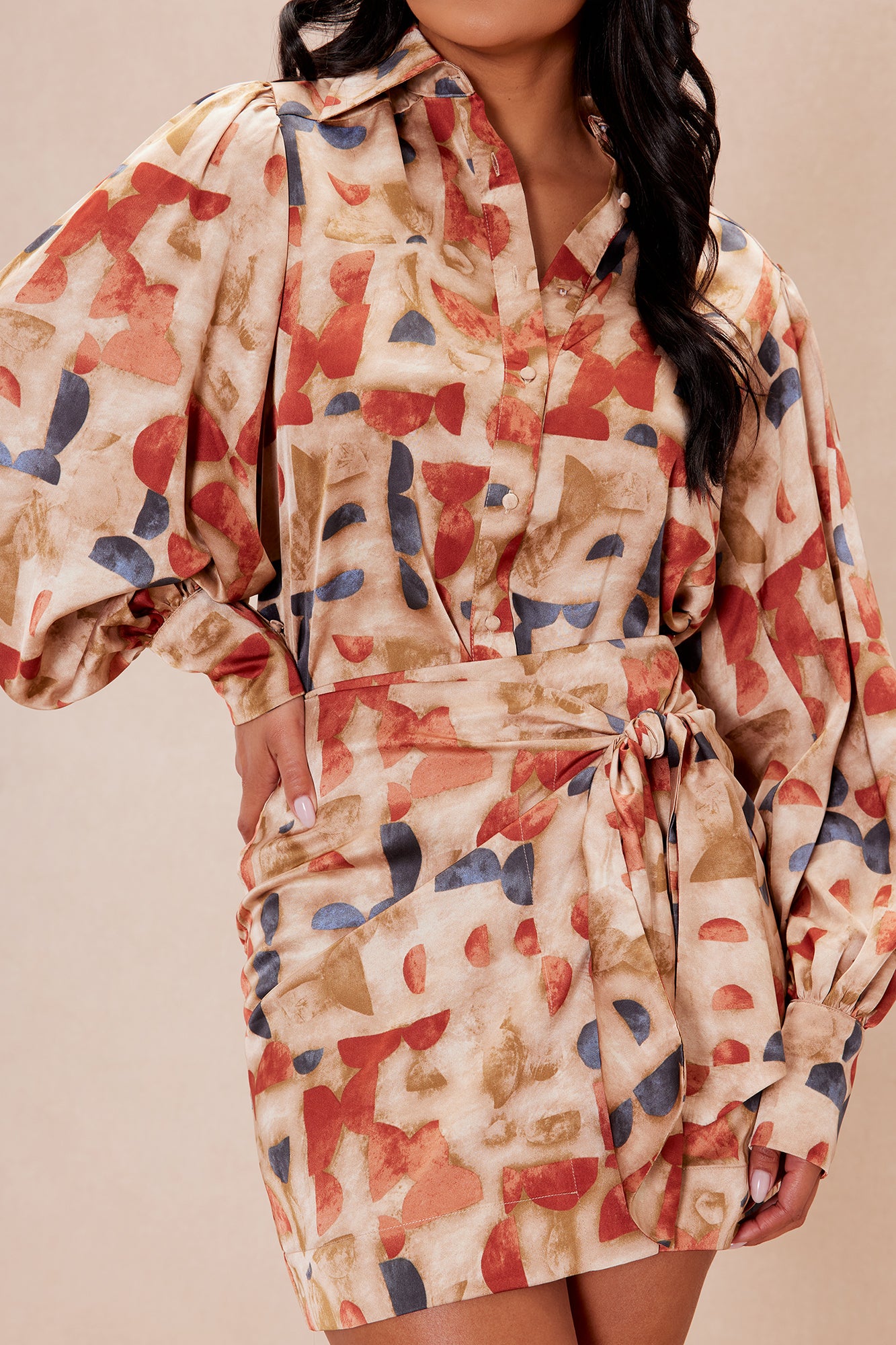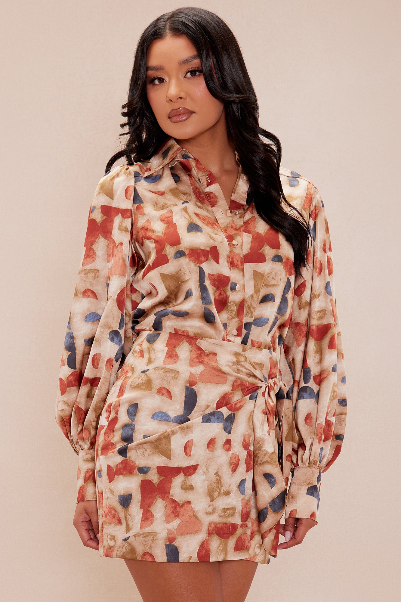 Available In Taupe/combo. Satin Shirt Collar Long Sleeve Pleated Button Closure Satin Skirt, Tie Waist Back Zipper Closure Abstract Print Non Stretch Inseam = 17'' Disclaimer: Print Placement May Vary Self: 100% Polyester Lining: 100% Polyester Imported |